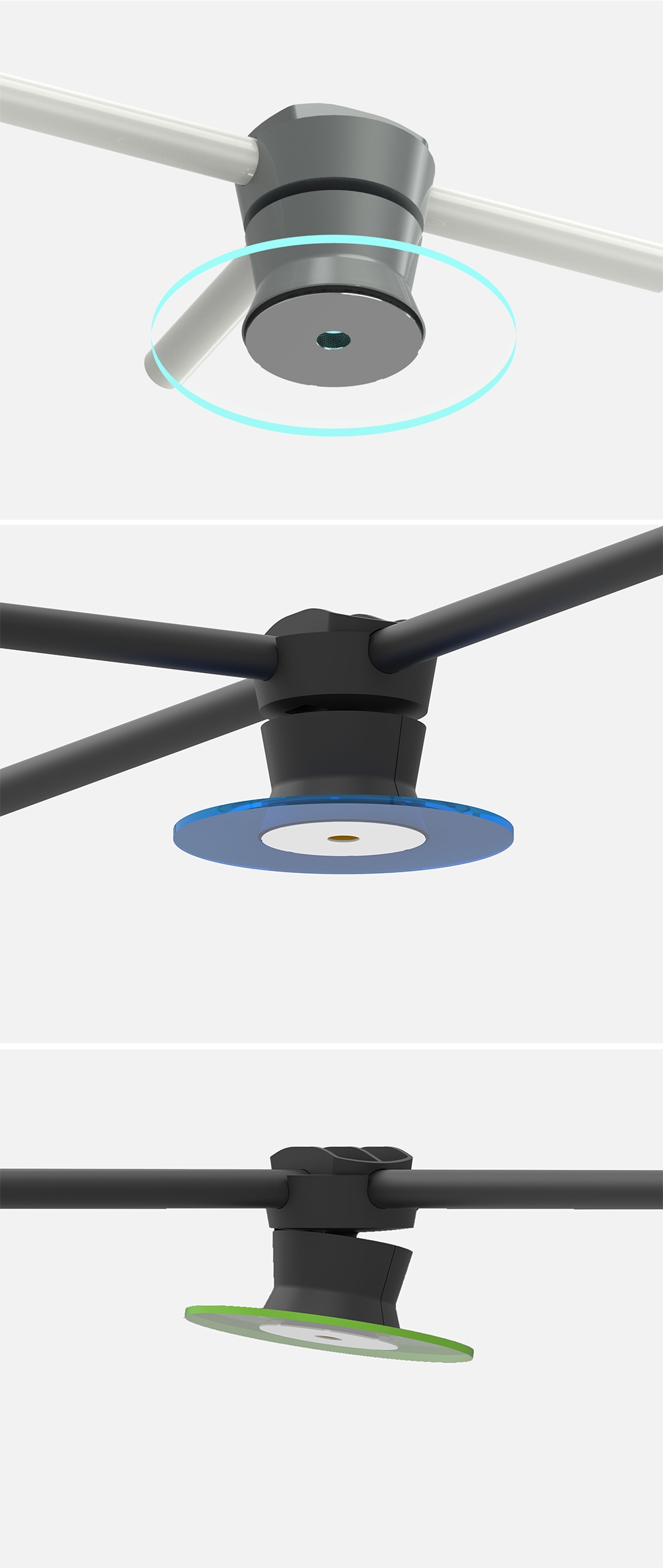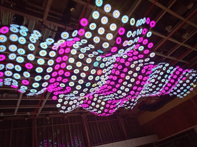 This dynamism in the form of a continually changing visual spectrum. A highly reflective mirrored finish ring reflects the coming and going, eating and drinking that goes on under it, while providing 500+ lux at full intensity. Superimposed over this is a layer of saturated light that drenches the space in colored hues.