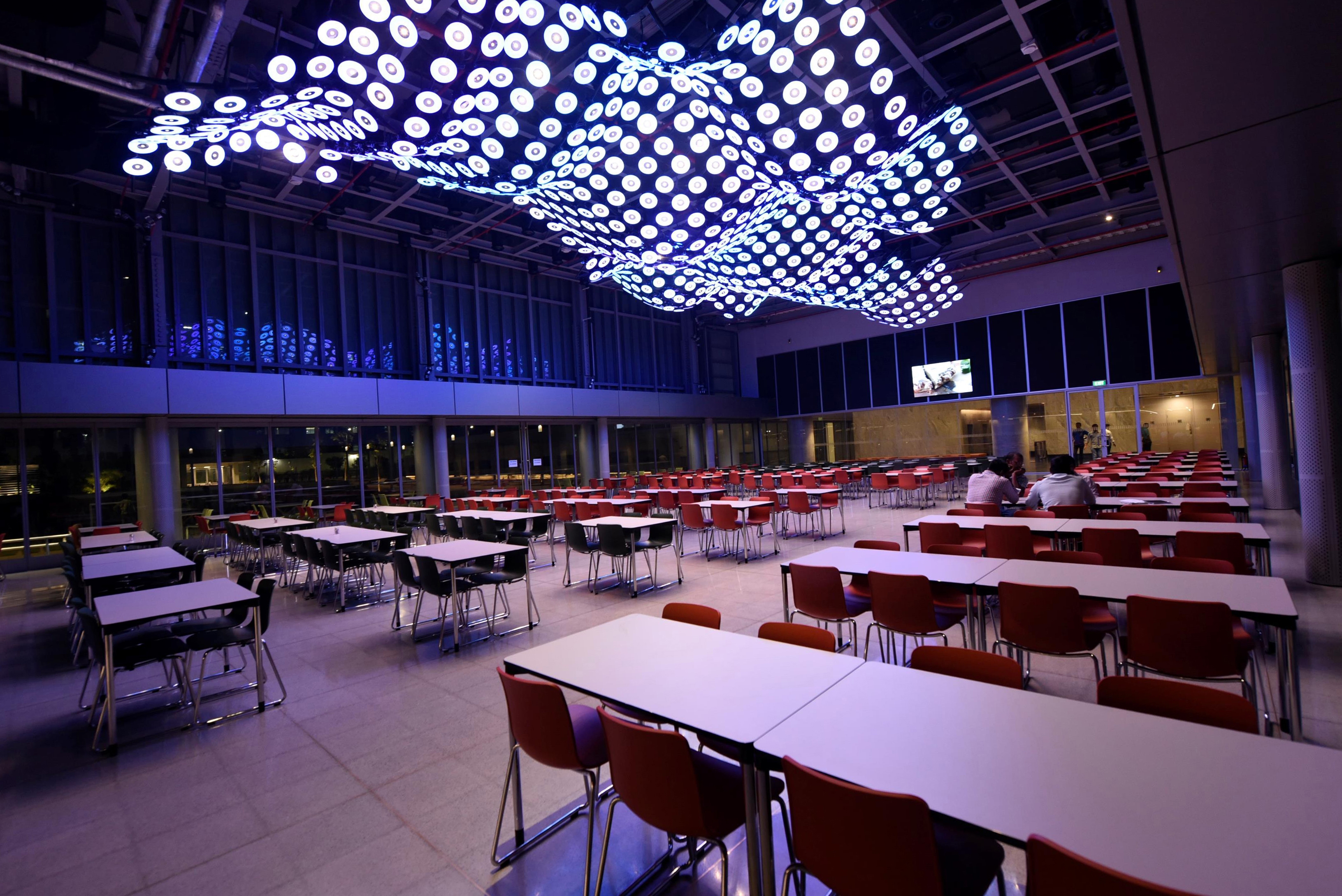 Entry DescriptionInspired by Lord Alfred Tennyson’s poem by the same name, ‘brook’ is a custom-designed, dynamic installation. Floating above the dining space of a large corporate headquarters it makes for an arresting view through the façade and an engaging experience when indoor. Like a brook, the installation flows & ebbs, turns & curves; and even though people come & people go, the brook’s movement remains perpetual.