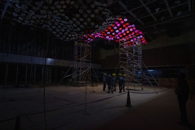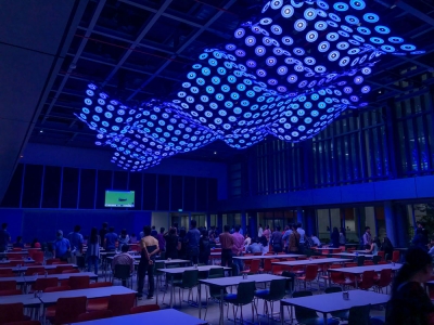 The installation is composed of nearly 800 light fixtures, weighing 17 tons, spread over 1500 sq. ft., suspended mid-air at 17’ above floor.