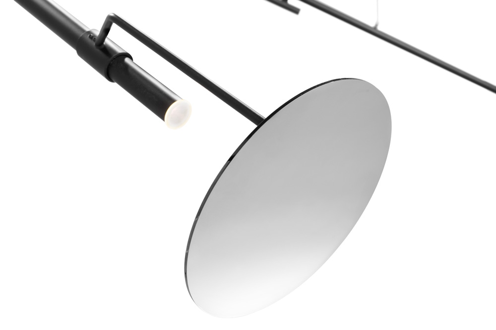 Designed to occupy the environment, the lamp is designed as an aerial and light structure in precarious balance appearance, suspended in the space frayed in oblong elements, with reflective shiny stainless steel discs terminals connected to each other researching for