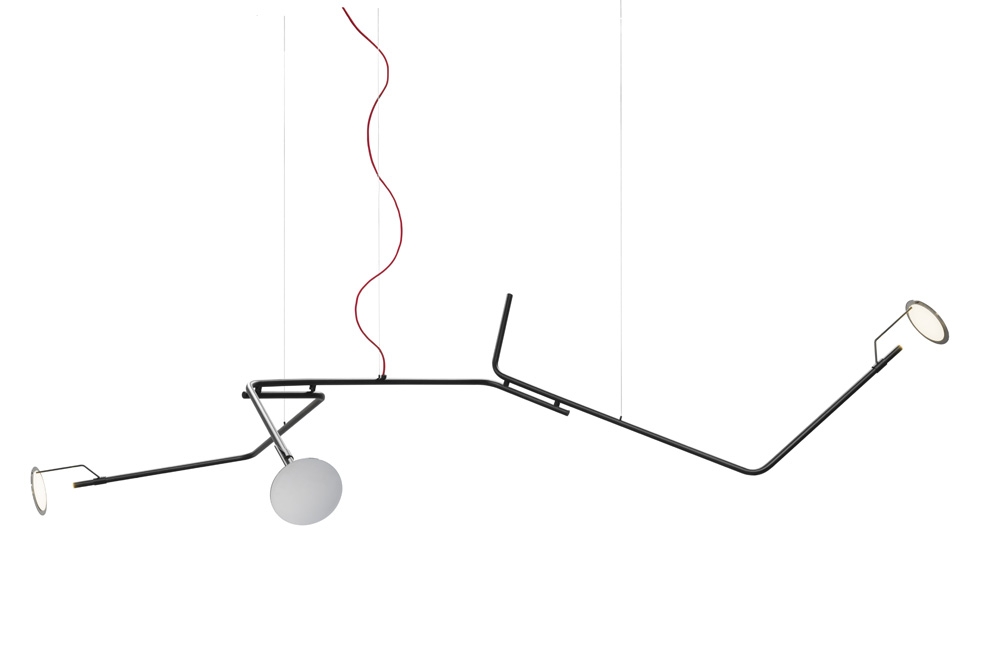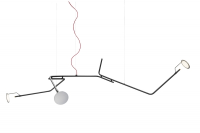 The lamp is composed of three bent metal tubular elements equal to each other and connected asymmetrically to each other to form a single articulated structure suspended through invisible metal cables, with reflective terminal in circular polished stainless steel. The power cord is instead highlighted by the red fabric cover that becomes part of the spatial configuration.