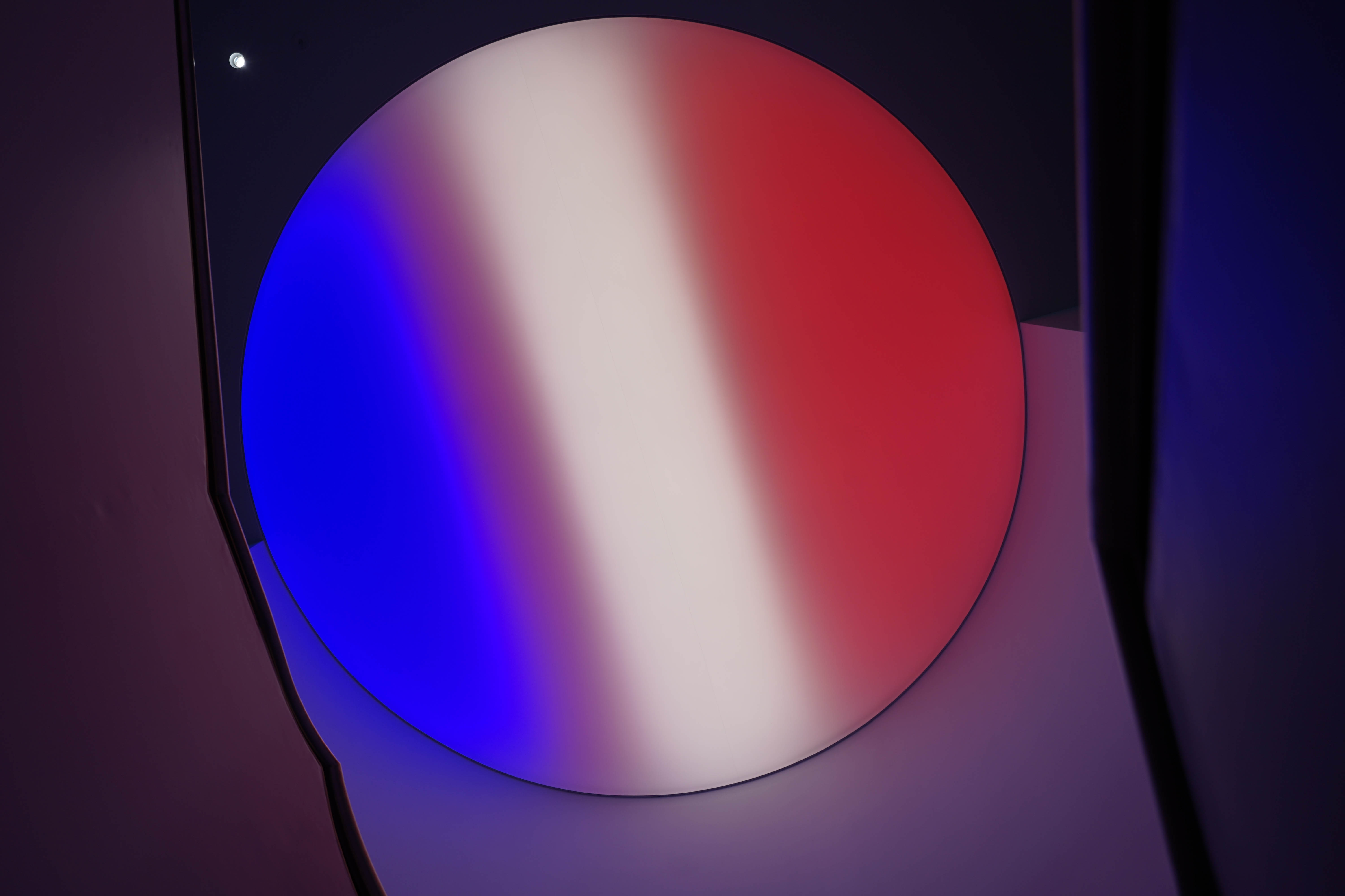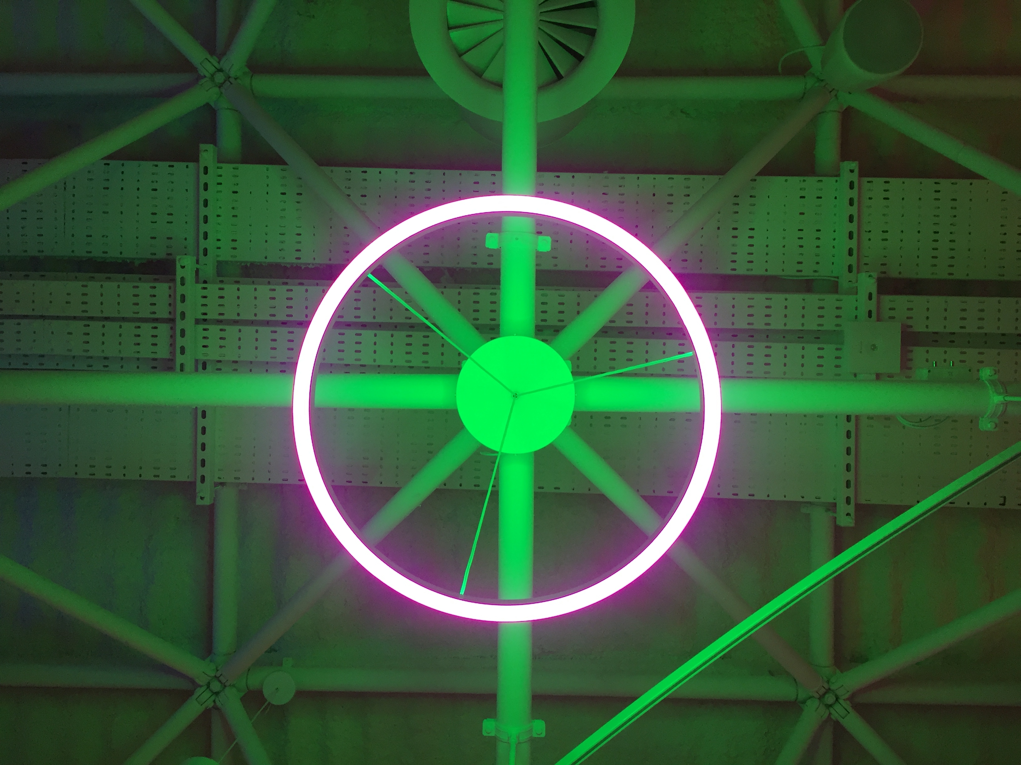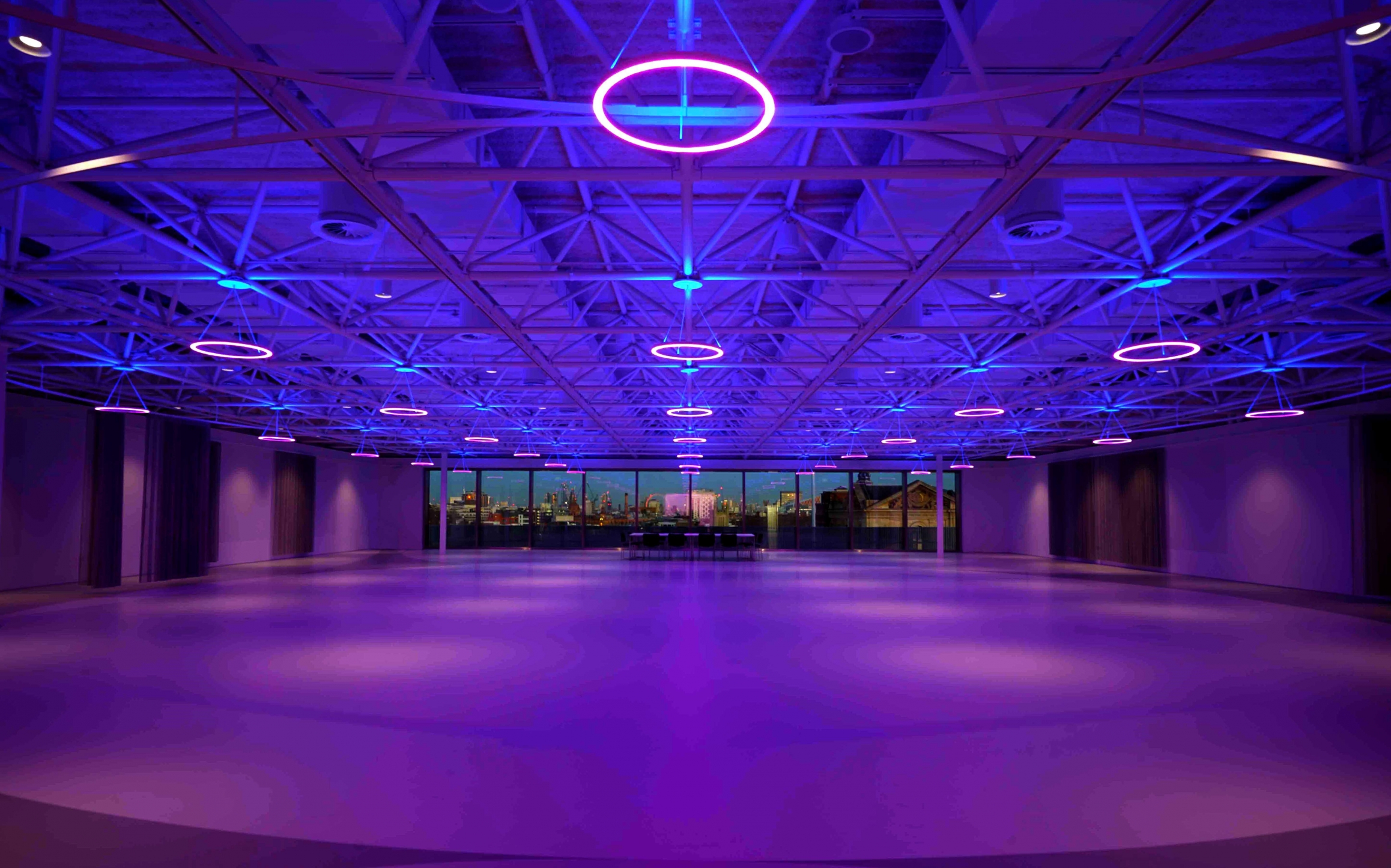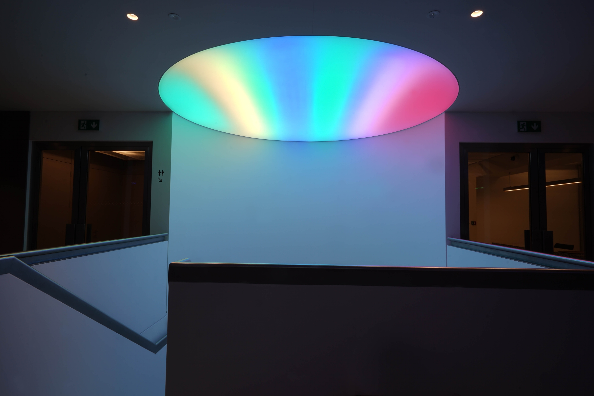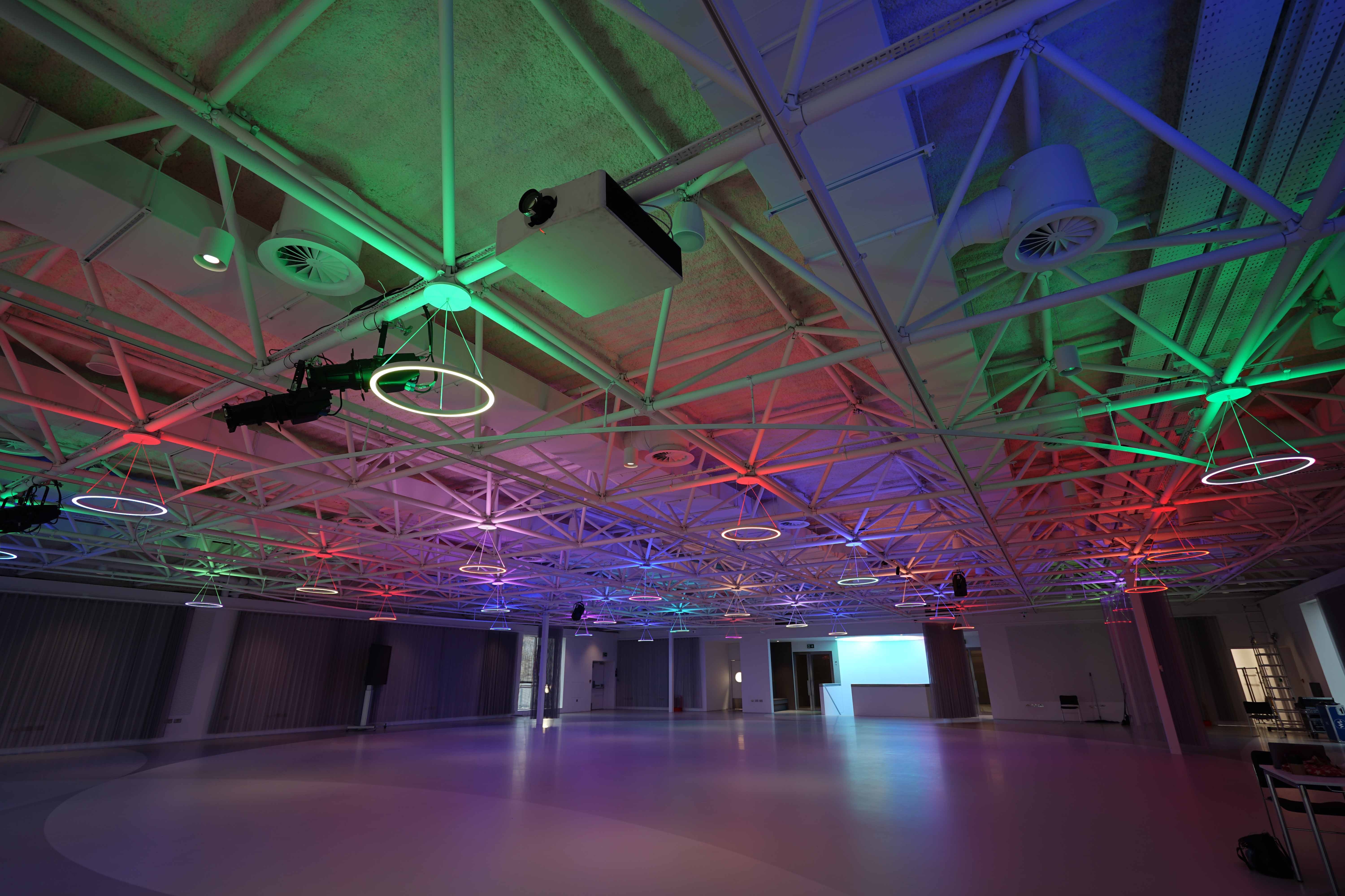 On level 5 the circular pendants are more flexible: Their up and down light can be different. A large circular back lit panel over the stairs connecting the levels creates wonderful patterns or plain color to match the theme of the event.