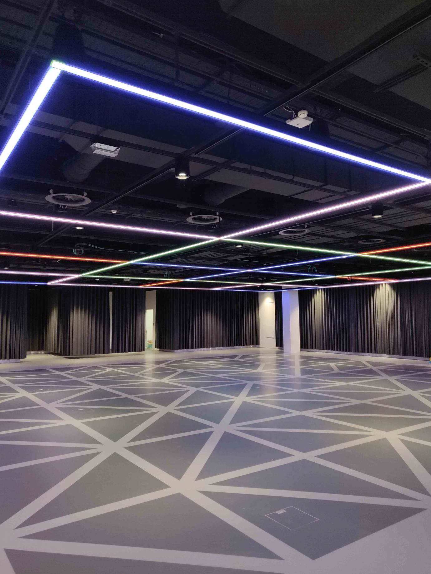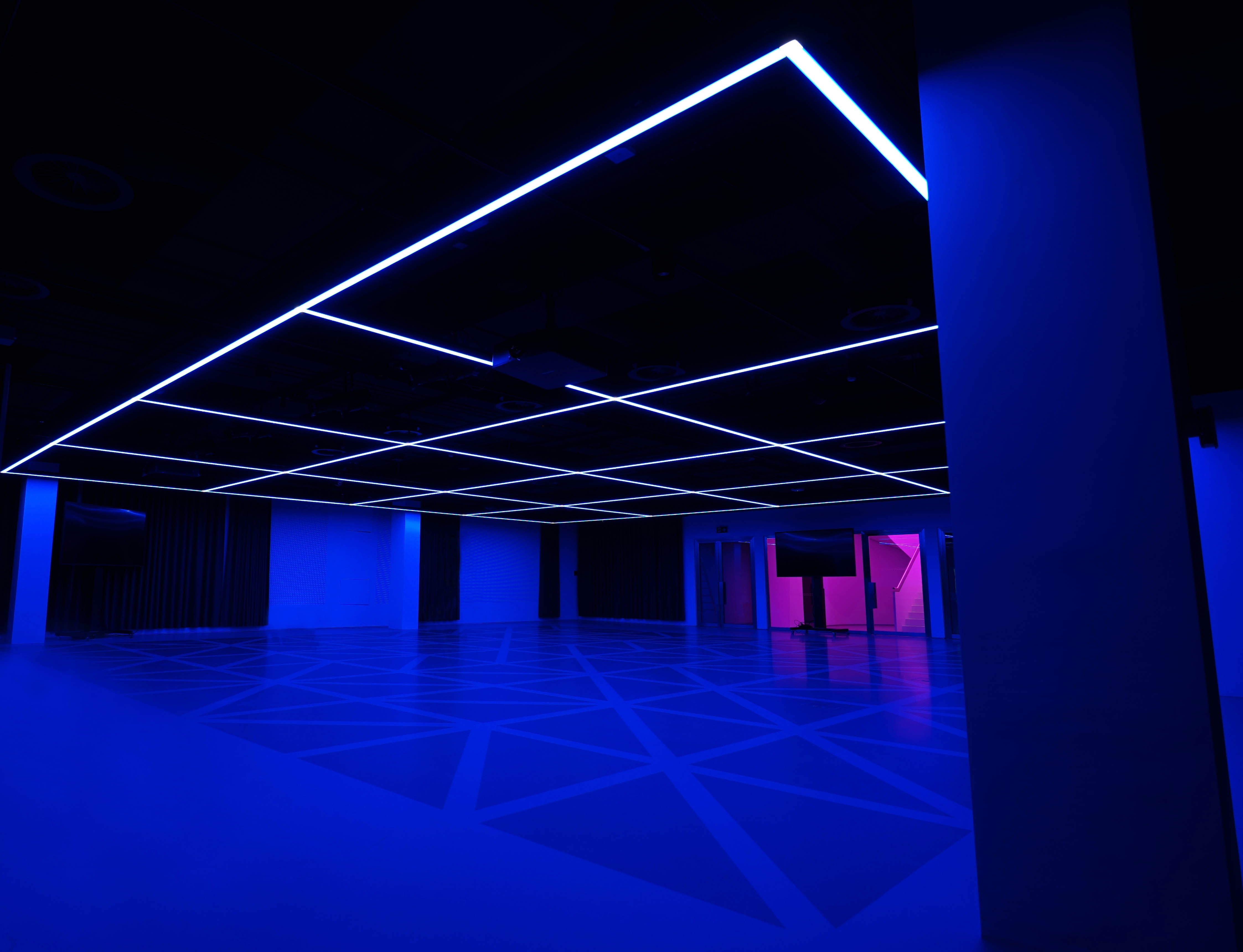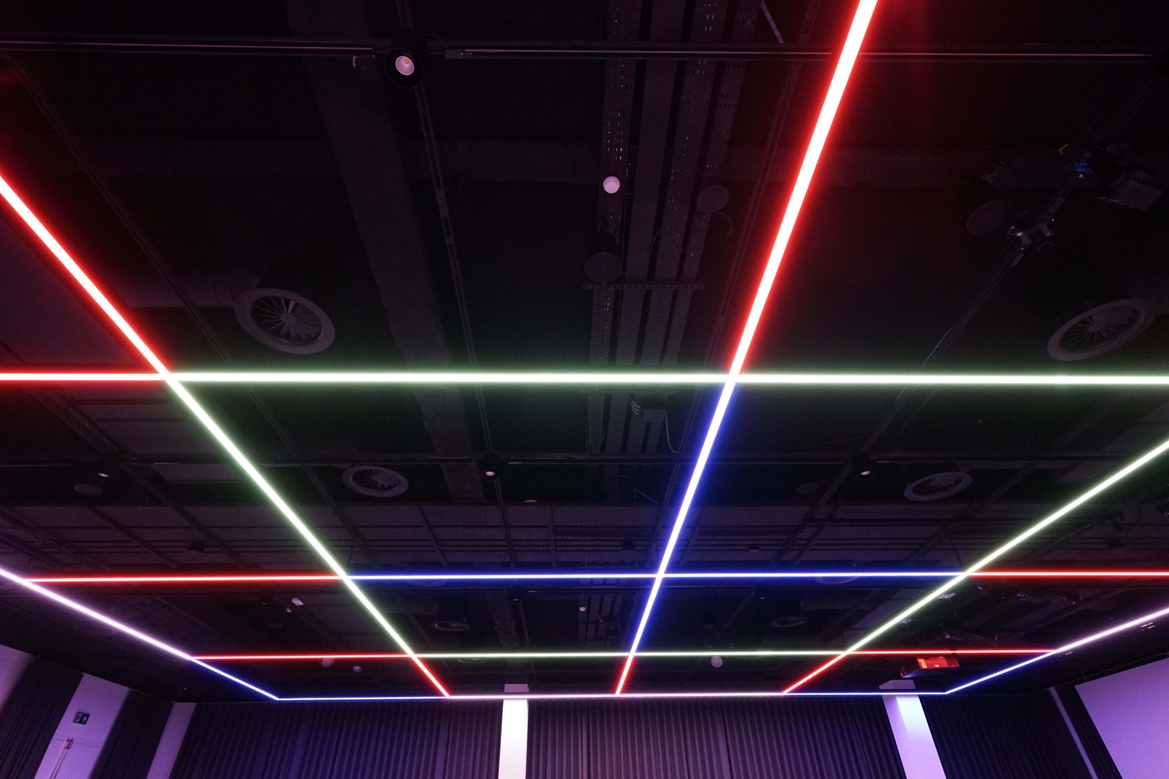 The custom-made luminaires fit the minimalistic style: On level 4 a grid of linear lights that can be any colour, can ripple, make moving patterns or provide functional white light of any shade.