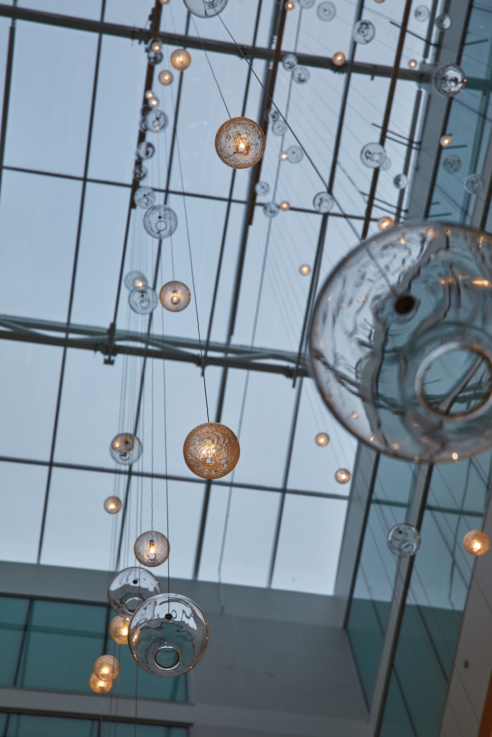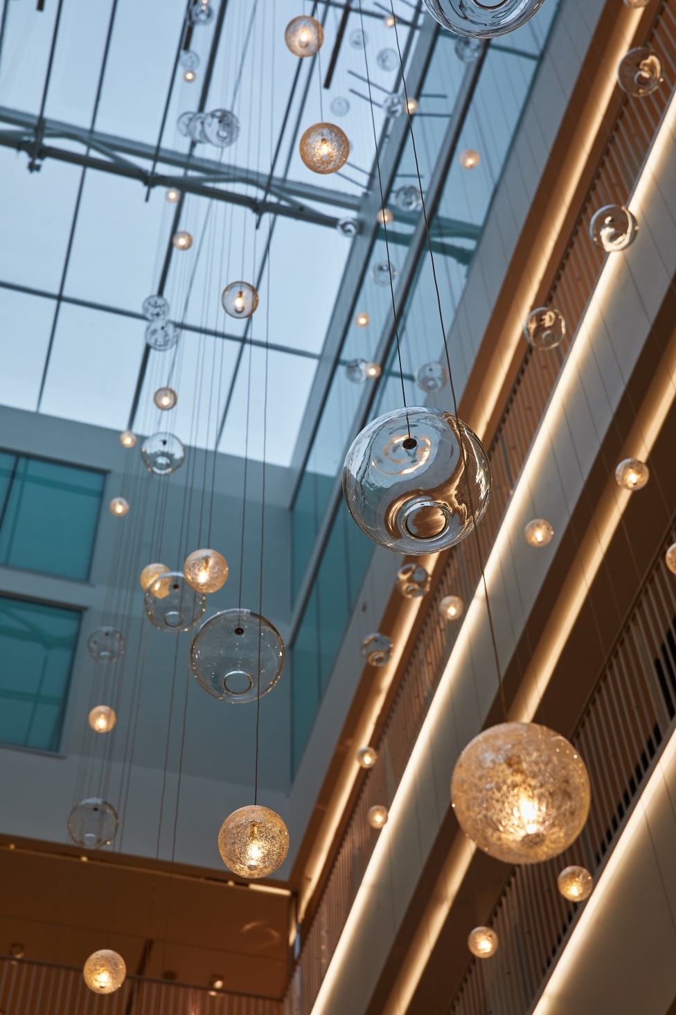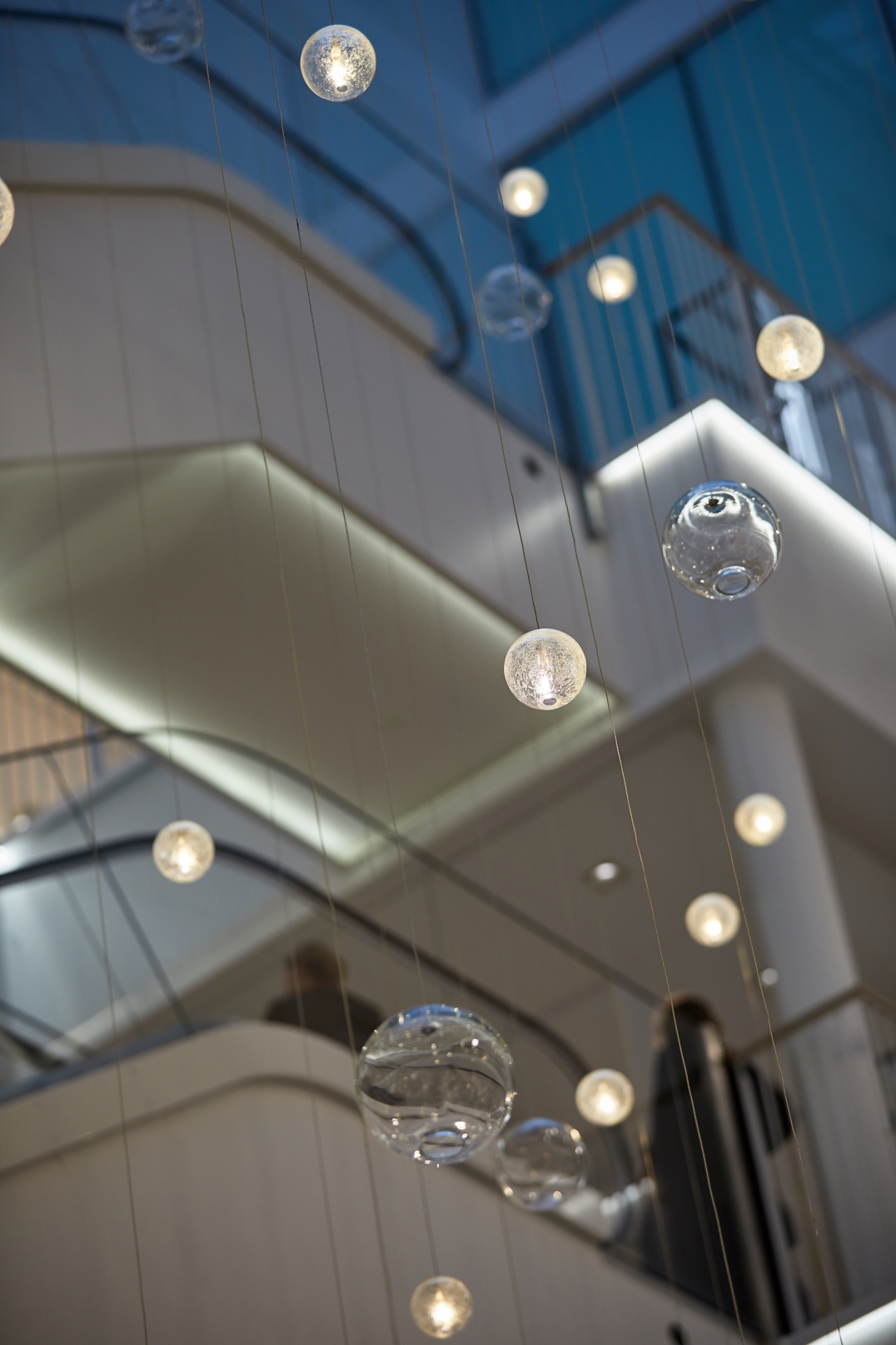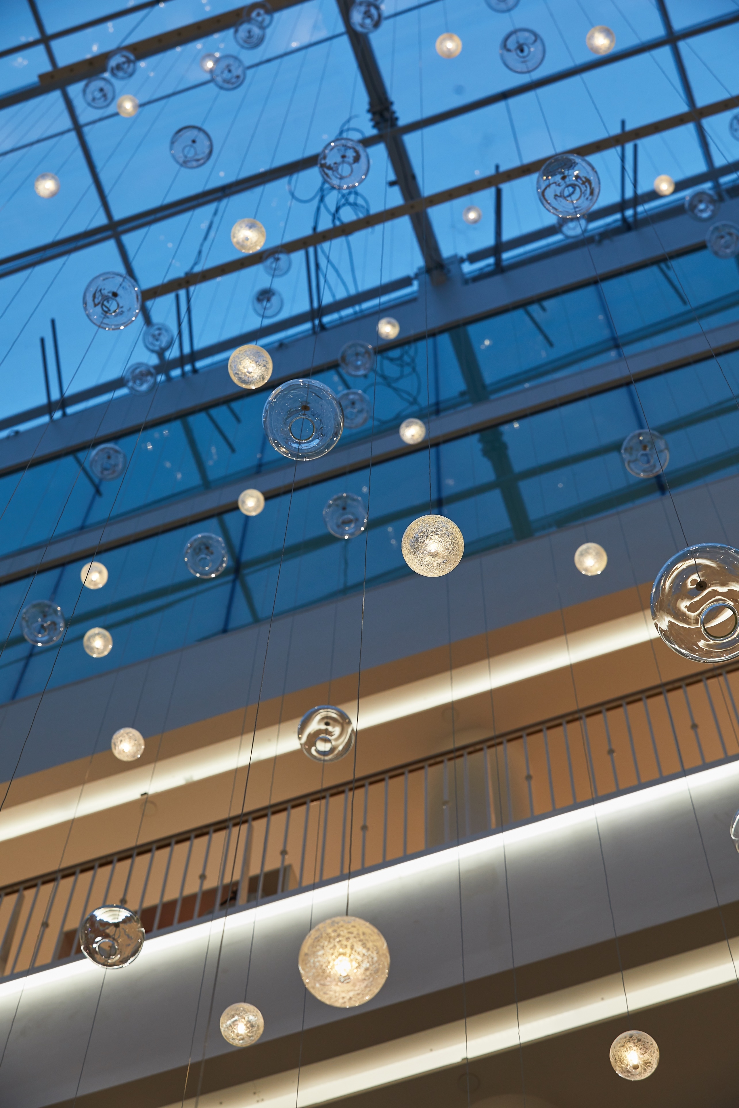 The chandelier extends from level 6 down to level 1 and fills the atrium with handmade glass balls with air bubbles with and without light.