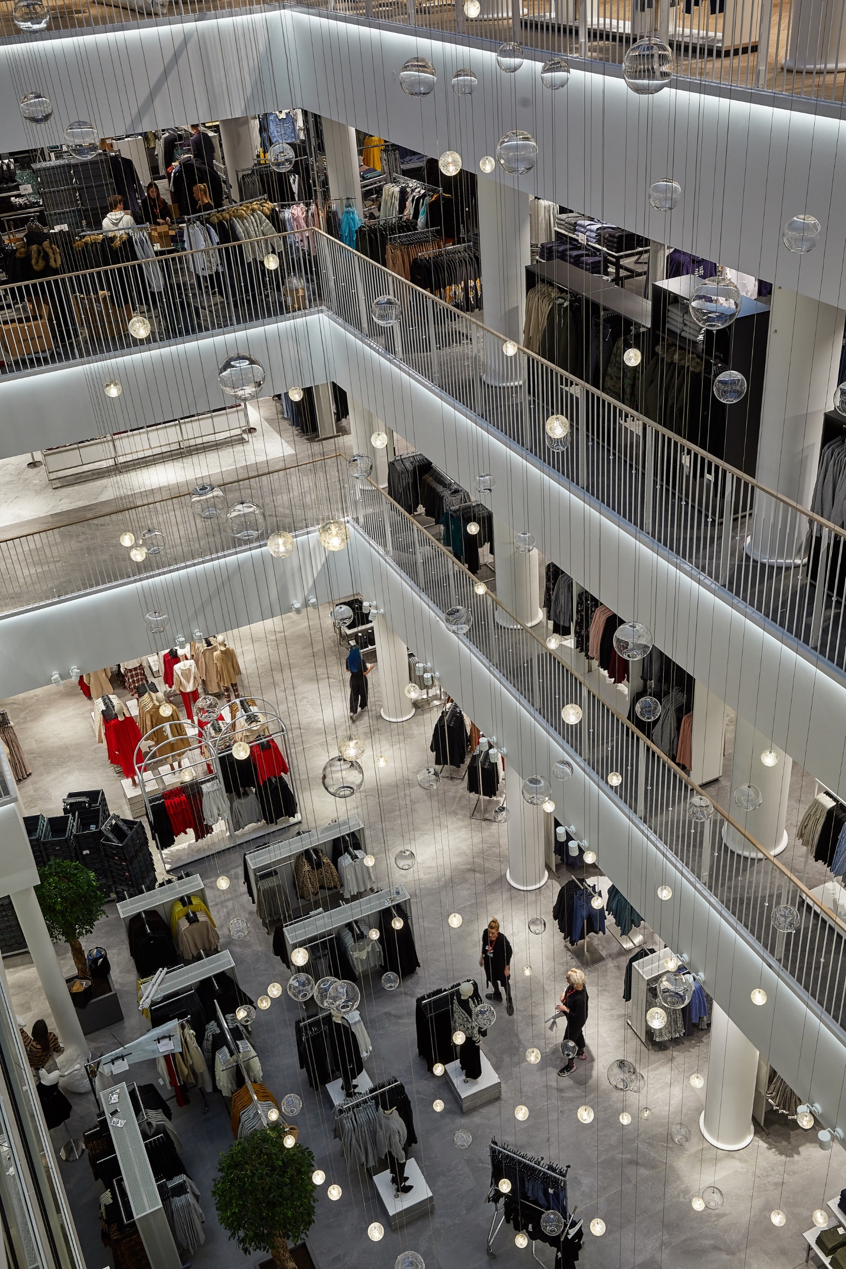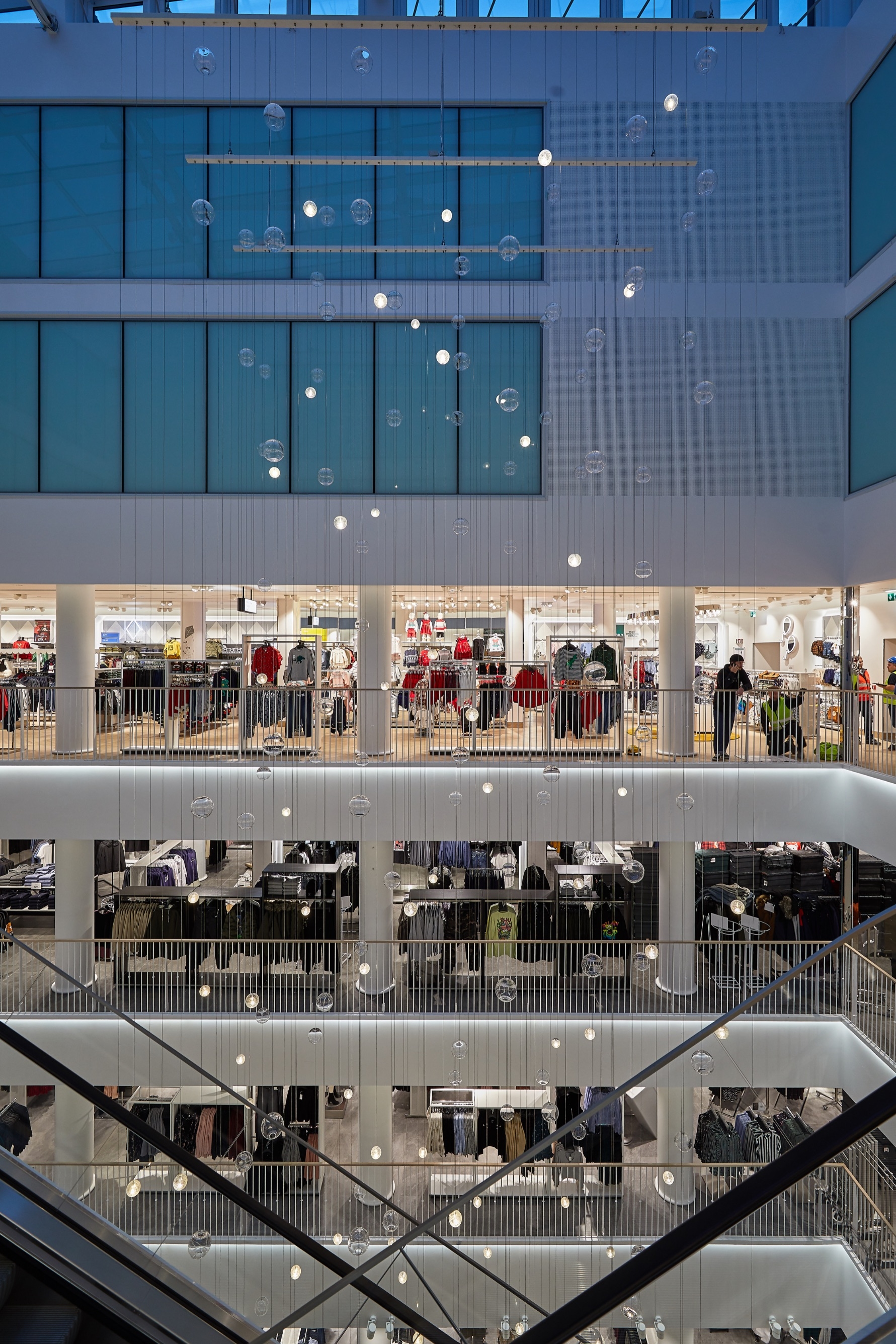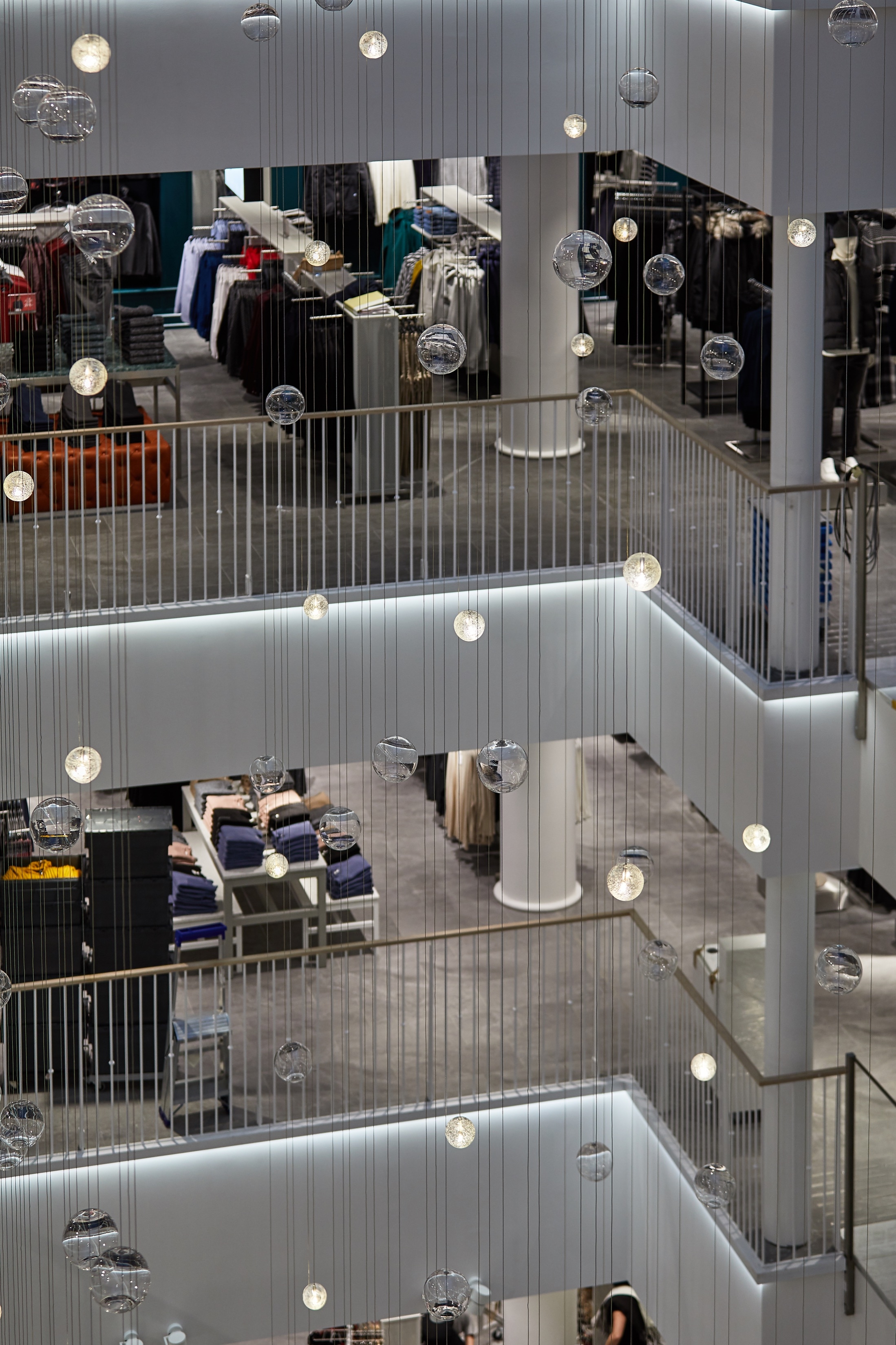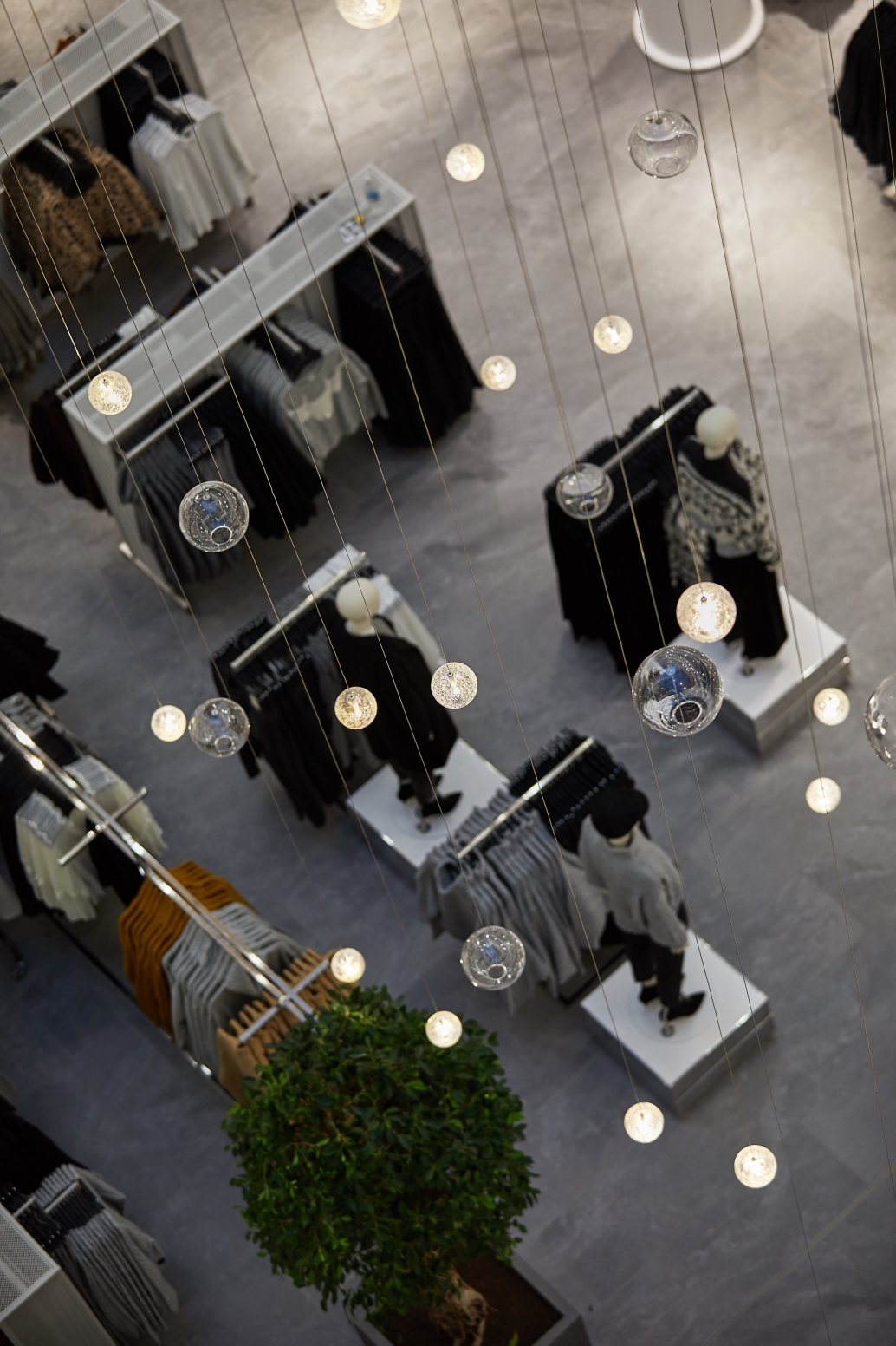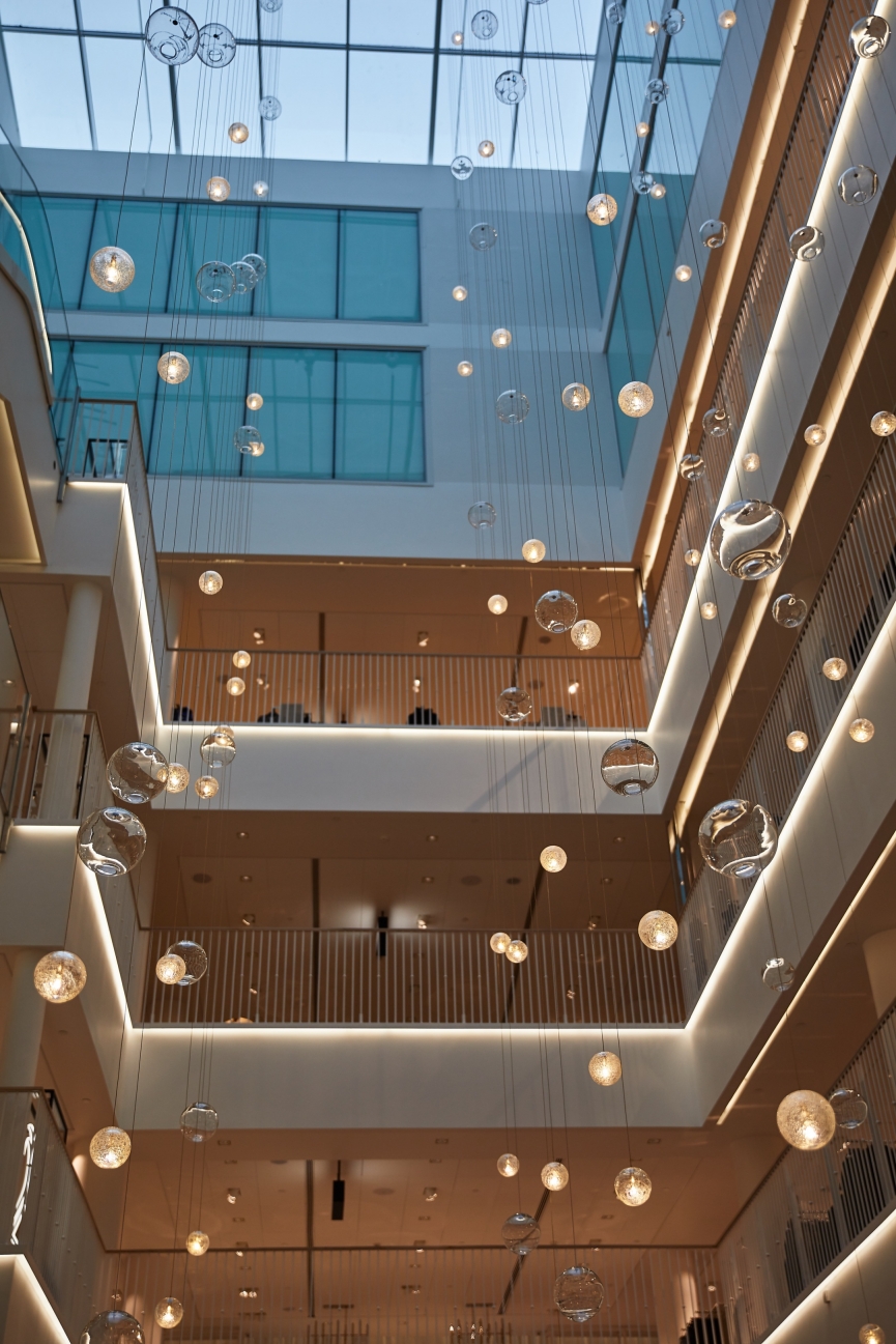 At the top of the chandelier, a higher concentration of transparent globes reflects and captures the daylight, while the lower part has a greater concentration of glowing globes. This creates a feeling of daylight flowing into the room far bellow the glass roof on the 7th floor. The concept "gravity" is reflected both in the arrangement of elements and the distribution of light.