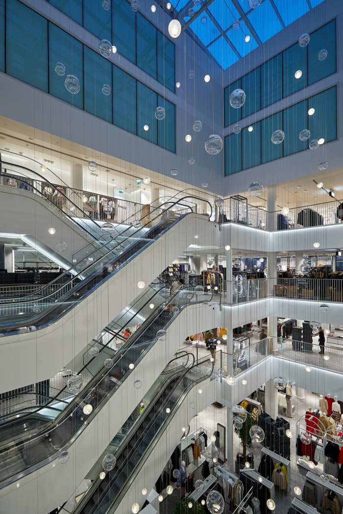 The chandelier complements the 26m high atrium and gives the room a wow effect. It is designed to look attractive in daylight as much as illuminated by artificial light.