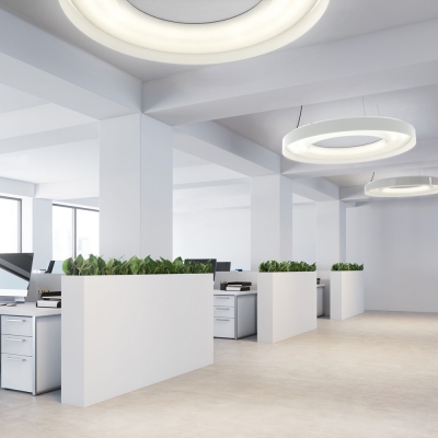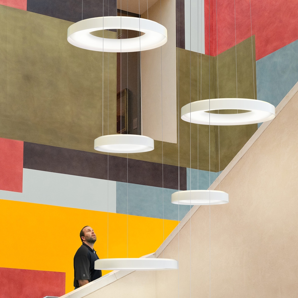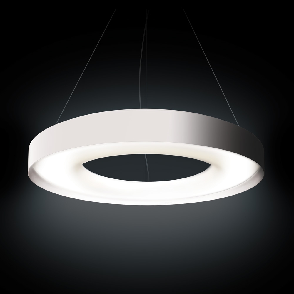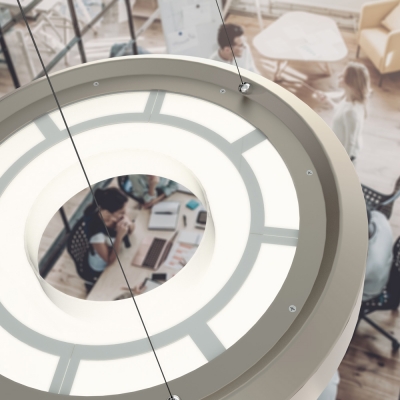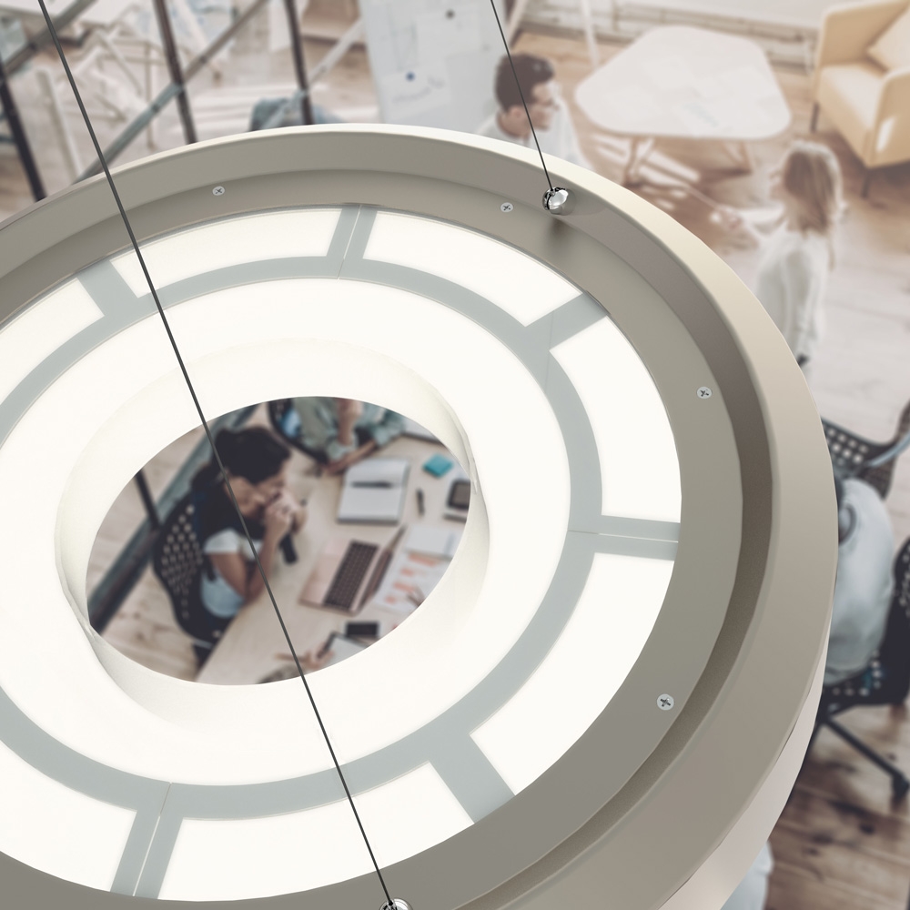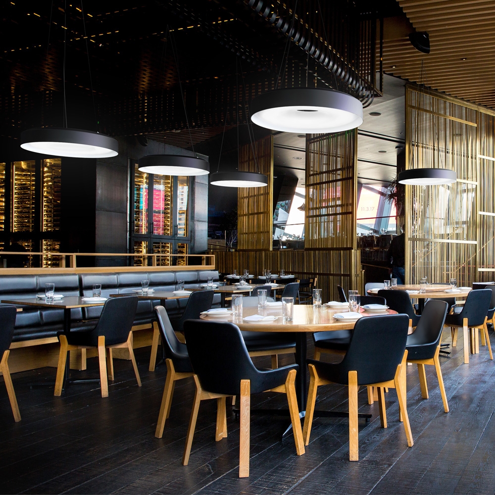 Air is a suspended pendant luminaire that was engineered to achieve maximum direct and indirect light distribution without having to add an extra light source. Air’s thin clear acrylic top plate allows for 24% indirect light. The concave thermoformed diffuser is made of a high performance acrylic that blends the light source while providing an equal and seamless light diffusion. Air delivers up to 8,550 lumens, with an efficacy of 122 lm/W. Available in two standard sizes, 24” and 36”, and can be customized to any color, Air has the capacity to suit the requirements of any environment and allows designers to create interesting patterns and designs. The robust, high quality spun aluminum structure hides all wiring cables and assembly details. Air is shipped as an assembled unit and is easily installed on site. The dual rows of circular high performance LED light engines are available in 3000K, 3500K and 4000K and 80+ or 90+ CRI. Remote driver in canopy with standard 0-10V dimming. Air is shipped as an assembled unit, the fixture is easily installed on site.
