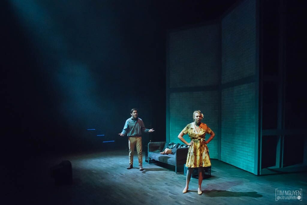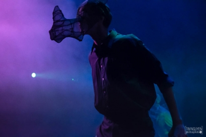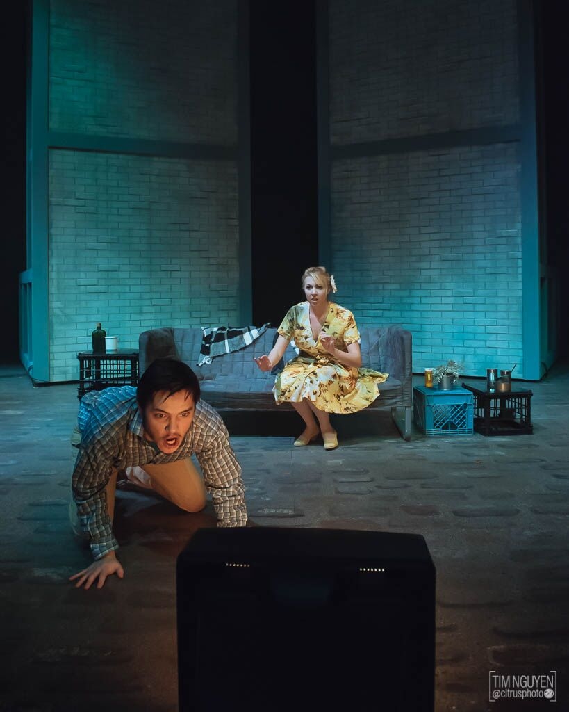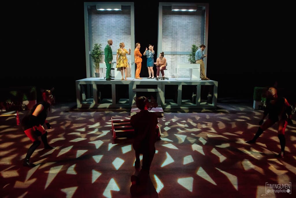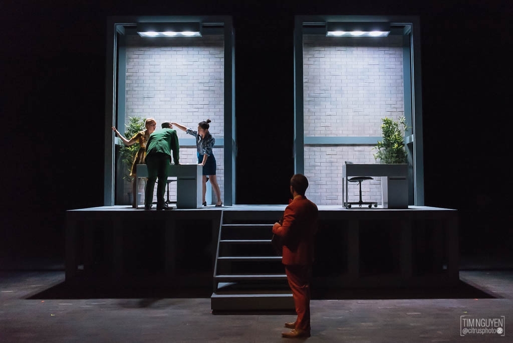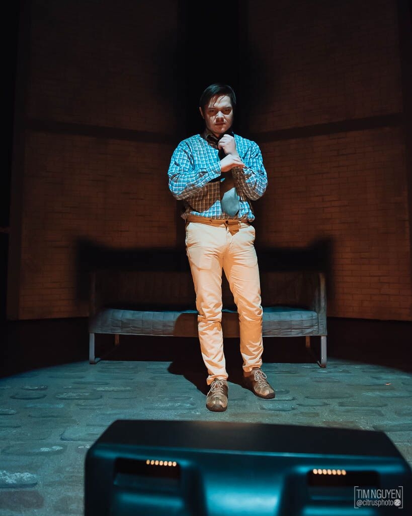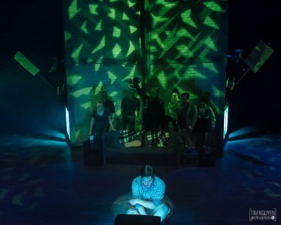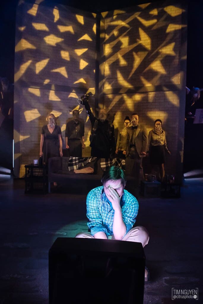 By the end of the play, the Rhinos are dancing and rioting for change. It's chaotic and fun, and the lights match, spinning and changing color. Meanwhile Berenger watches the TV. He complains about what he sees but does nothing, sitting in a spotlight that slowly shrinks around him, isolating him from the world.