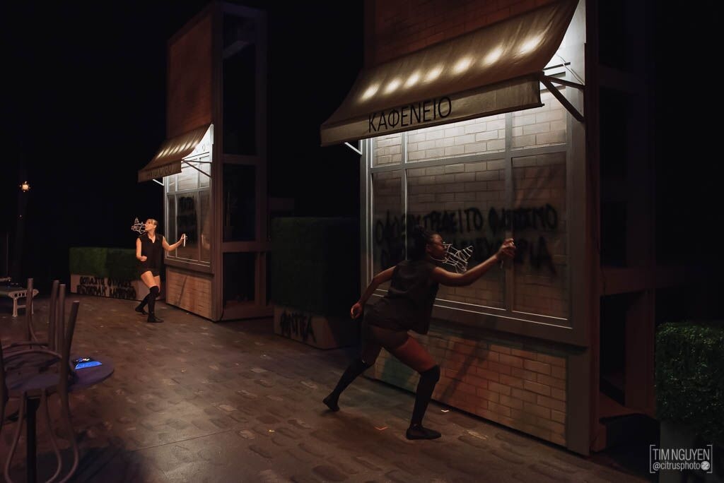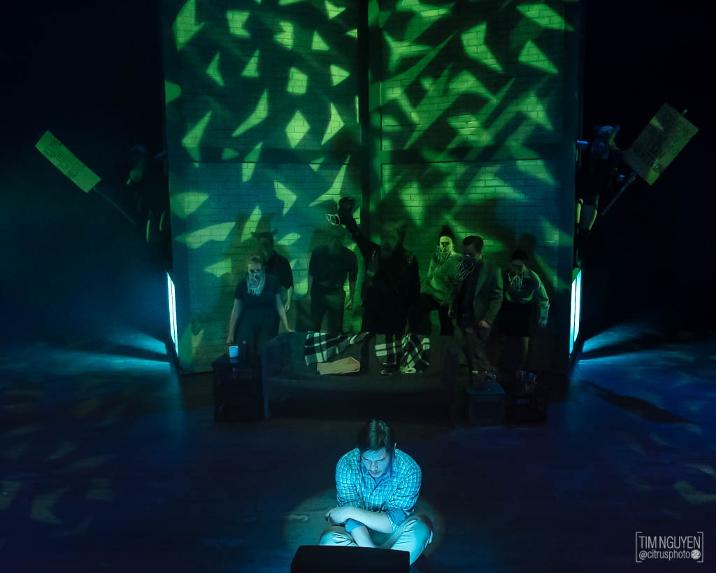 Entry DescriptionFor this show, the director chose to portray Berenger as representing the negative effects of indifference. The Rhinos were based on the riots in Greece, being a force of freedom but also having a good time. As the play progresses and more and more people join the Rhinos, the lights get less realistic and more colorful, incorporating more and faster movement. Meanwhile, the lights on Berenger remain desaturated and isolated, separating him from the force of change around him.