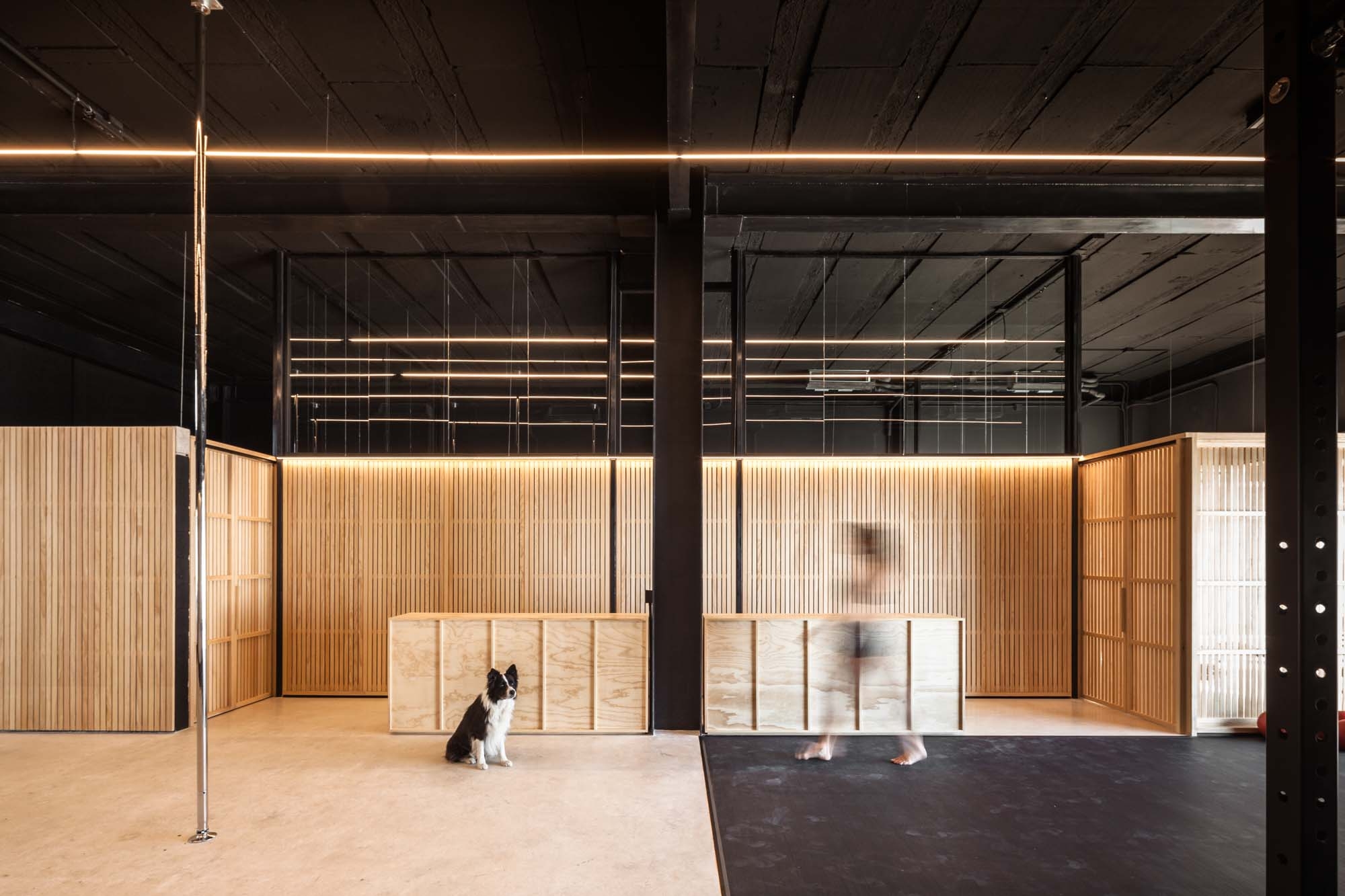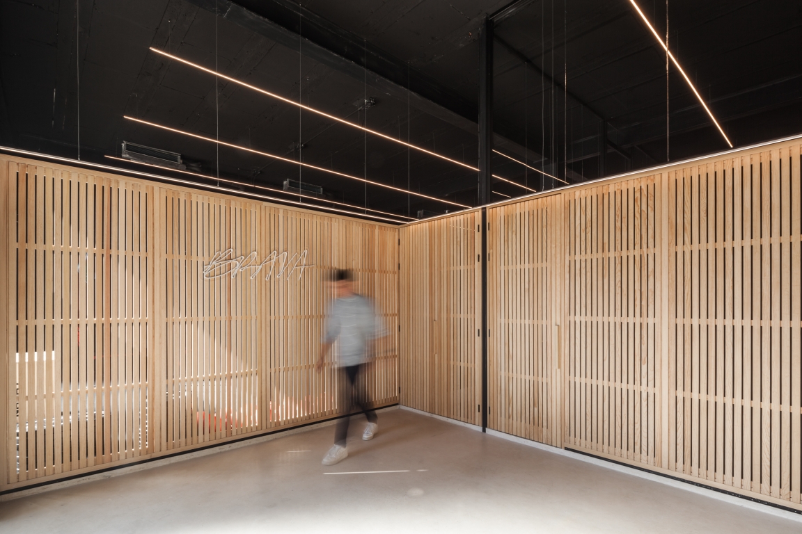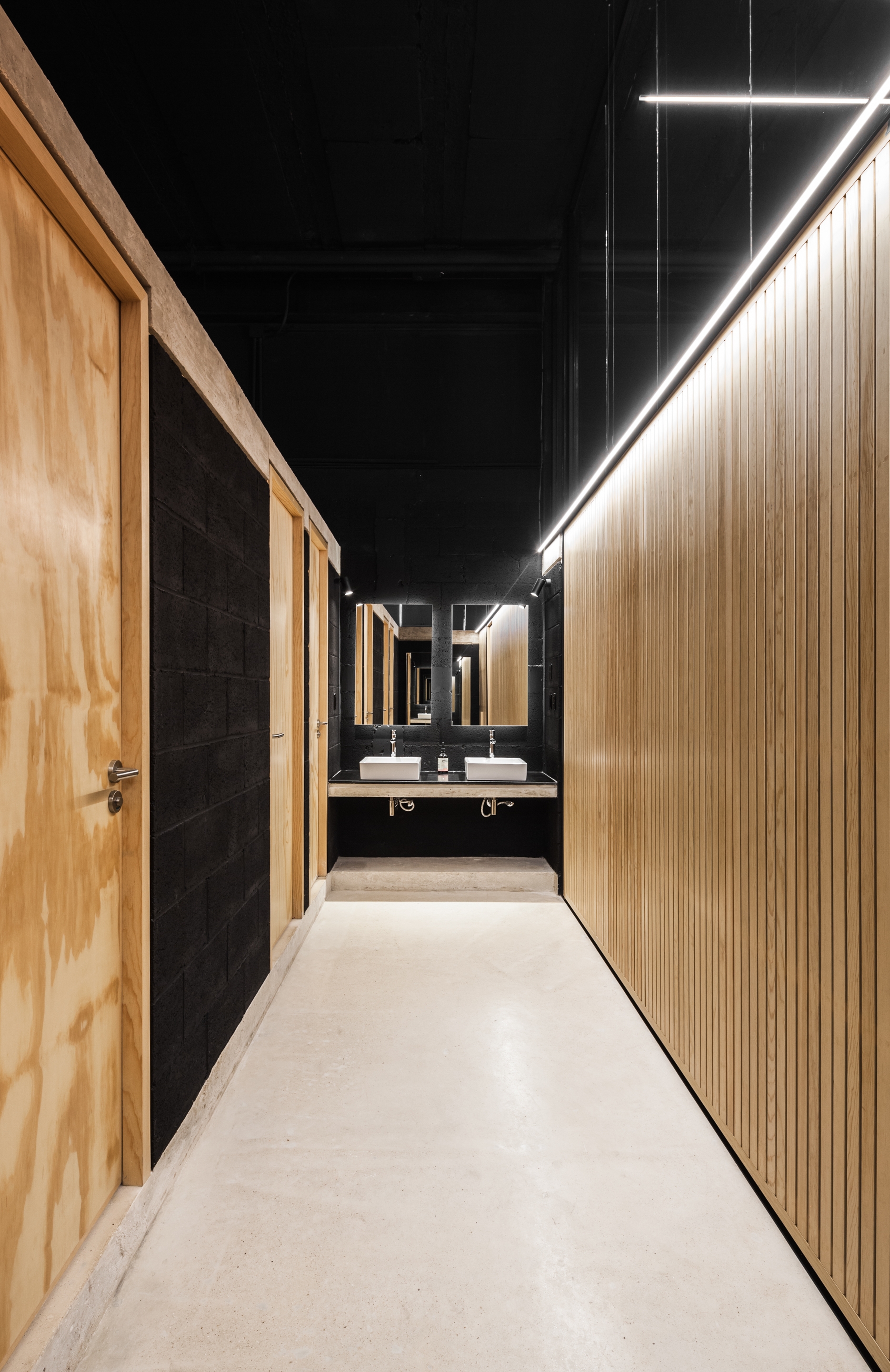 Regarding the finishing craftsmanship, emphasis was placed on the inherent qualities of the selected materials; for example, the floor is finished in polished concrete, the walls are made of blocks that were painted black, and the wood panelling is made of pine. For the section allocated to services, we chose to use natural stones such as marble and granite. Lighting was used as a tool to emphasise the height and length of the premises we gave light to the space through aluminum extruded profiles with 15w/m dimmable LED strips which gave us the oportunity of creating a very confortable space through light with a very low energy consumption, achieving the result of an open, warm, and well-communicated space.