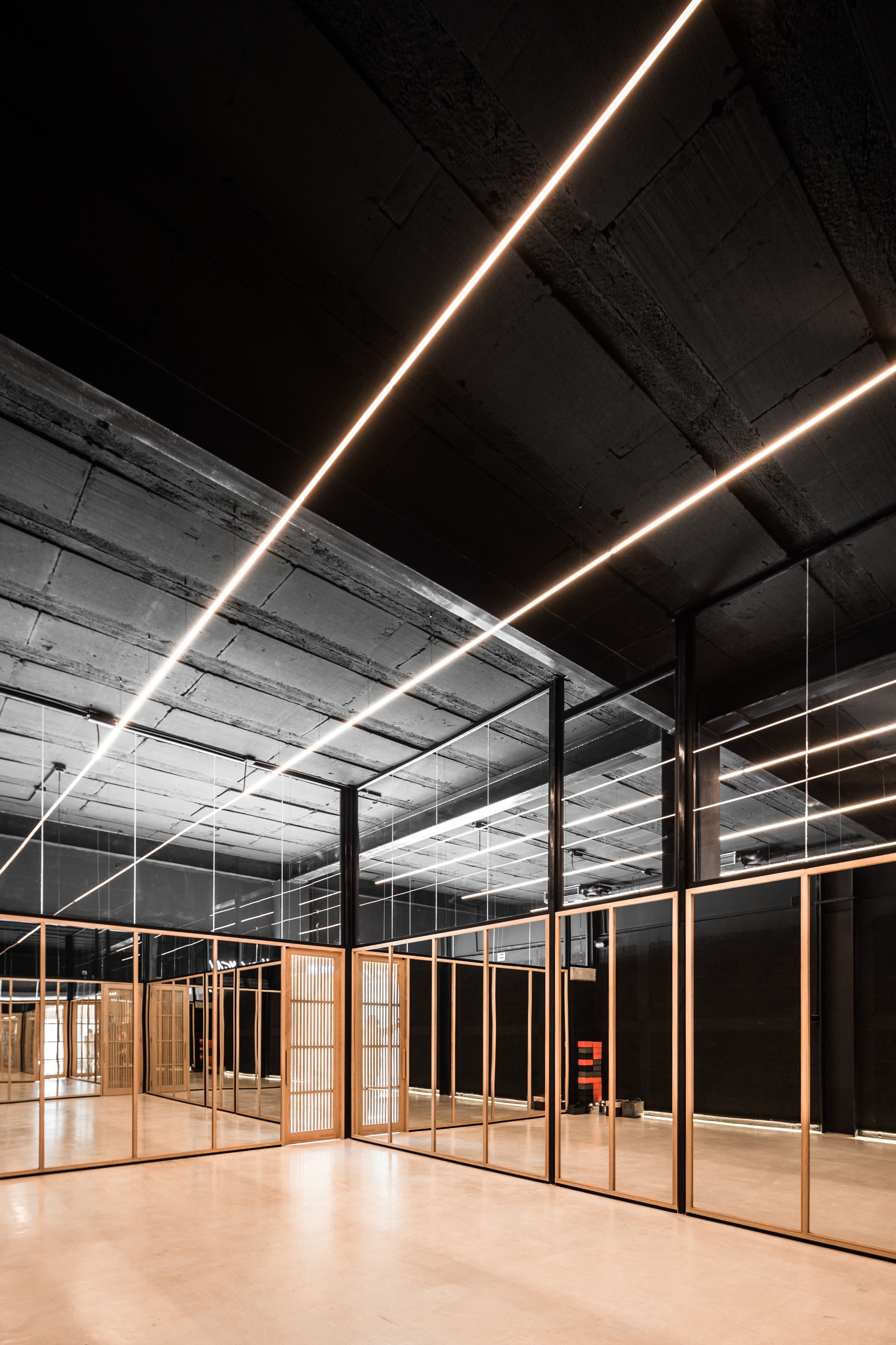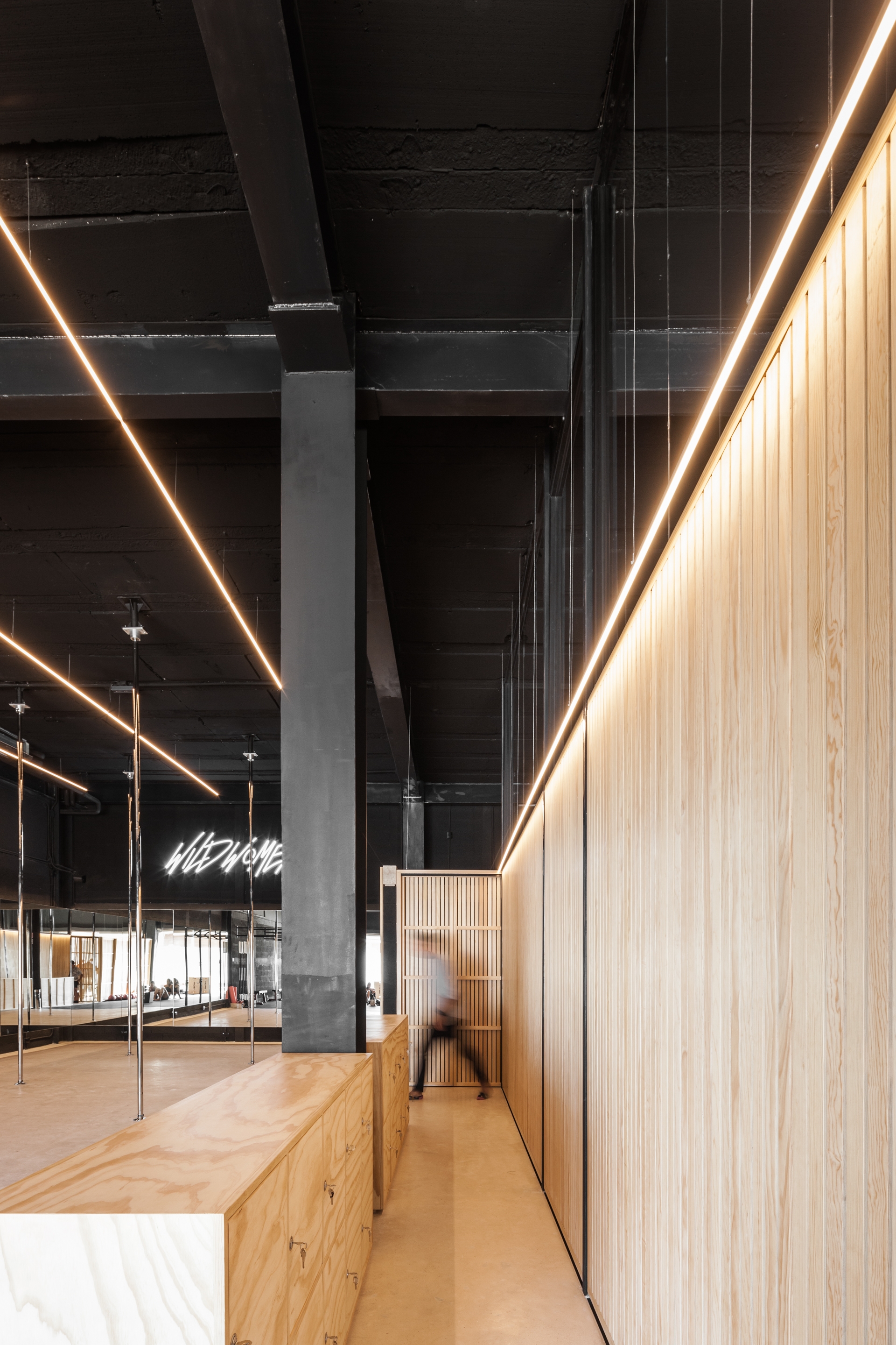 The division of the premises was contemplated based on a single wooden element (pine wall panelling) which functions as the object that divides and joins all the rooms. This wooden wall is, in addition to the black atmosphere, the main object of the illumination project.