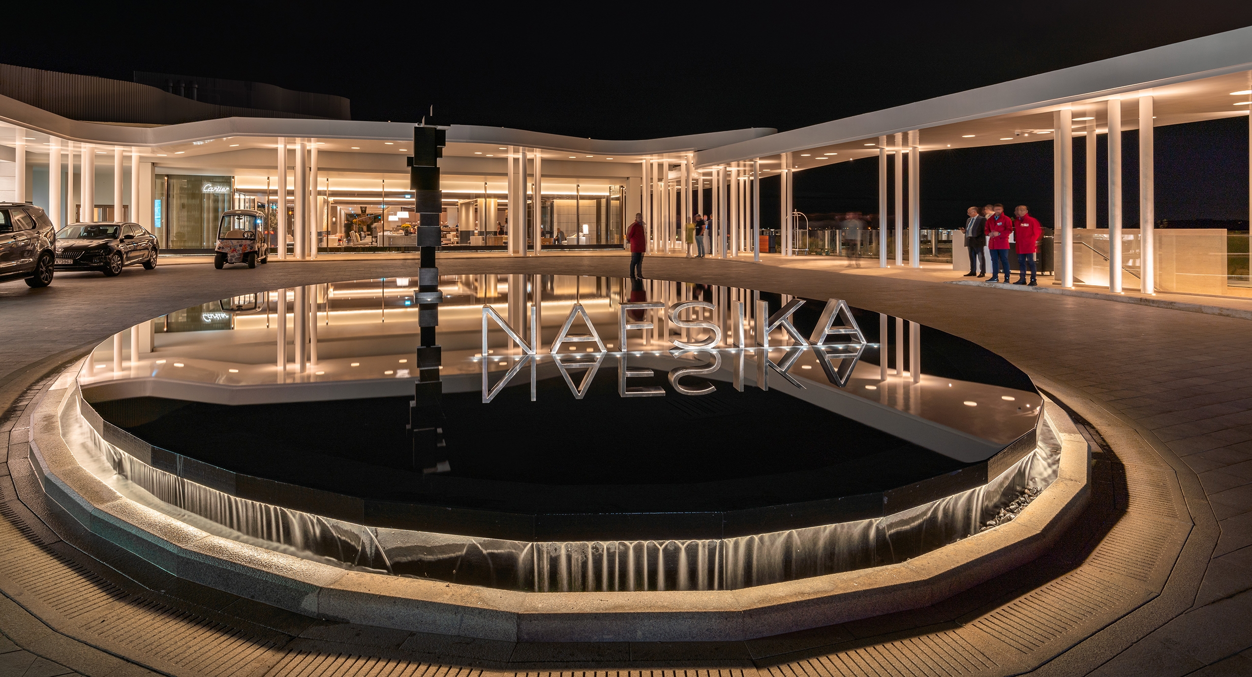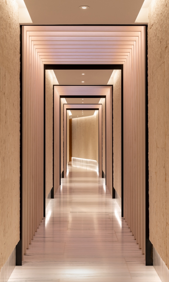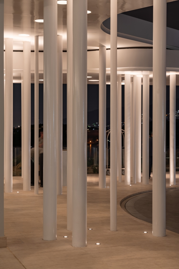 Nafsika’s interior lighting is dramatic and modern, with bold decorative gestures highlighting its livelier atmosphere. The jewel-like pendants in the Avra Lounge as you enter the reception area creates visual impact. Nafsika’s signature feature is its marble slatted corridors. They are front and backlit with a careful balance, becoming an elegantly lit canvas. Nafsika’s façade has a robust appearance. These rectilinear geometries were framed at the slab edge with a small marker of light and further highlight with a soft wash of light.