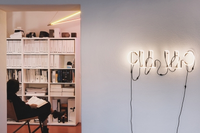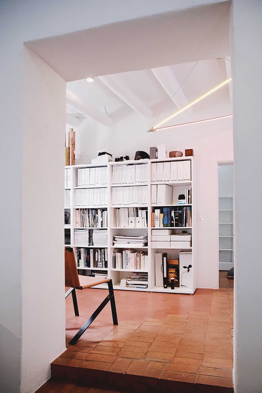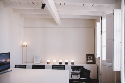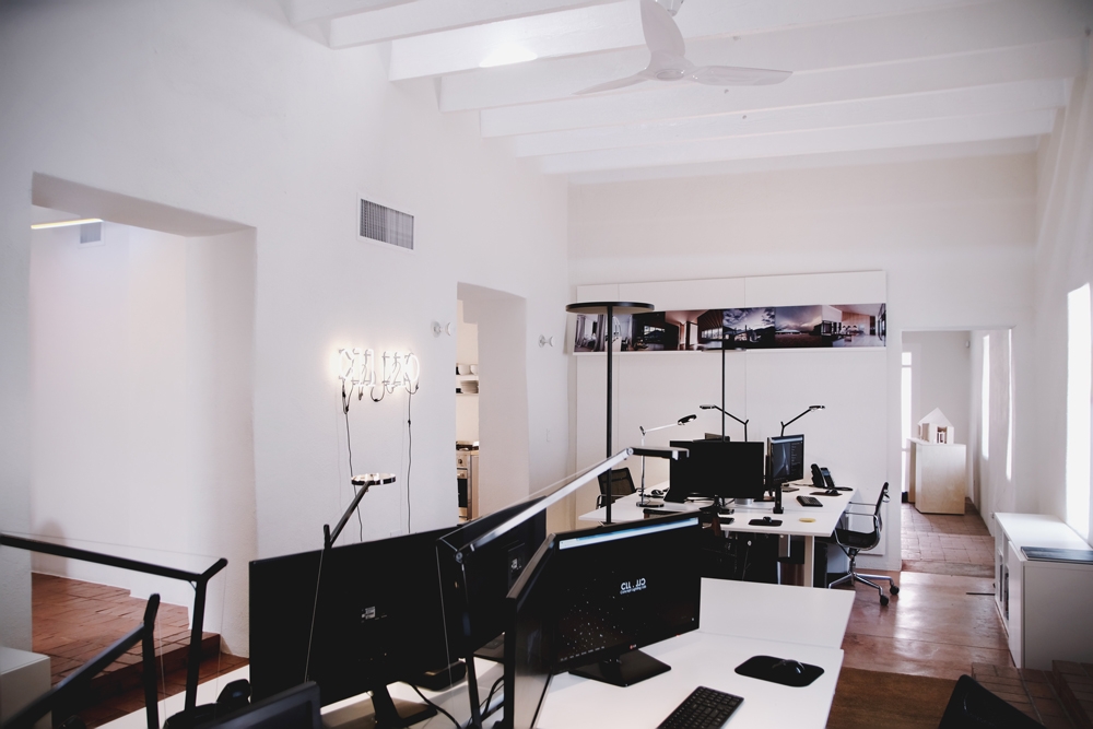 The new introduced lighting is of highest quality, inherently functional, strong in expression, minimal in aesthetic. Dimmable LED task lighting is placed at work desk. Floor standing indirect up-light celebrates the double-height space. A playful neon sign, references our studio logo, welcomes those who enter. A triangle of light emits primary colors. Custom light fixtures are displayed in the conference room. 3M frosted film ensures privacy while filtering the intense desert light and glare, while filling our space with diffuse daylight.