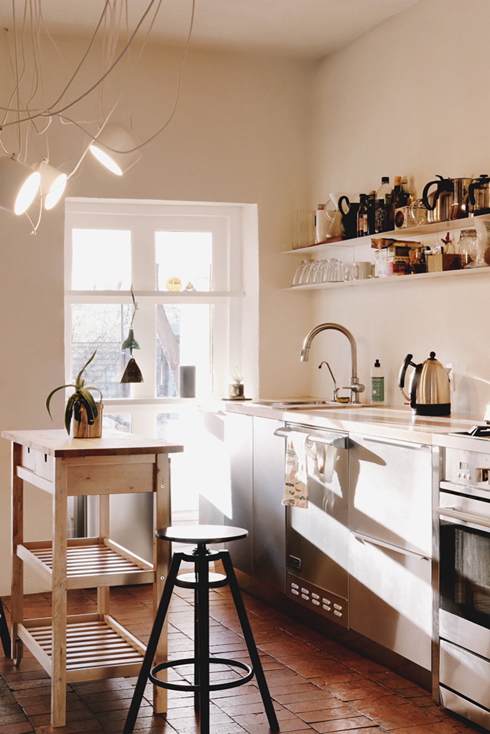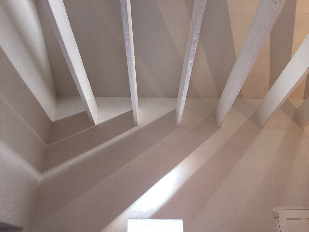 At the core, a double height interior space with four windows facing east, the remodel entailed removal of layers of previous living over time, and rehabilitation of precious elements.