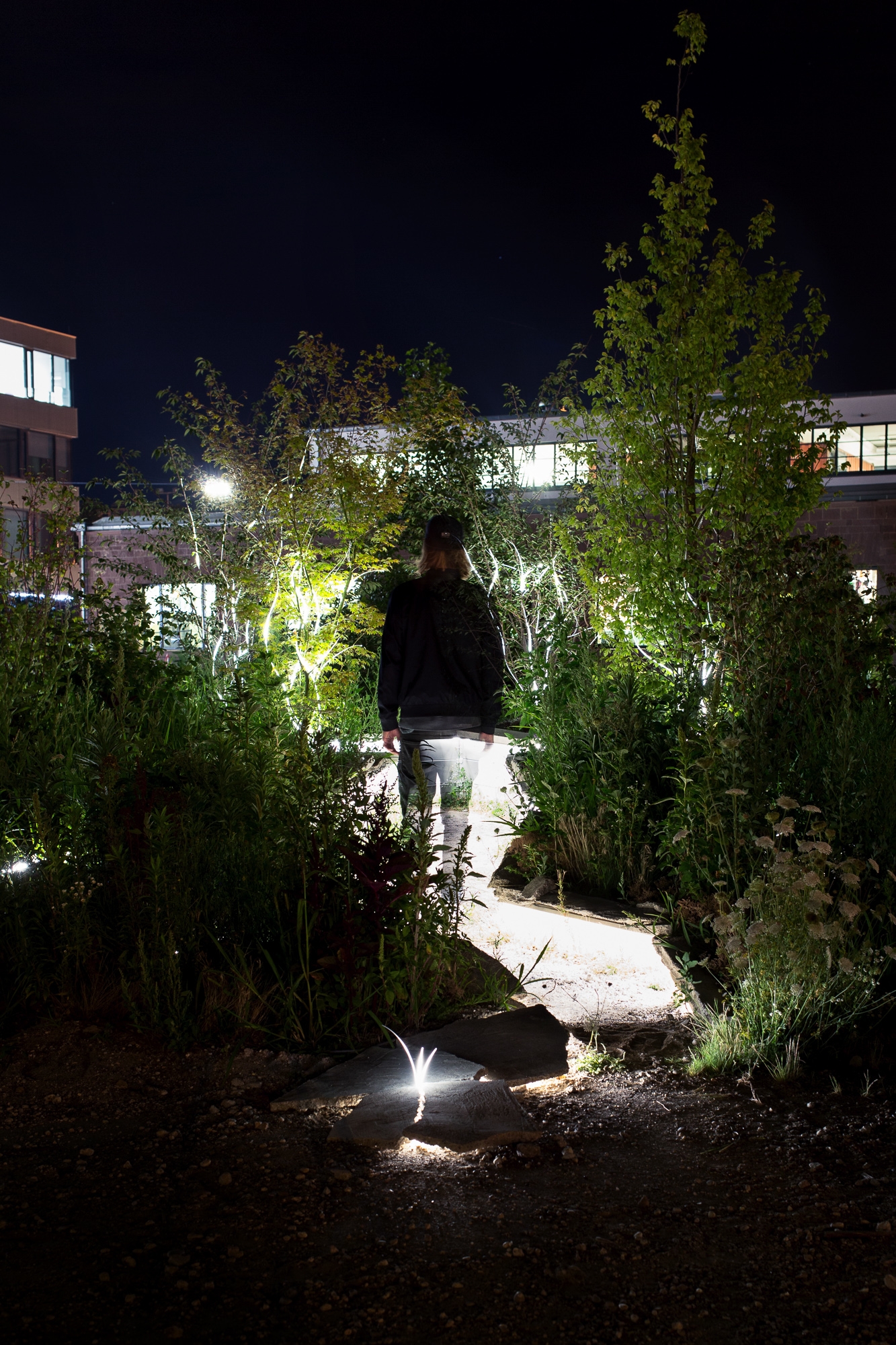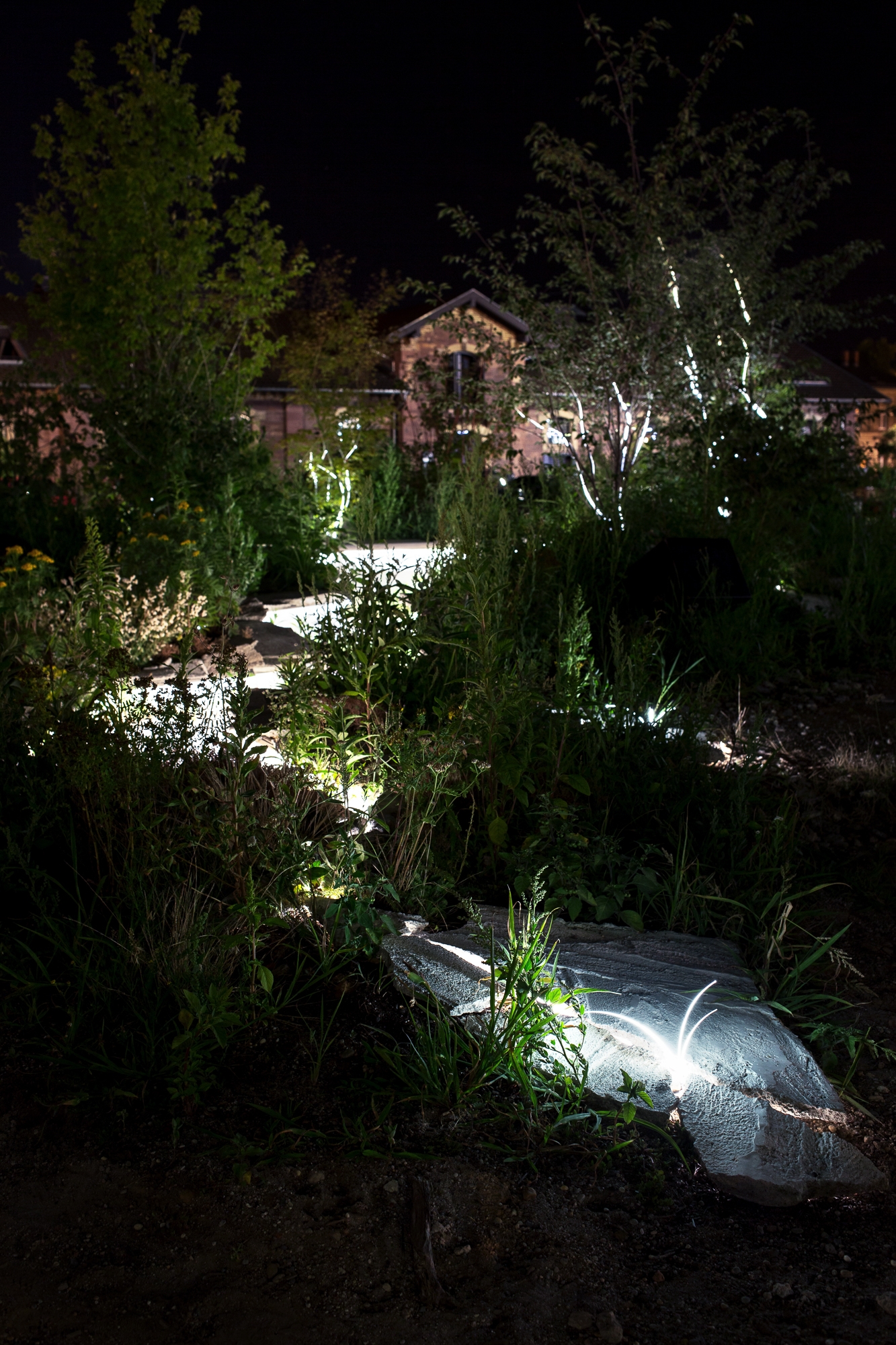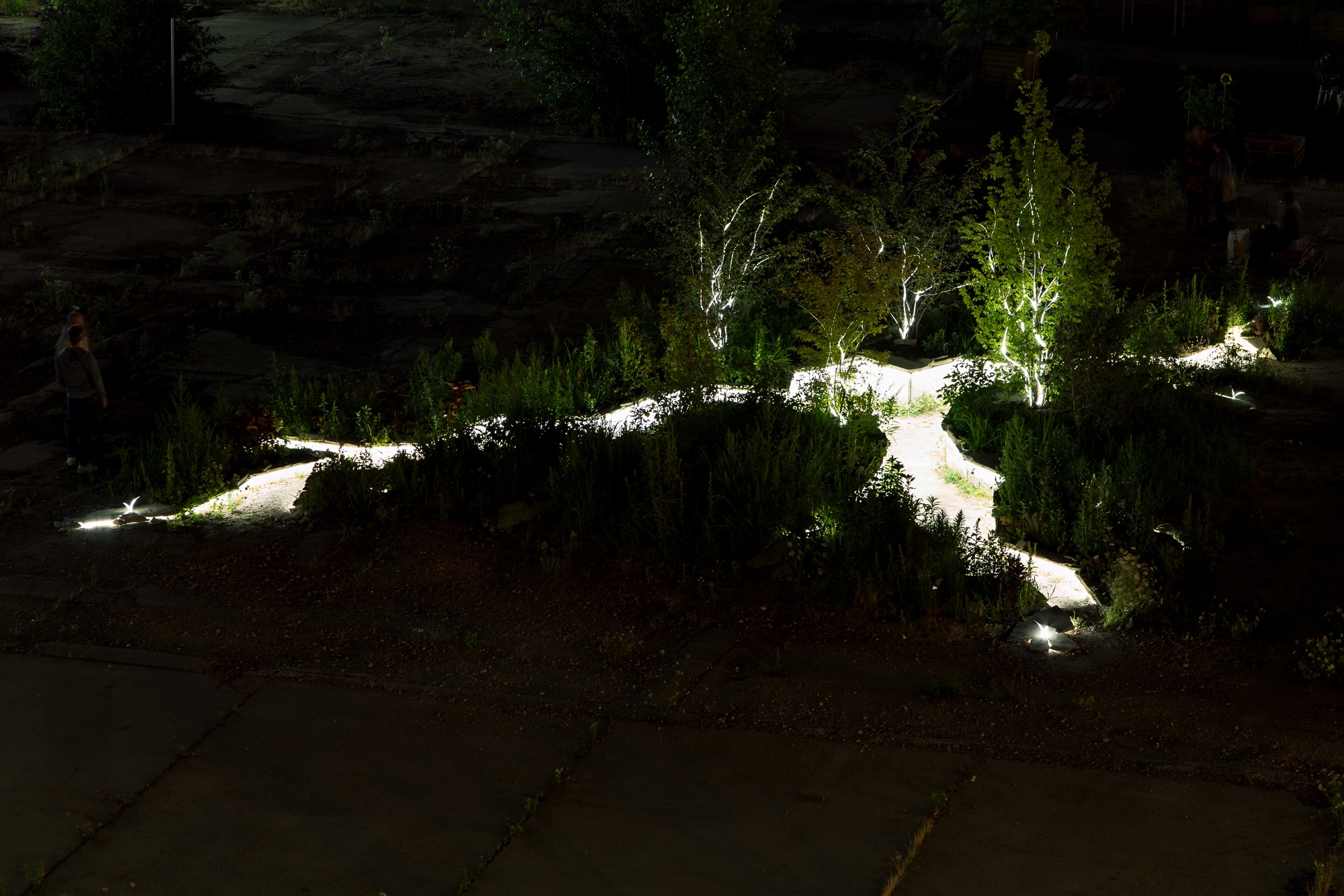The installation was part of the art festival “Schwein gehabt”, which takes place on the former meatpacking district, which today is transformed into a cultural and creative hub of Karlsruhe. ‘Breaking ground’ focuses on a sealed area in the middle of the site, that users have wished to see greener and more vibrant. This idea is taken up and realized in a temporary light and sound installation, which at the same time is the starting point for a permanent change of the place.