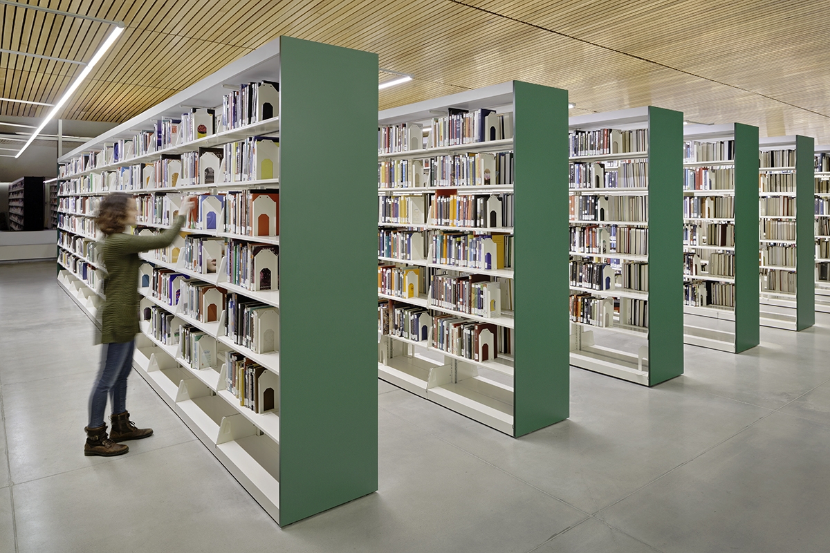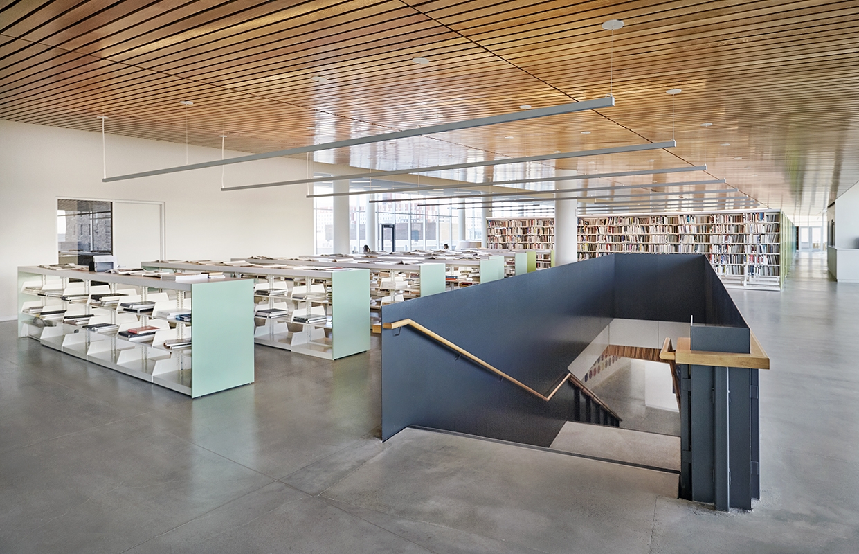 The 24/7 university library space requires a safe and inviting experience for studying late while the rest of the building is closed. The Main Lobby, with its curved 40 ft high cedar wood ceiling, is the heart of the building with a connection to all floors of the building vertically through the oculus and being visible from the far end of the building from the 4th floor.