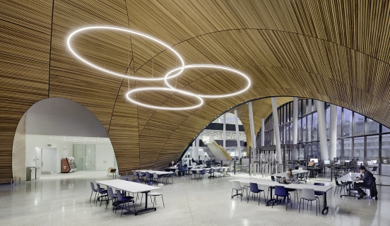 The 3-intersecting direct/indirect circular LED pendants and adjustable downlights integrated into the top of curtain walls provide ambient and task lighting for the students. Study spaces are bright with vertical illumination to balance with the daylight, attracting students and staff to these pleasant spaces. Linear fixtures with a custom reflector above a white 1” cell egg crate ceiling system create a visually appealing pixel image effect and repeats throughout the building.