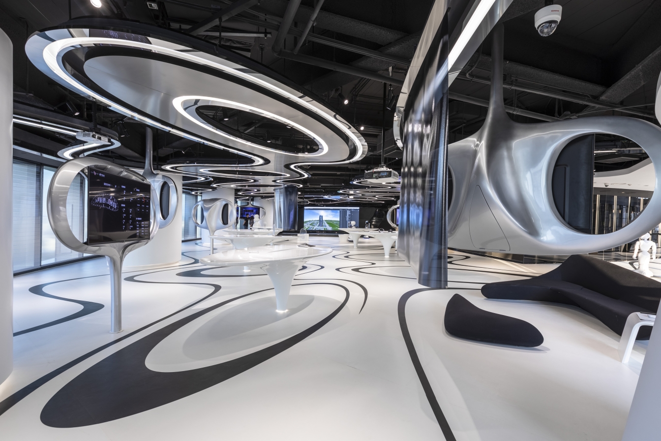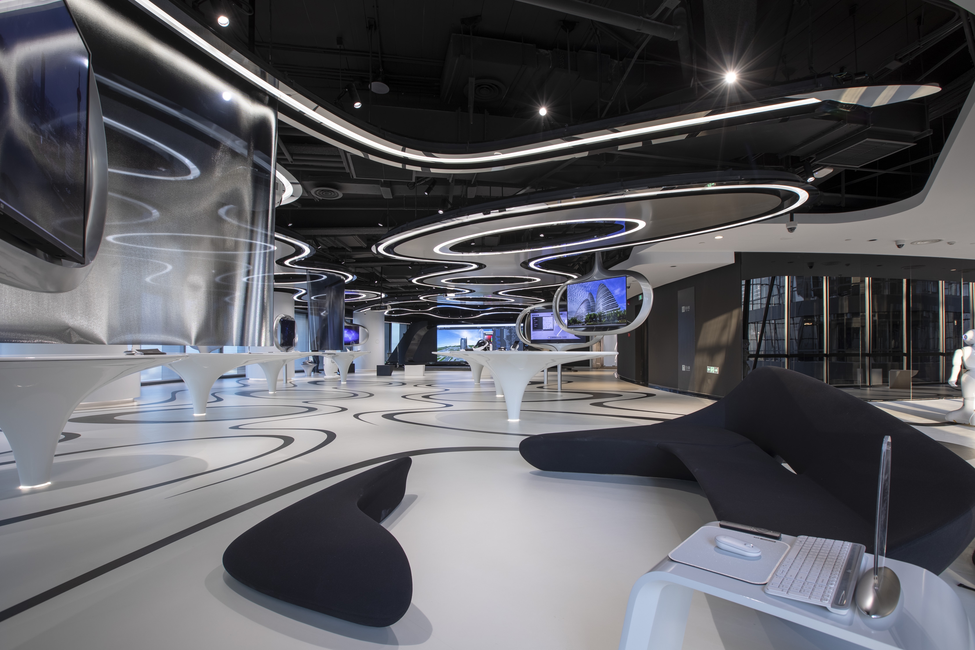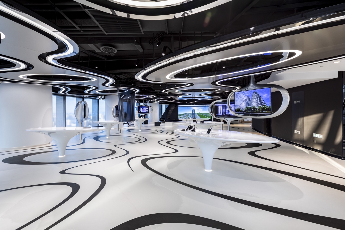 ZHA team adopts the unique elegant geometric streamlines, alternating black and white lights in whole design, highlighting a strong sense of contemporaneity and rhythm, showing the smooth style of modern and future laboratories to the highest level and infinite possibilities. The lighting design highlights the curve of the ceiling and the display table, this design also combines the 4000K indirect light belt and the hidden flip track light to create a space full of sense of technology.