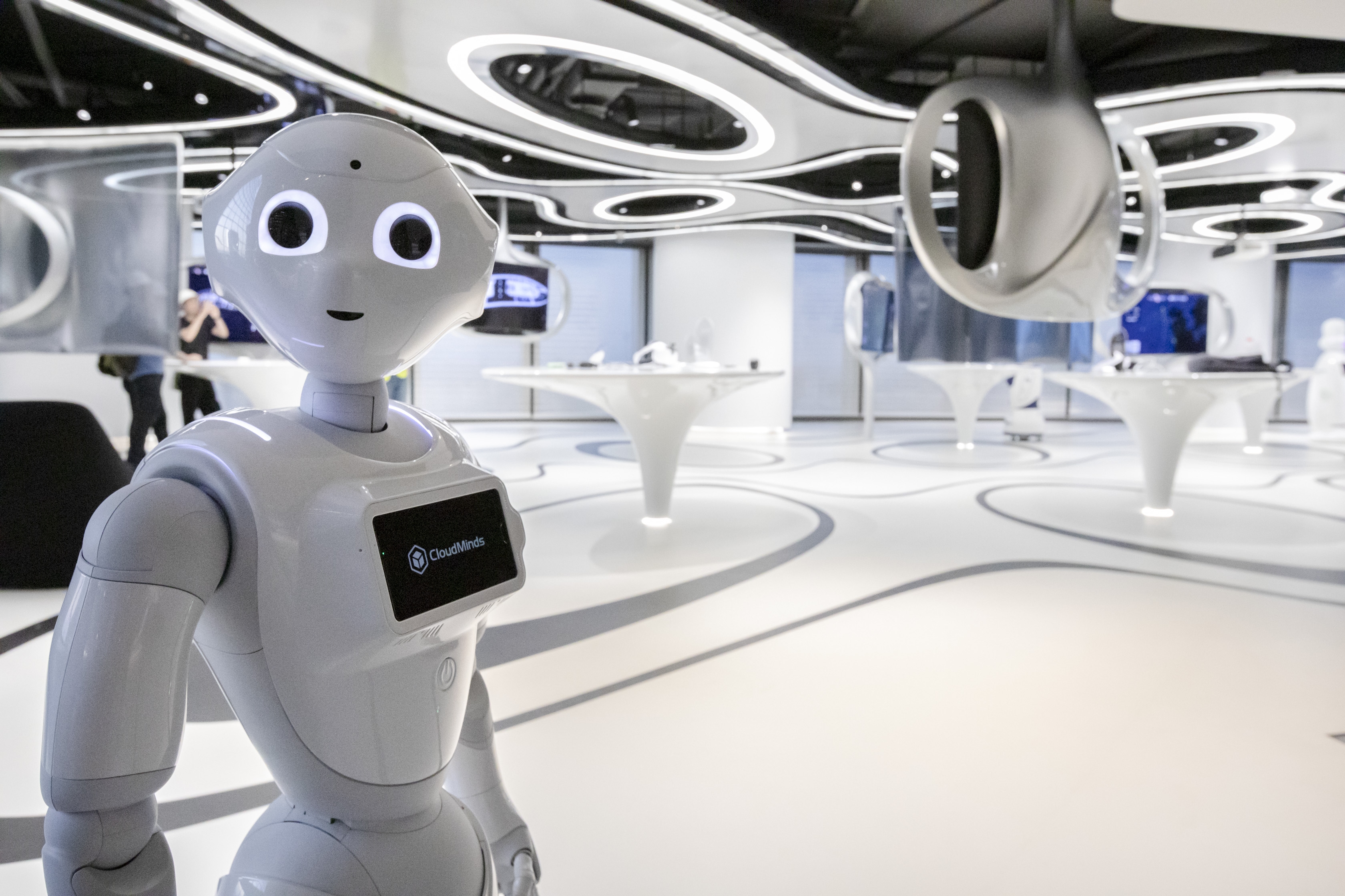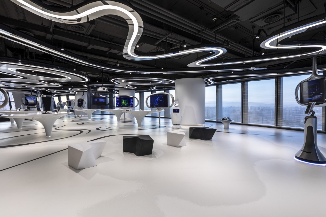 The indoor space consists of 5G product application exhibition area and lecture platform area, which is "connected" by the curve full of sense of flowing distributed on the ceiling and the ground. The exhibition platform is irregular oval, like "stones" and "isolated islands". The "curves" of the ceiling and the ground flows through them like rivers, connecting them. The natural and technological sense of whole space are presented with very natural way.