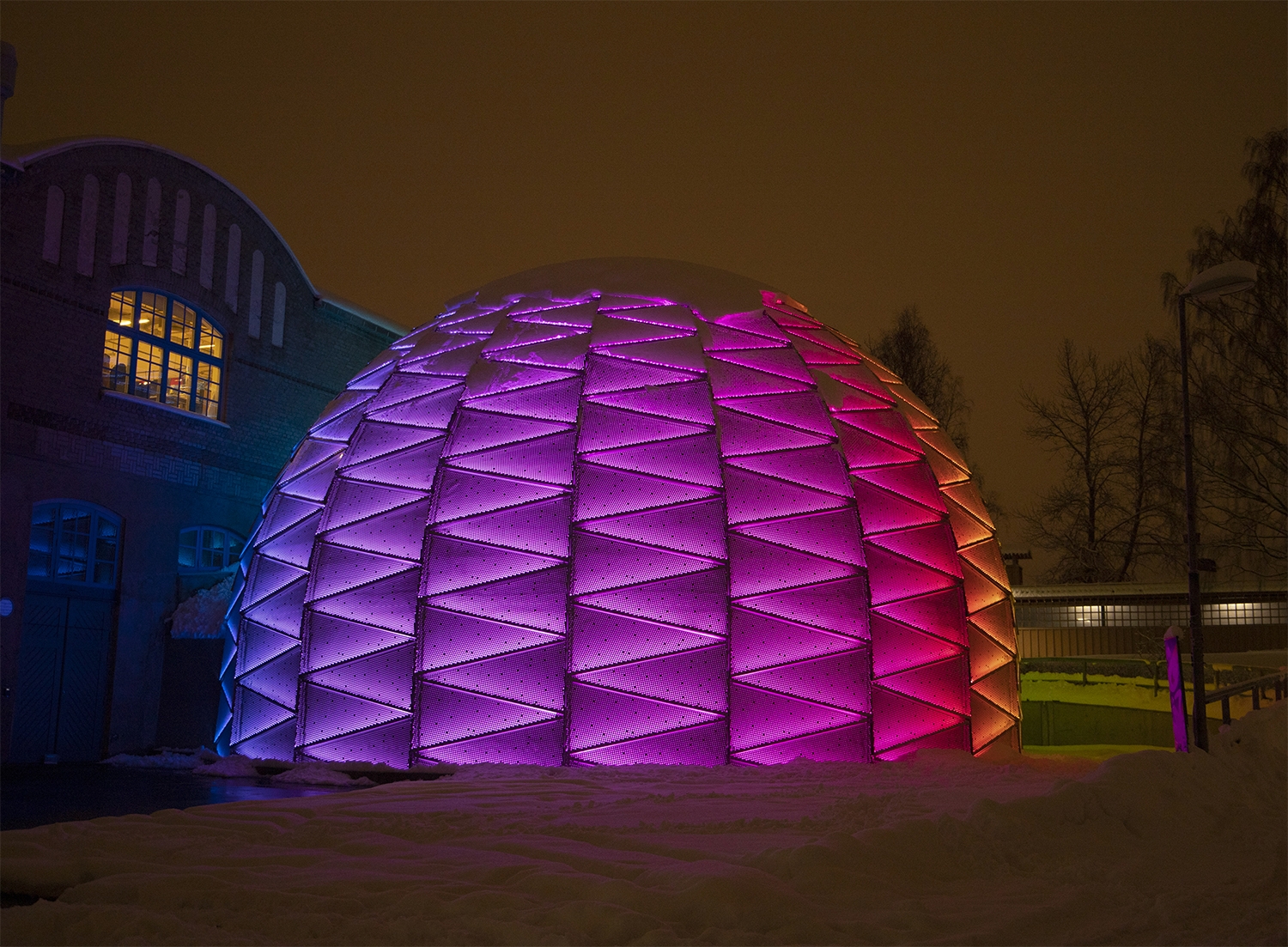 A number of scenarios have been designed and programmed, for the users to choose from depending on the activity on Campus. The fine-tuned default scenario is static, while second scenario with a gentle dynamic shimmer at the top can be activated to communicate to by passers that there is activity going on inside the dome right now.