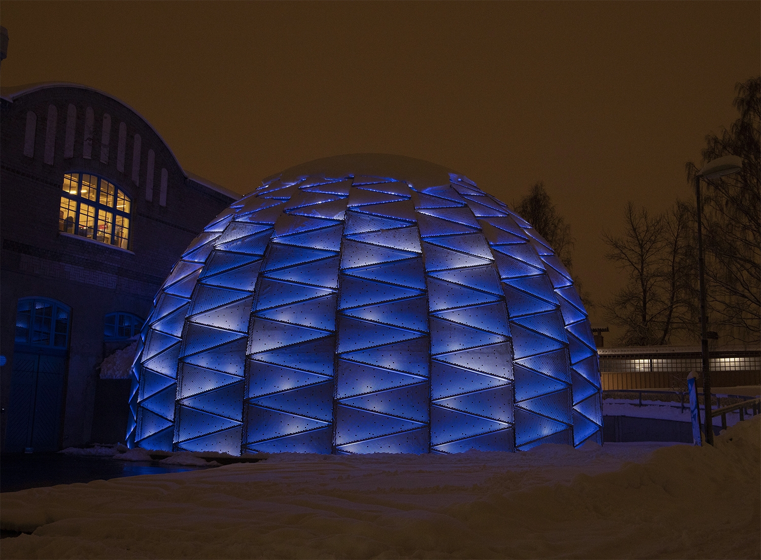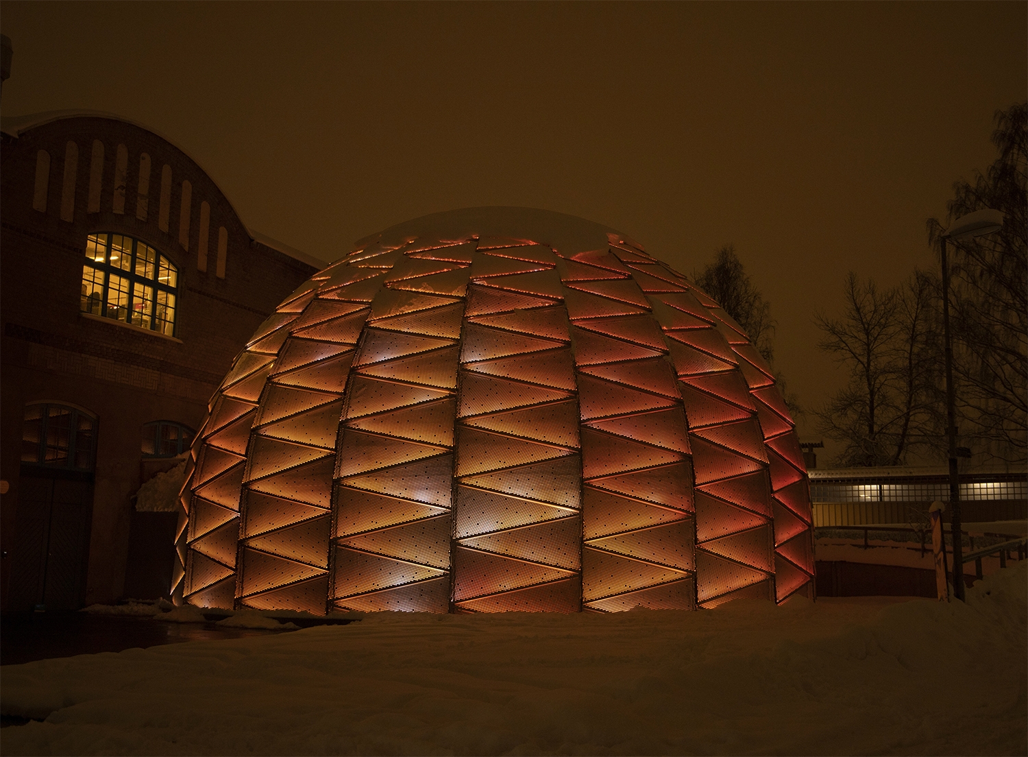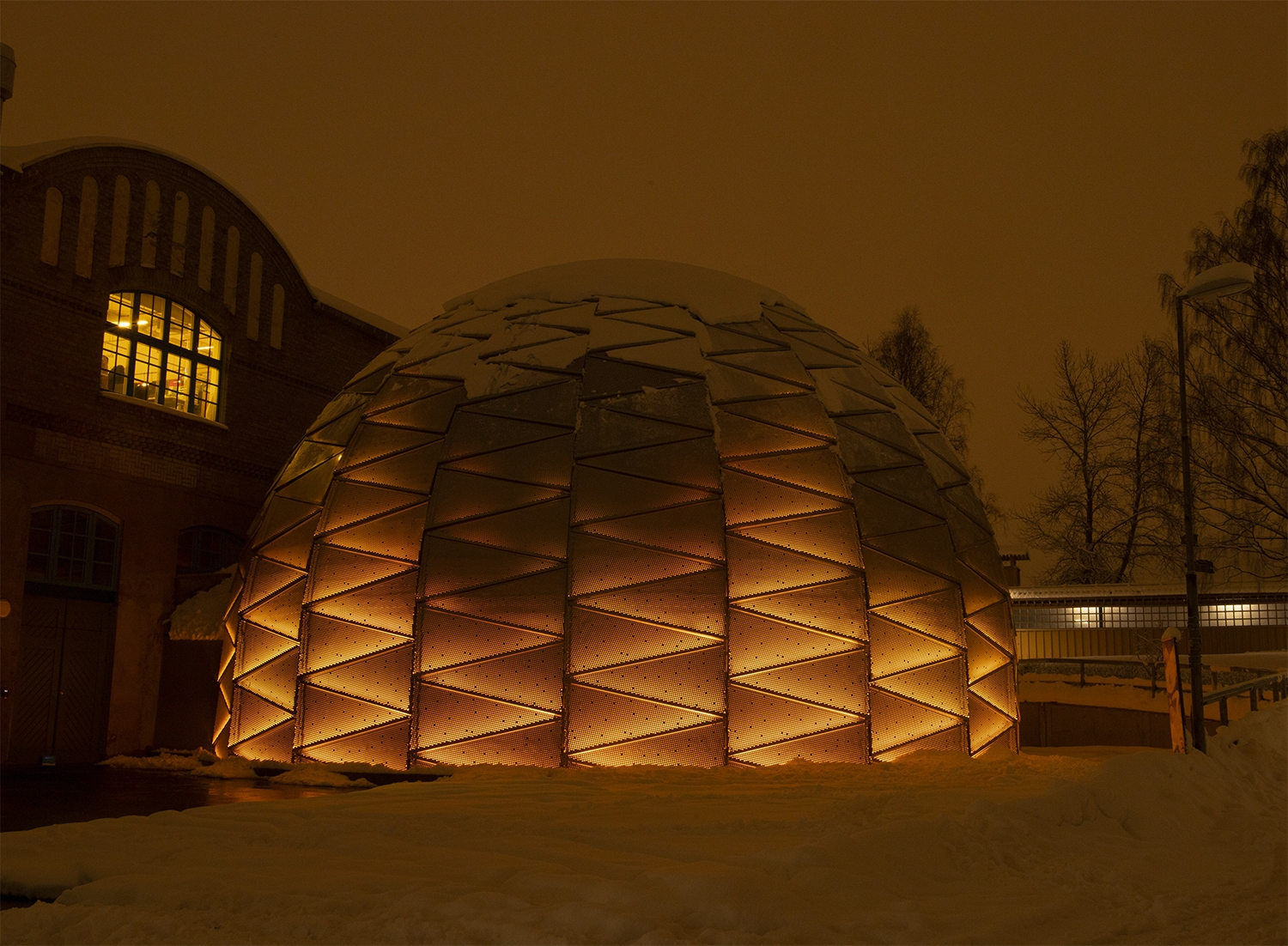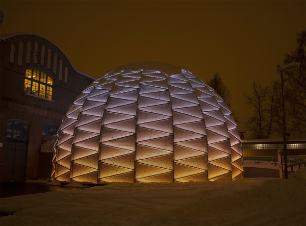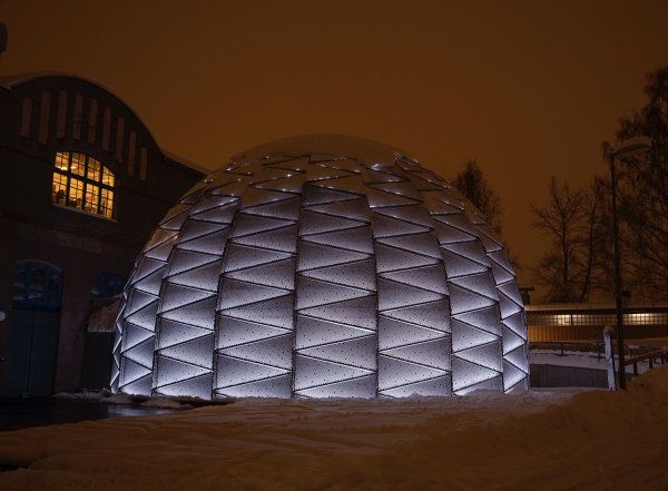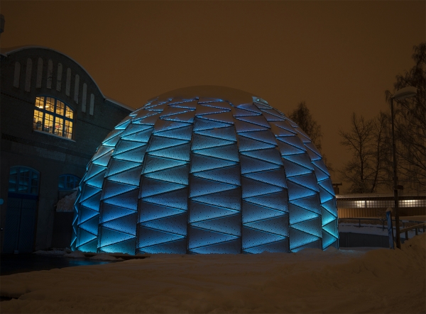 Entry DescriptionDome Theater in northen Sweden with a façade constructed of 475 perforated aluminum cassettes.