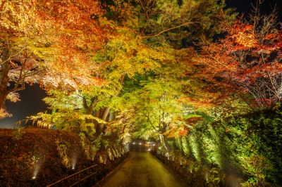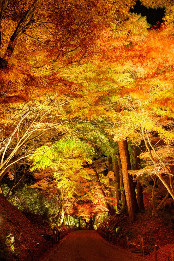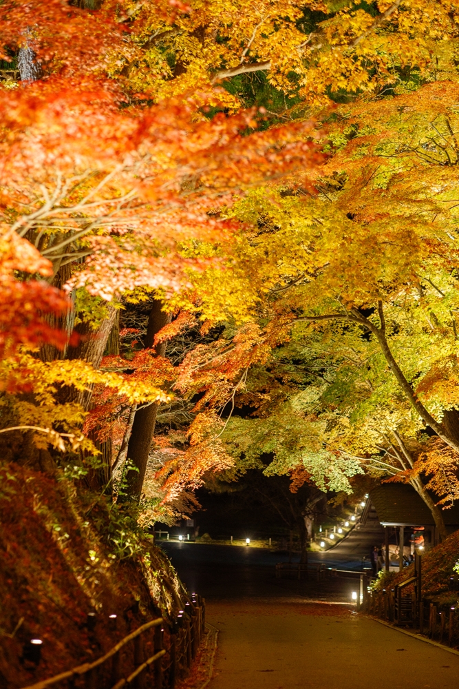 Tsukimizaka Slope to the temple becomes gradually brighter, and the main pathway from Hondo Main Hall to Konjikido Golden Hall, where the fall leaves are at their best, has been transformed into a space wrapped in the glow of autumn foliage illuminated by a series of small 2700K LED spotlights on both sides.