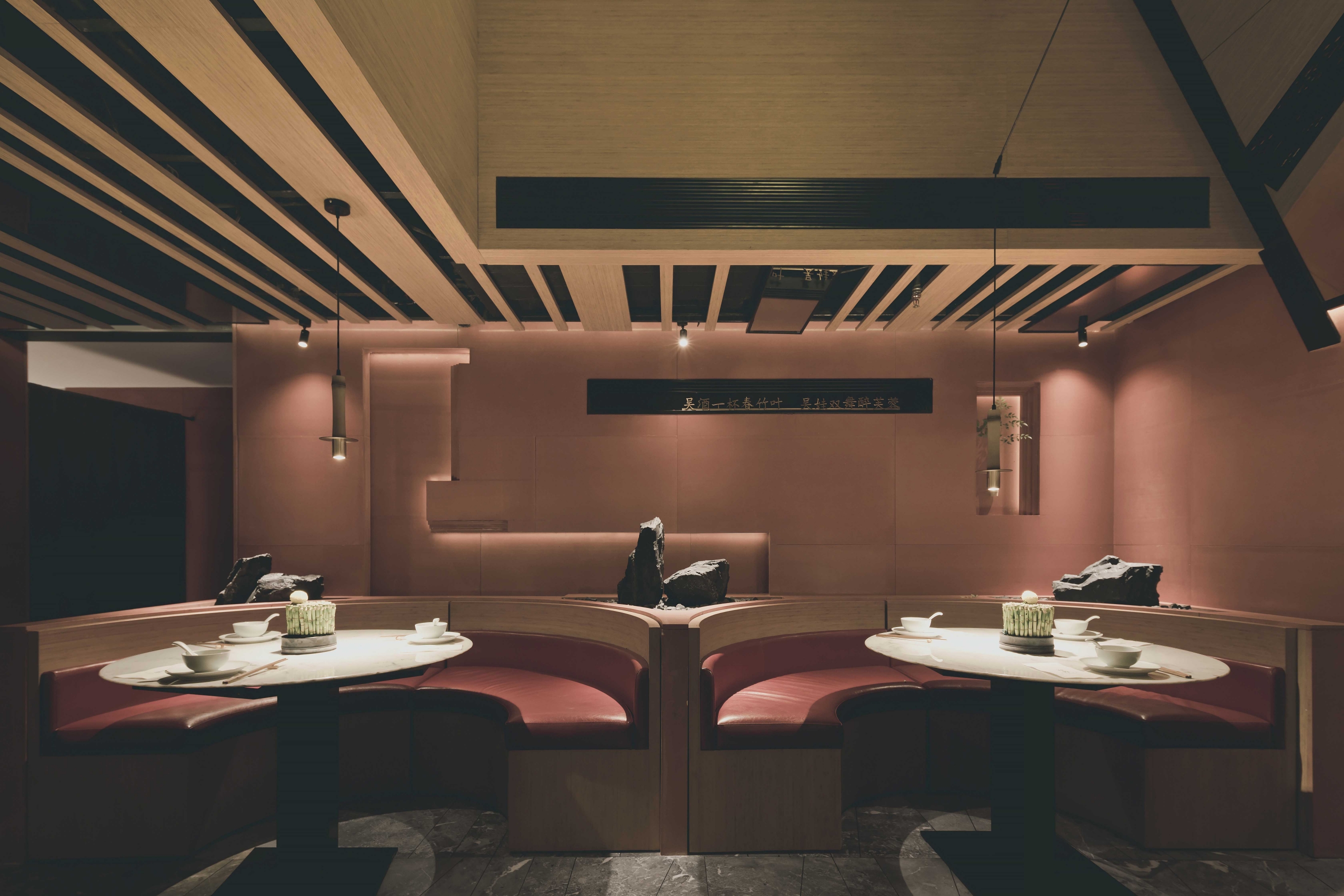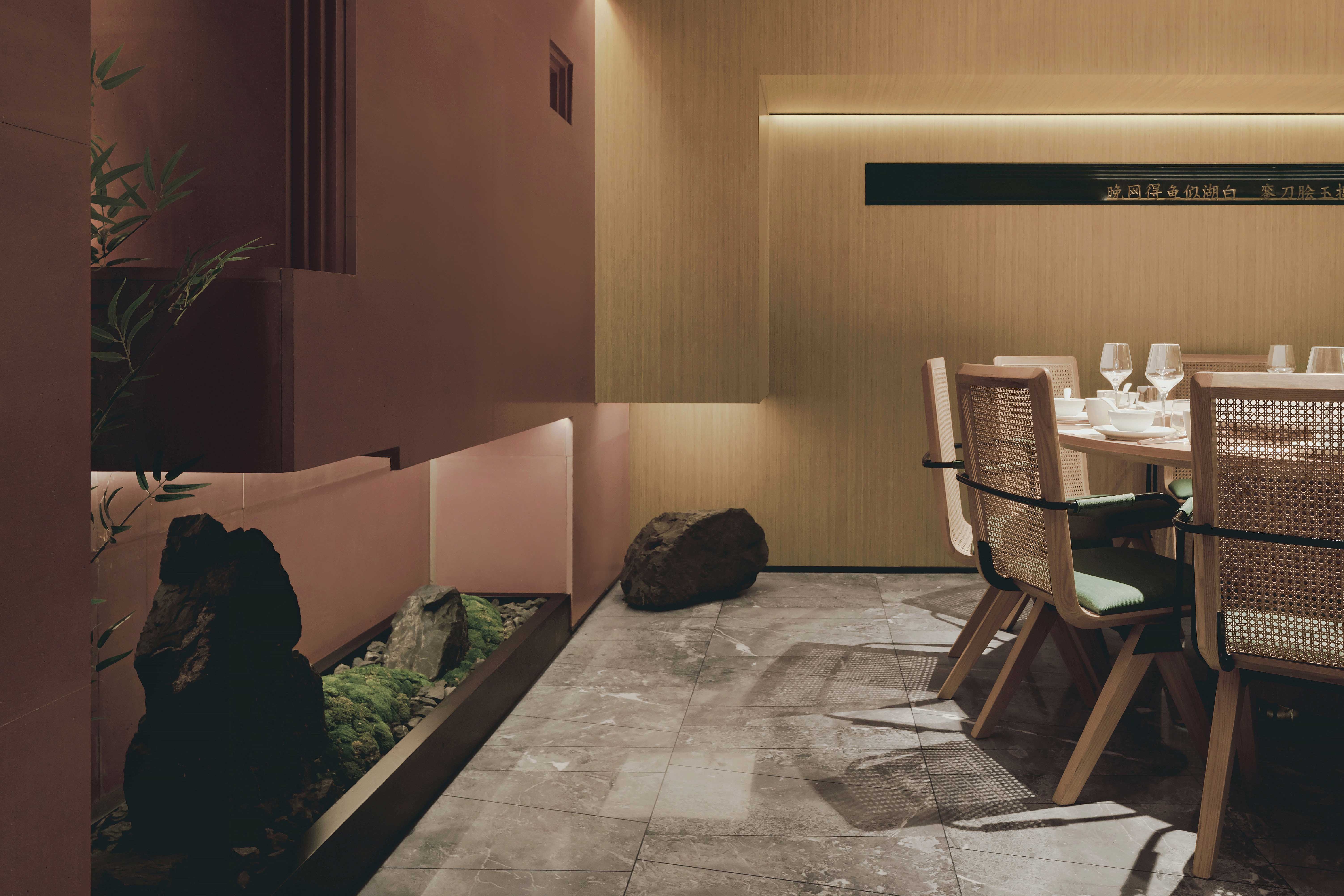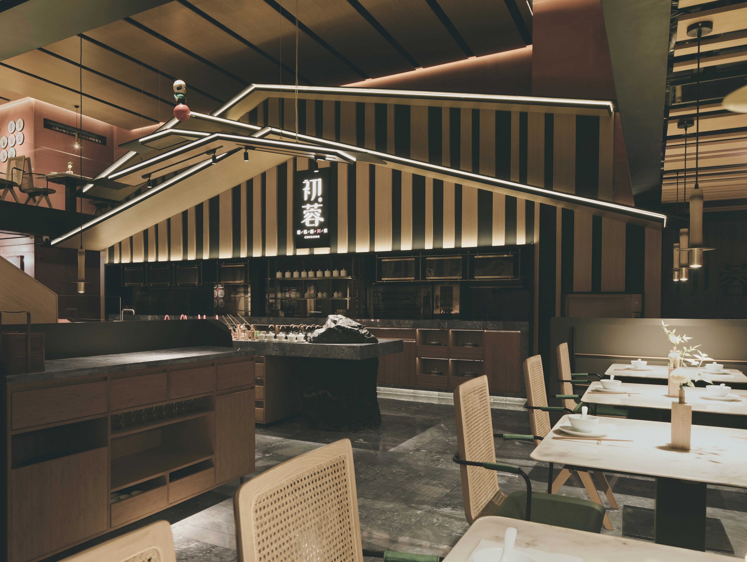 Commercial projects must consider the best use of space.Despite the limited floor height, the designer still wants to provide customers with a comfortable dining experience. The lighting design starts with emphasizing the interspersed relationship of the structure. In the key parts of the interior, lighting subverts the traditional soft decoration. The way of expression is to use unusual angles to penetrate into the scene. In functional areas, decorative chandeliers and special spotlights are used to make the displayed dishes full of color, fragrance and taste. The overall lighting of ChuRong is suitable for space performance and indoor environment. Light and shadow are intertwined, just like walking through the painting.