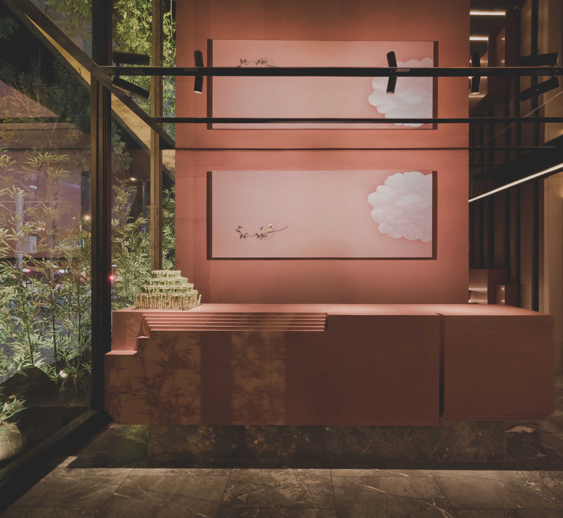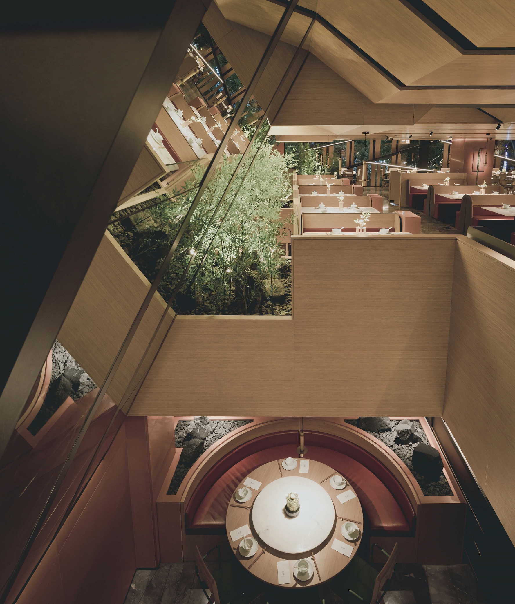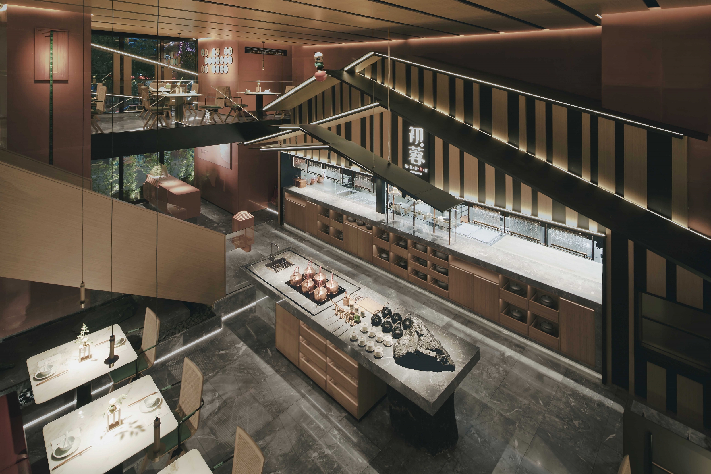 Commercial projects must consider the best use of space.Despite the limited floor height, the designer still wants to provide customers with a comfortable dining experience. The lighting design starts with emphasizing the interspersed relationship of the structure. In the key parts of the interior, lighting subverts the traditional soft decoration. The way of expression is to use unusual angles to penetrate into the scene. In functional areas, decorative chandeliers and special spotlights are used to make the displayed dishes full of color, fragrance and taste. The overall lighting of ChuRong is suitable for space performance and indoor environment. Light and shadow are intertwined, just like walking through the painting.
