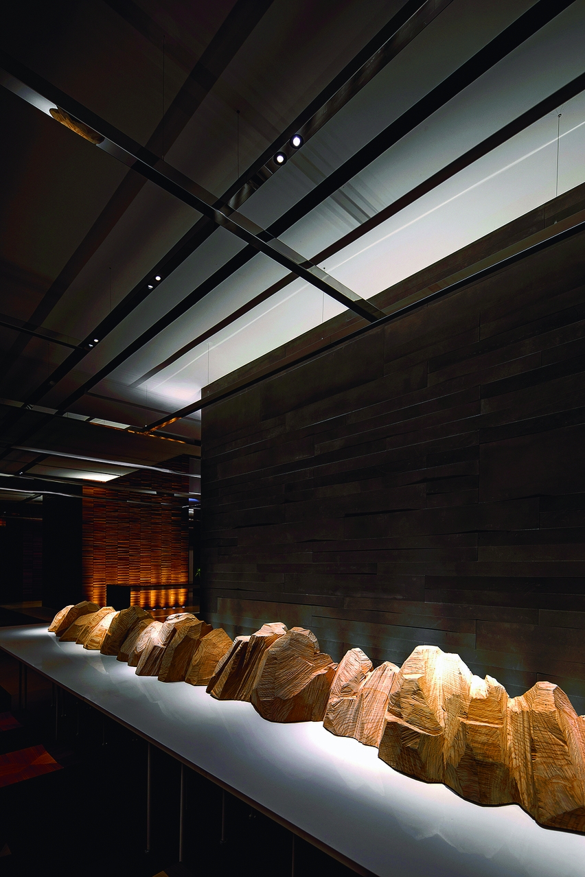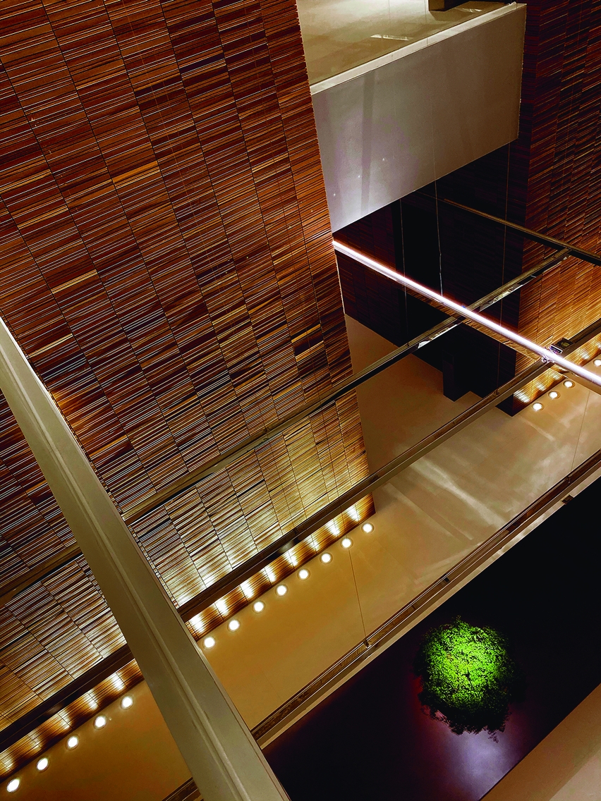 At large, the concealed LED strip embedding inside suspended steel rods create flowing halo. This will generally braided hierarchy ambient. Besides, this geometric network and vibrant coloured furnitures, makes visitors slip into the Bauhaus world unnoticed.