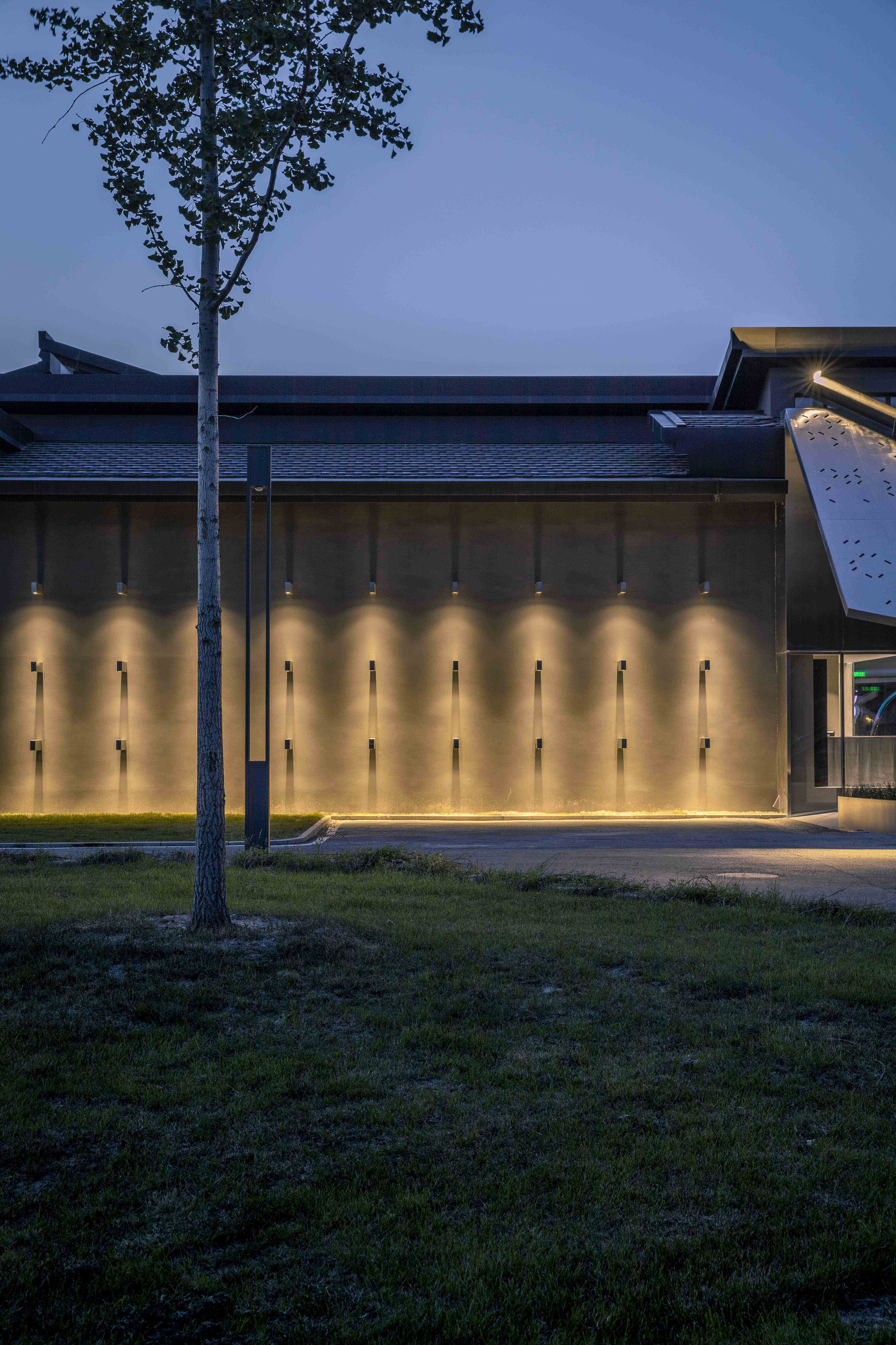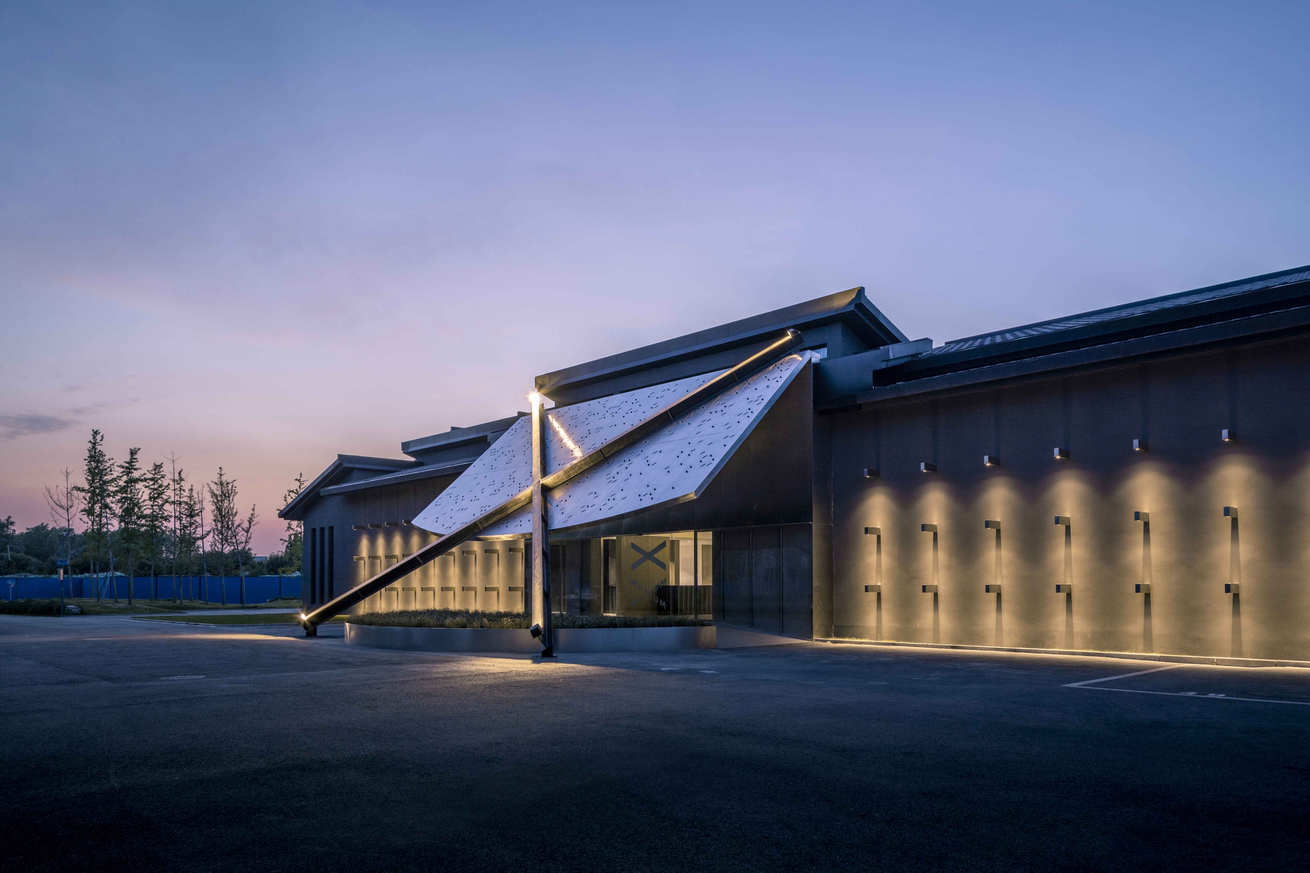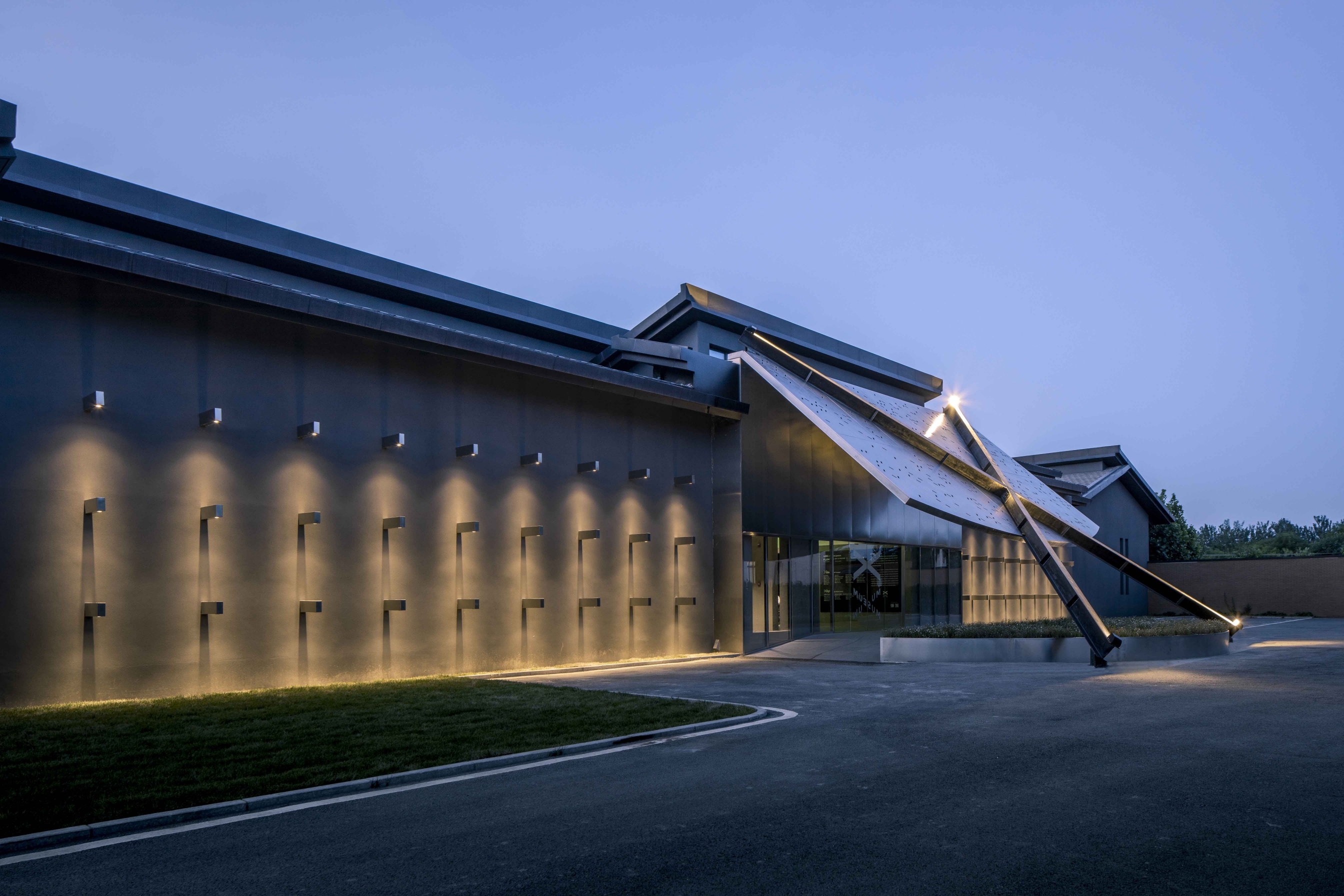 The lighting design was completed with ingenious details in the indoor and outdoor.The X-cross structure column at the entrance is illuminated at night with narrow beam spotlights from the four end points to the central point, highlighting the X geometry,and expressing the meaning of cultural exchange through the intersection of light.The shadows of the 54 rectangular light boxes on the south facade of the museum will change according to the sun exposure during the day,like a sundial that records the time.At night, the small spotlights recessed in the bottom of the light boxes can create new light and shadow patterns on the external wall.In the interior space,due to the unique structural design of the wall in the exhibition hall, the artwork can be hung in any gap on the wall through special metal clips. Therefore, the lighting design is arranged in the exhibition hall with track lights that can be adjusted at any angle. All forms of exhibits can be highlighted, creating the flexibility of the light environment.A long rectangular frosted glass customized lamp is placed on the central axis of the ceiling to provide even and soft ambient light for the overall space.
