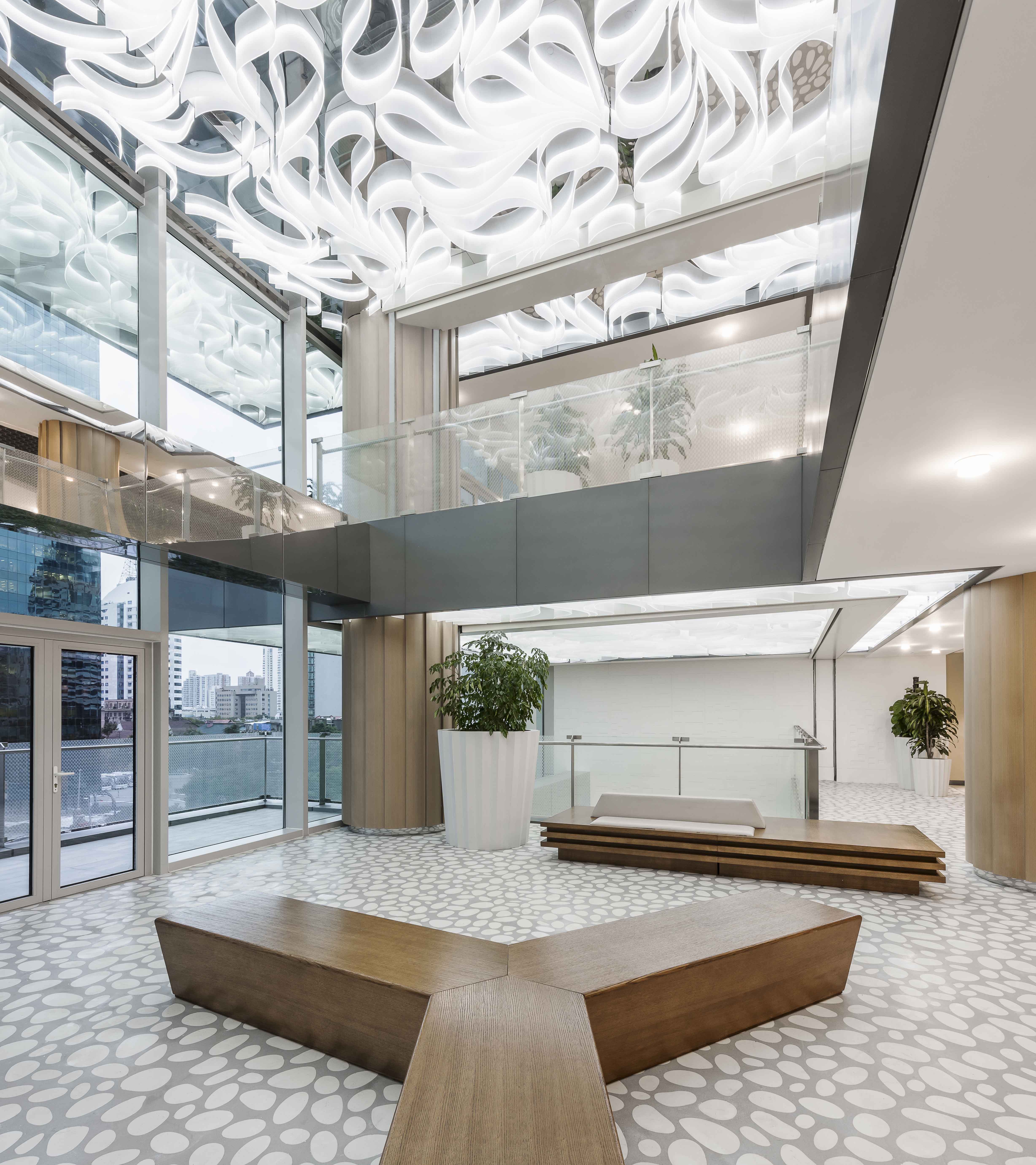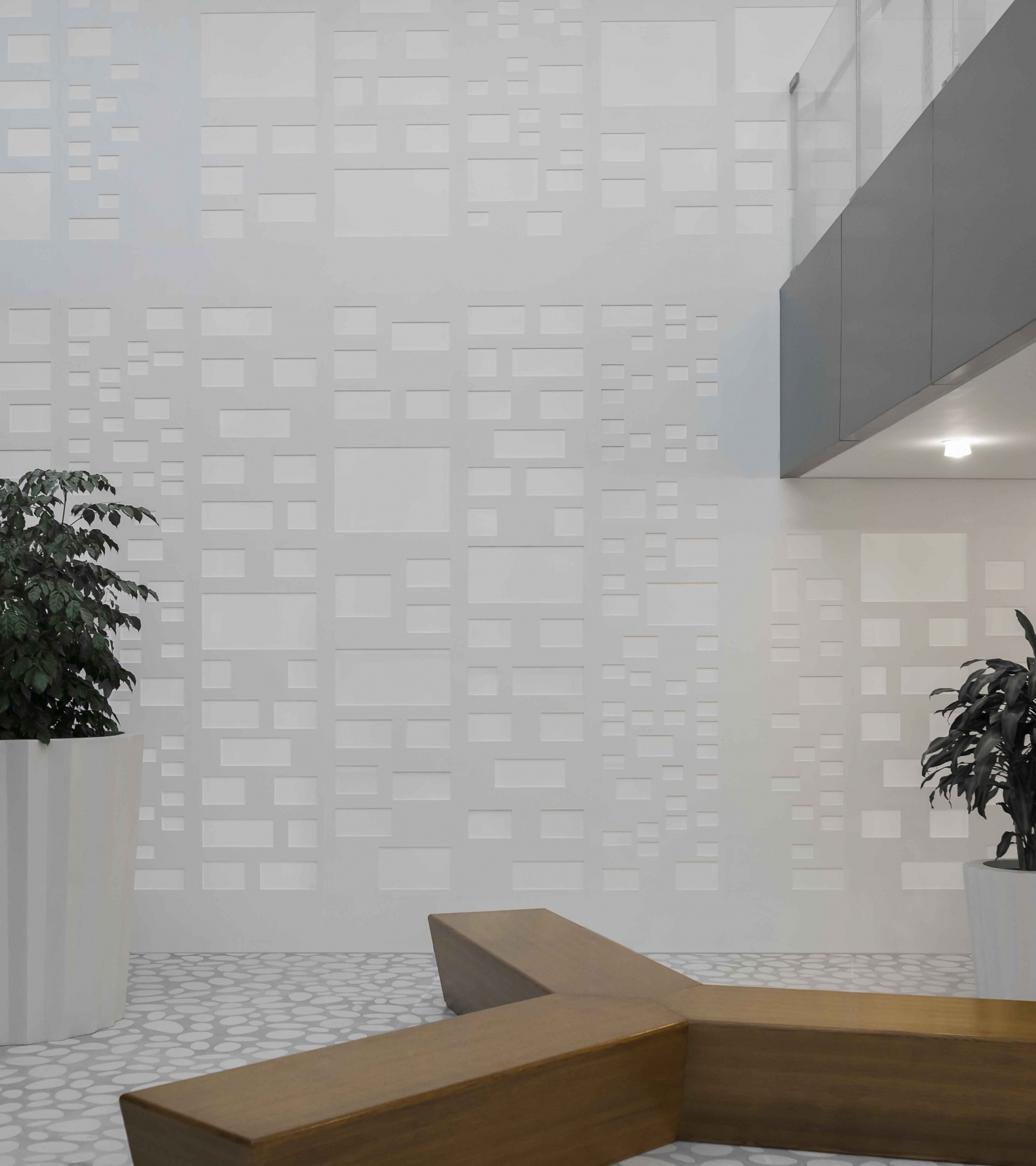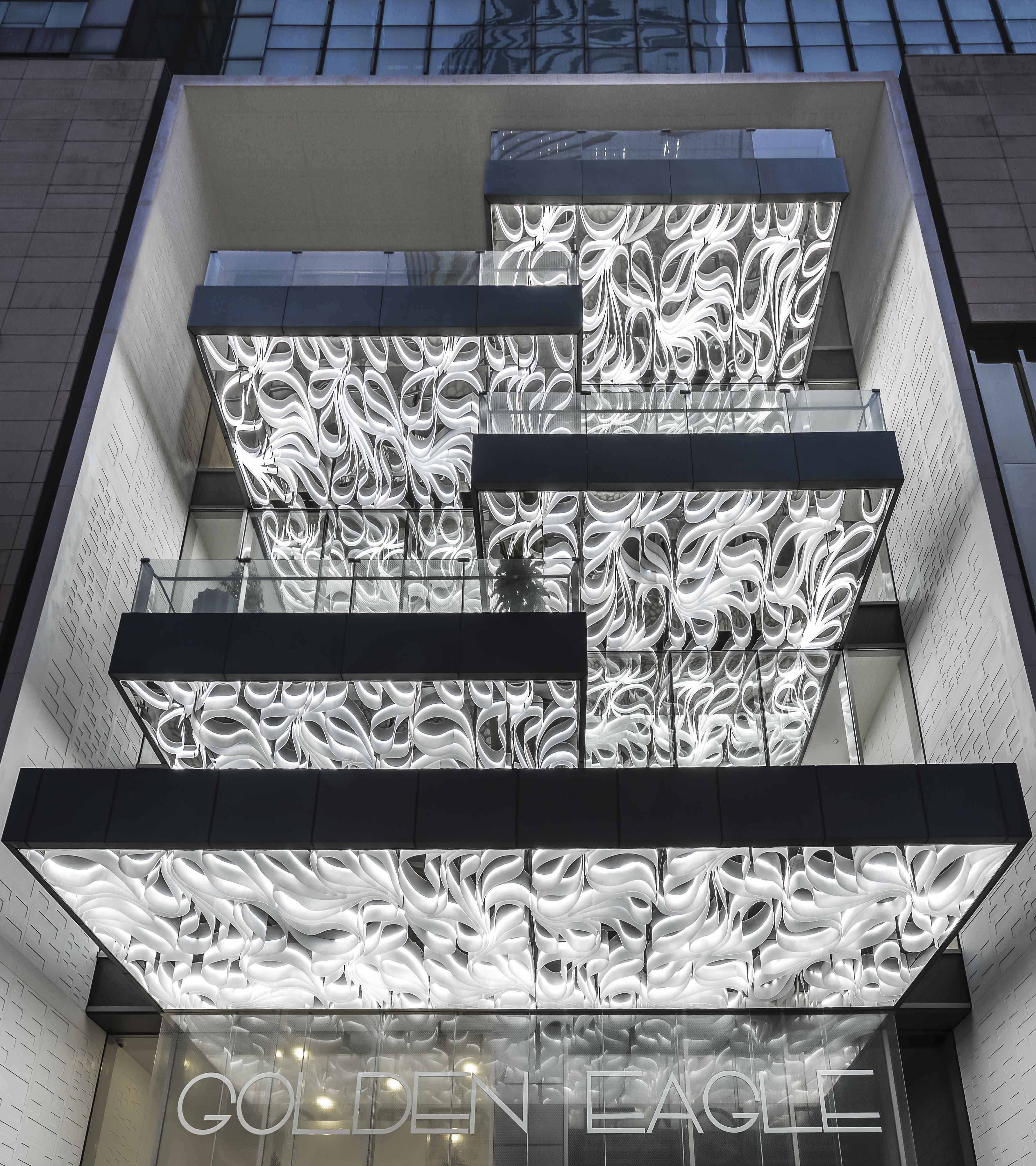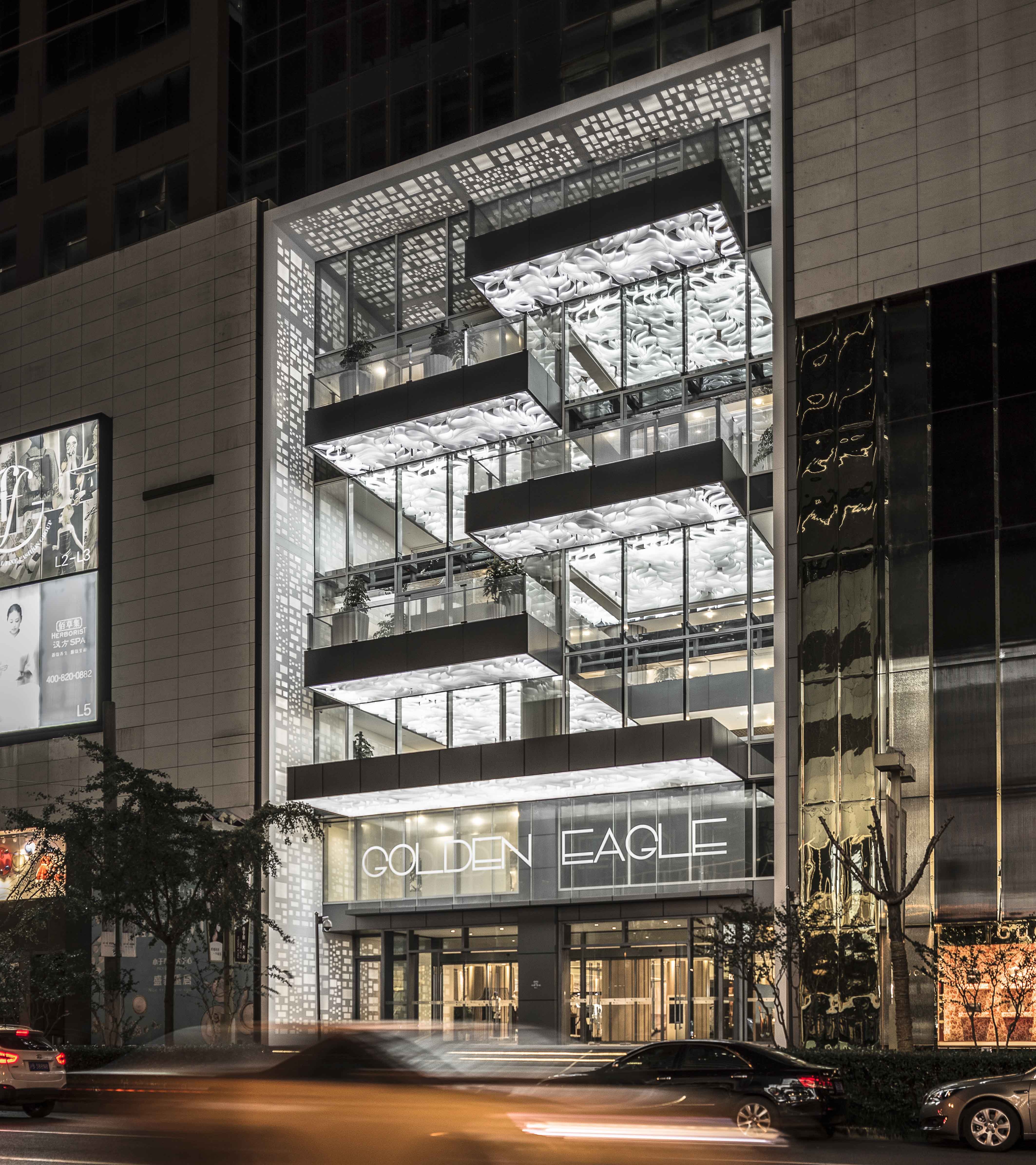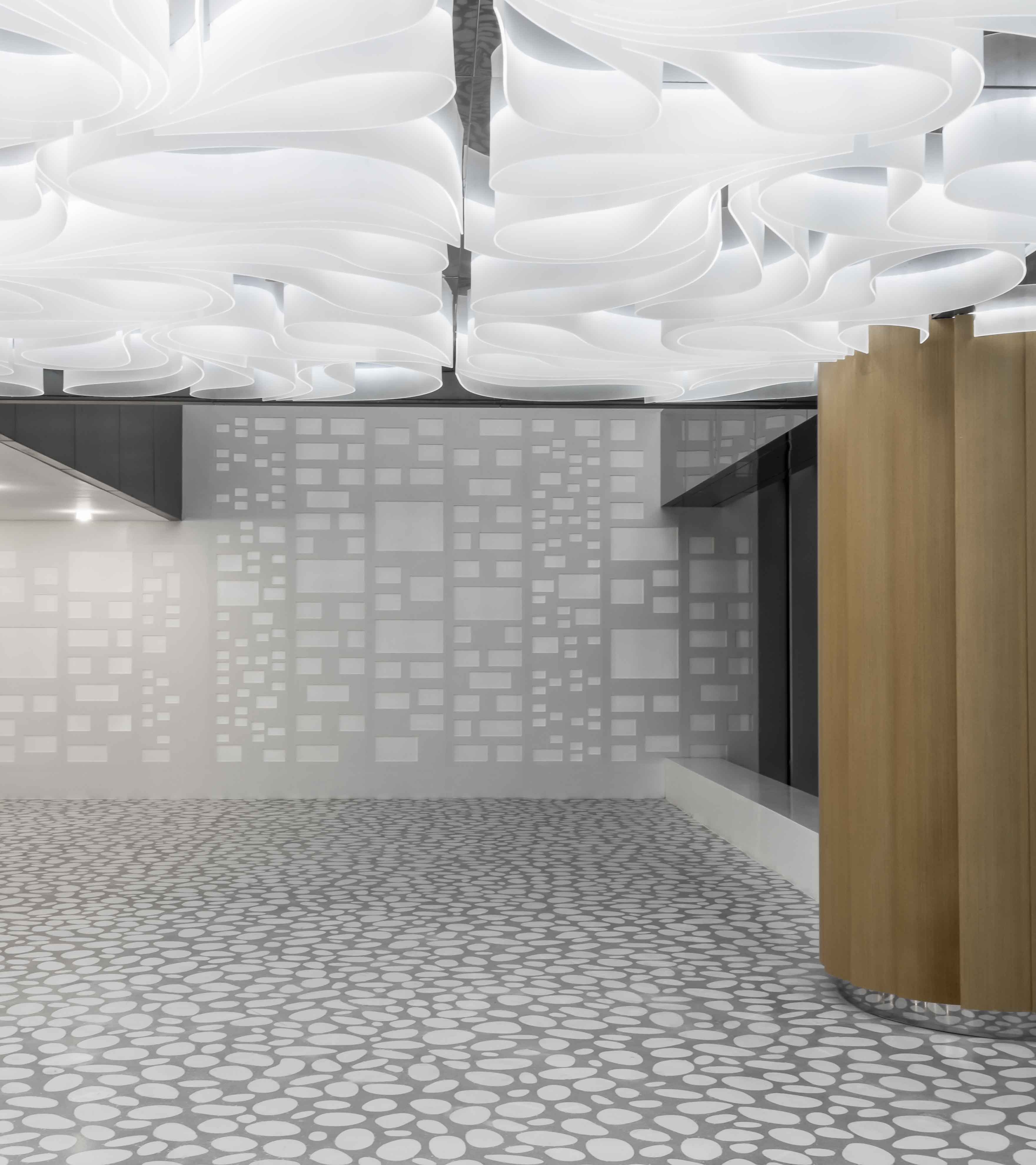 The original building entrance which faces North Shaanxi Road,although there is a form of a column span and 5-story height, it is actually only a single-story height.The second to the fourth floors are indented LED advertisements,completely lacking the atmosphere and scale of the entrance. In this renovation,the main entrance space was transformed into two spans of 18 meters wide,and the ground and second floors were retreated by 5 meters to form a tall and wide entrance square,attracting more people.In the glass volumes, petal-like curves are outlined with LED soft light strips,forming internal light and external transparency,giving the entire hall a strong sense of hierarchy.From the urban scale,the entrance space is integrated with the glass façade above,which leads to the roof,making the building more open,transparent and full of attraction.