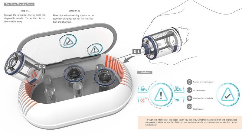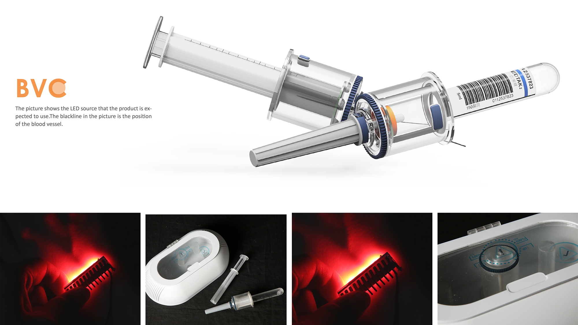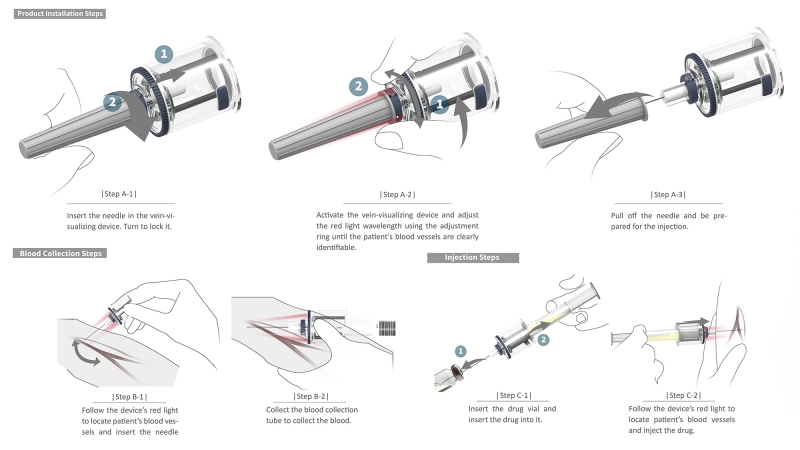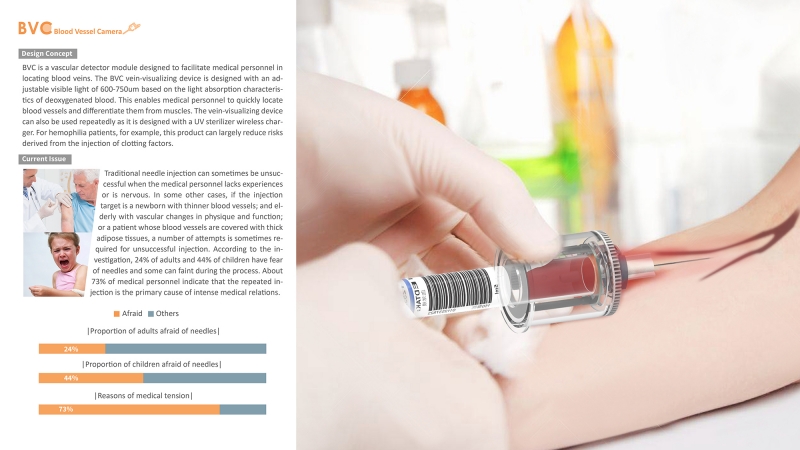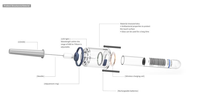 BVC is a vascular detector module designed to facilitate medical personnel in locating blood veins. The BVC vein-visualizing device is designed with an adjustable visible light of 600-750um based on the light absorption characteristics of deoxygenated blood. This enables medical personnel to quickly locate blood vessels and differentiate them from muscles. The vein-visualizing device can also be used repeatedly as it is designed with a UV sterilizer wireless charger. For hemophilia patients, for example, this product can largely reduce risks derived from the injection of clotting factors.