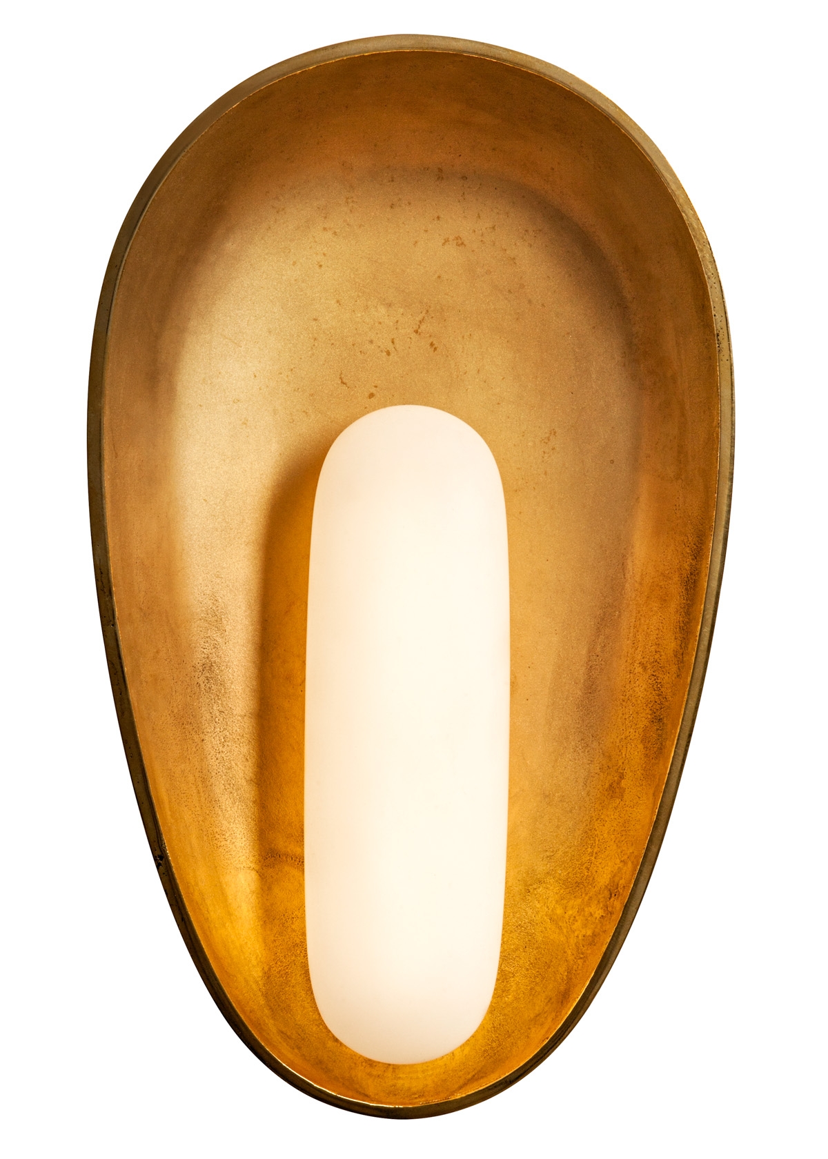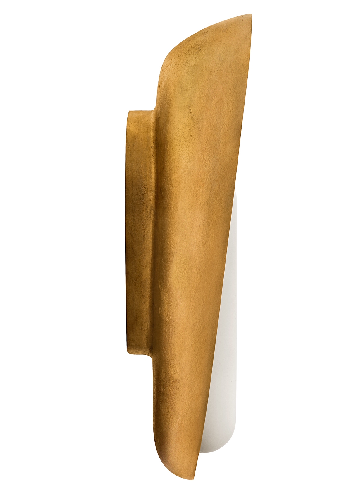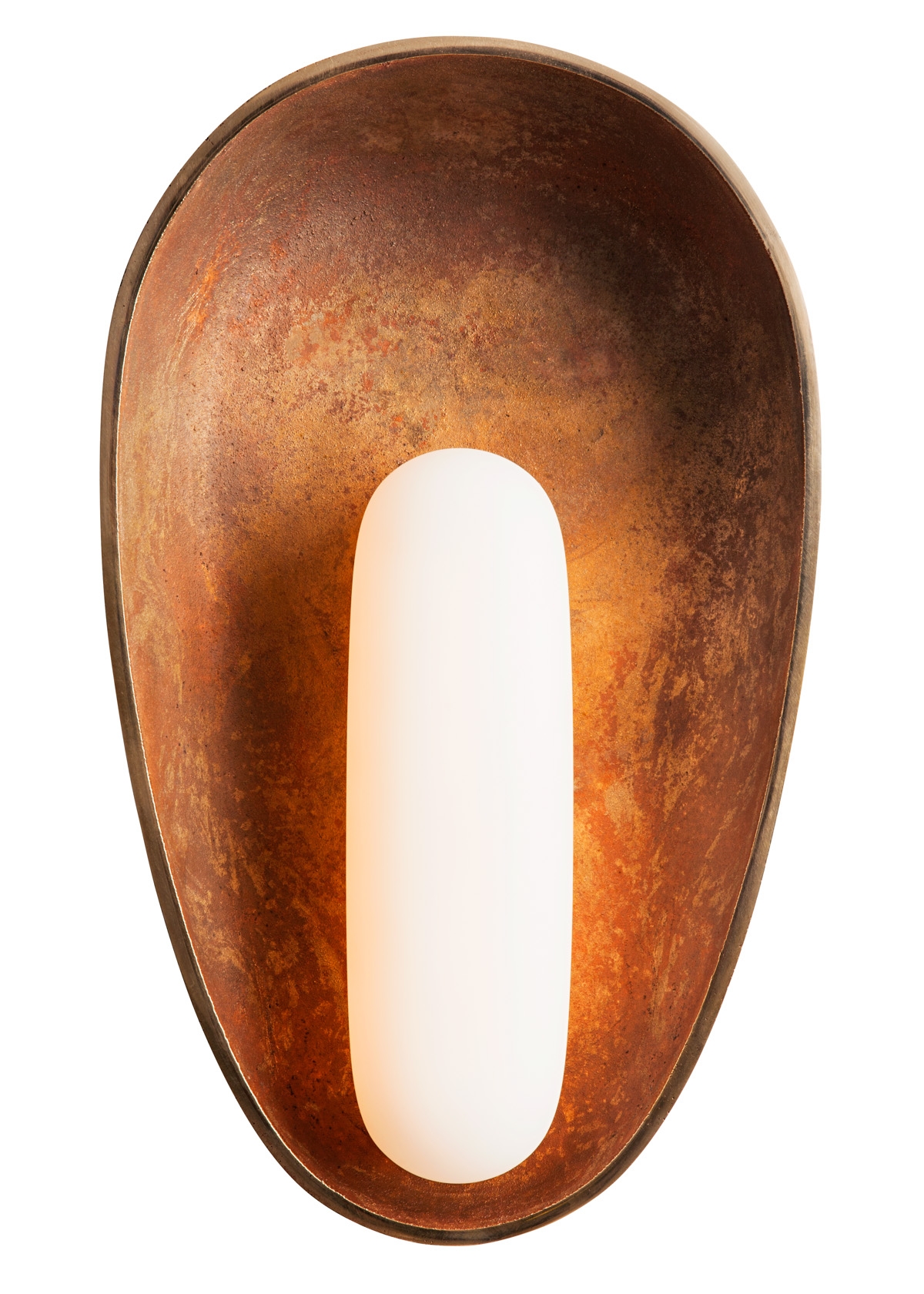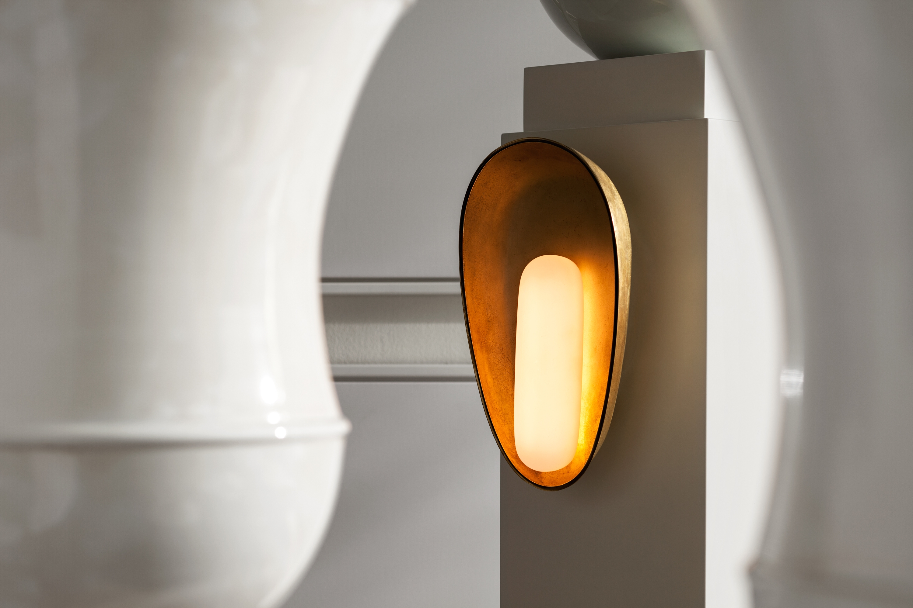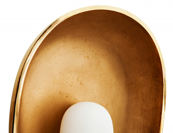 Since contrast was such an essential ingredient in the Mother Mary Sconce’s makeup, careful material selection, and the union between the chosen materials was paramount. The shade is fabricated from porous sand-cast metal, specifically brass, bronze, or aluminum. This is paired with a sleek resin bulb which is poured via the modern technique of silicone slip-casting. A highly refined, polished lip on the shade’s edge helps to coalesce the pitted nature of the metal with the sculptural smooth bulb.