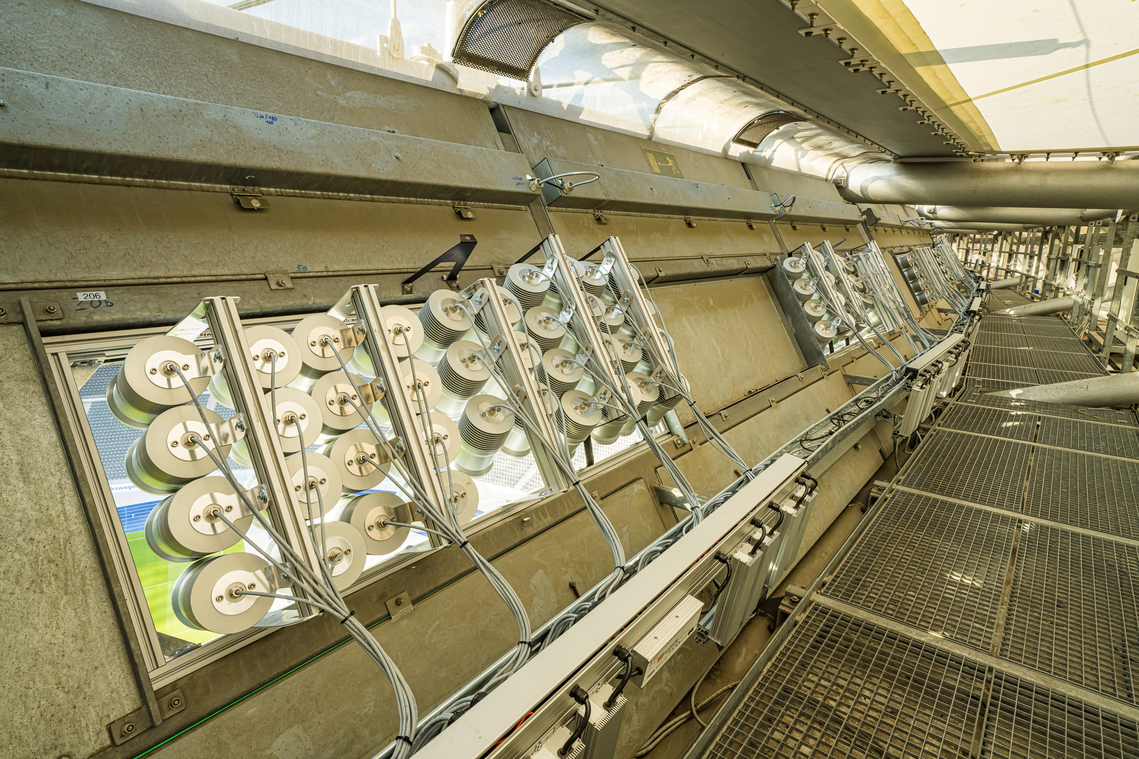 The lighting system of Berlin Olympic stadium puts its focus on optical variety. A special highlight is the full-color LED floodlight system which is the first in a stadium worldwide. A unique and colorful architectural lighting was also installed. This includes the so-called “membrane lighting”, built into the stadium roof, and the effect lighting “Ring of Fire”.