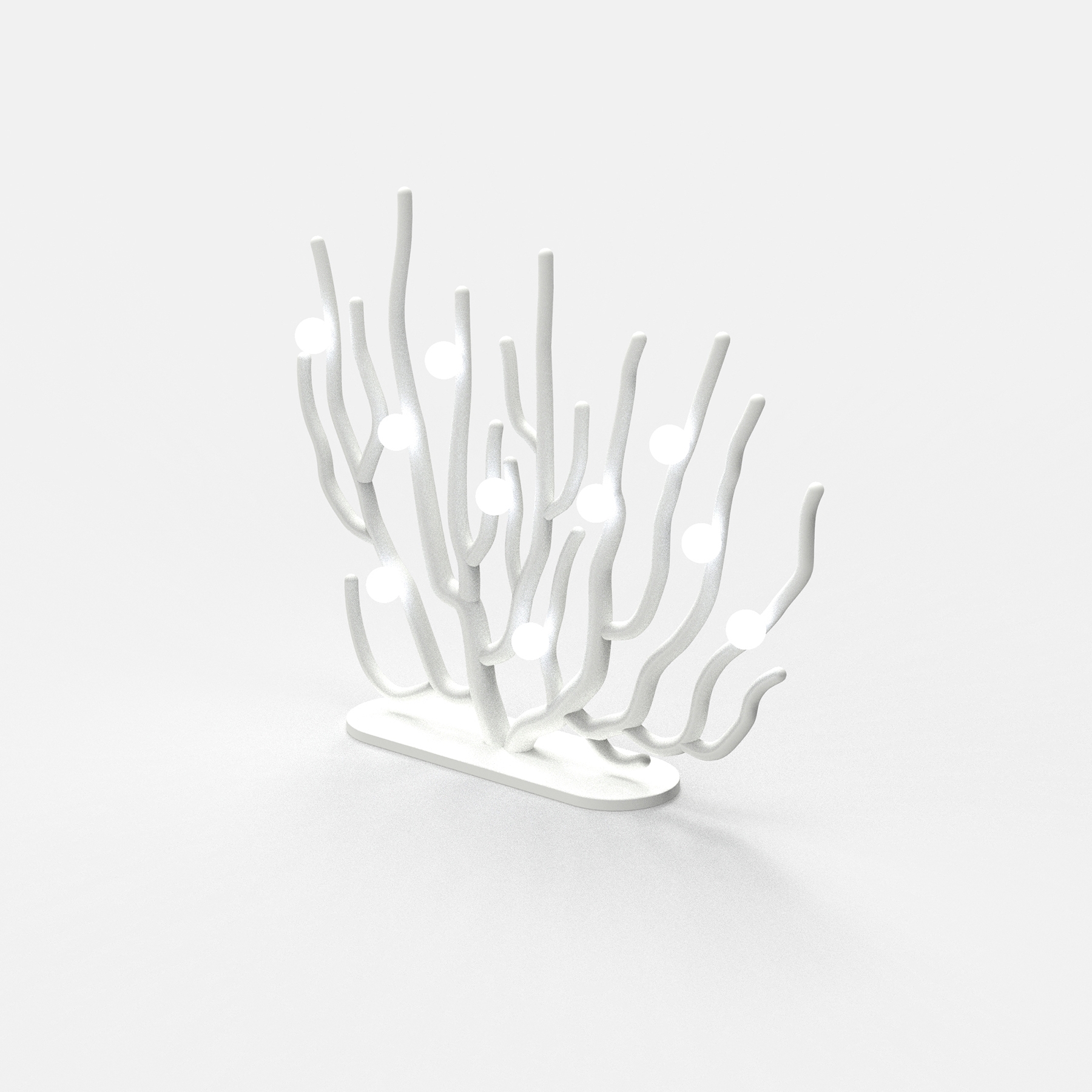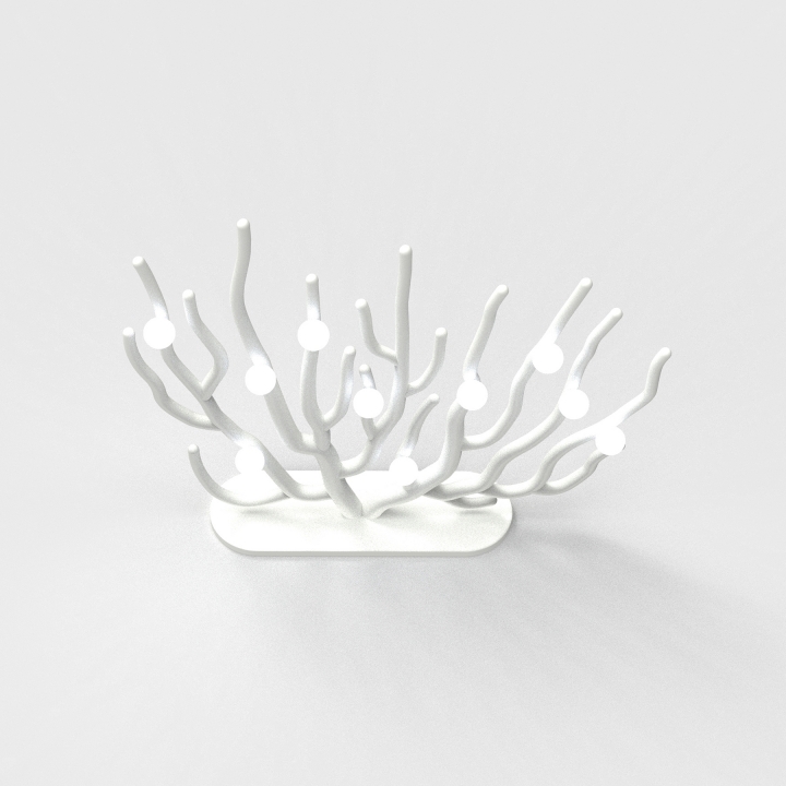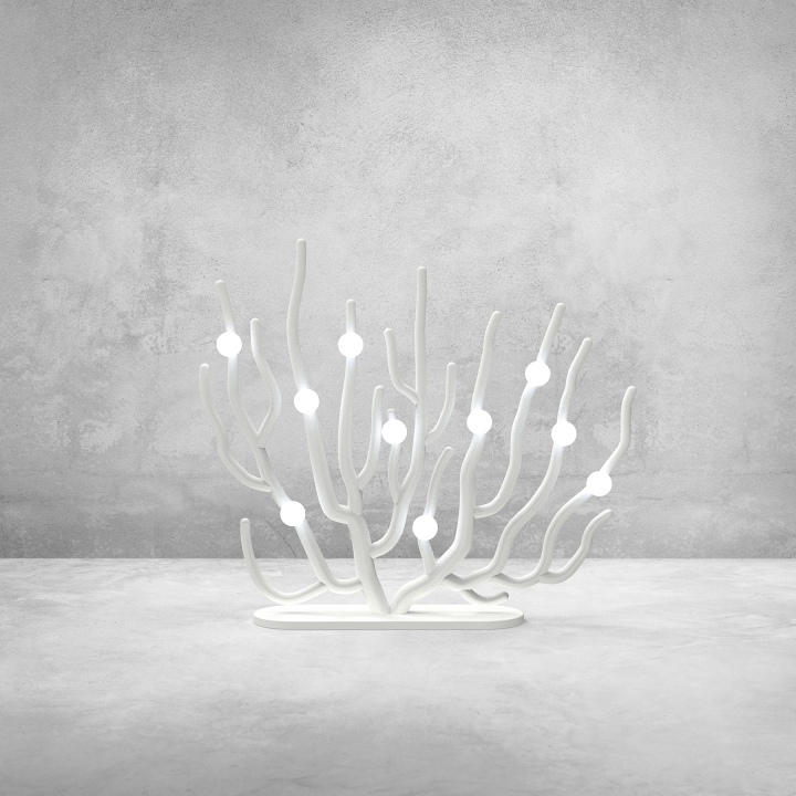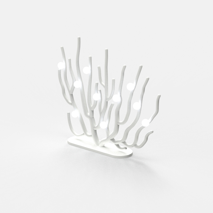 Coral Blanche can be ideally placed for floor lighting or wall lighting. The structure (biodegradable blends) is designed to be a bleached sea fan coral, and ten LED bulbs are affixed to the structure. The light bulbs represent eggs laid by coral fishes. These eggs light up their lives while being exposed to potential threats as their cradles are rapidly perished.
