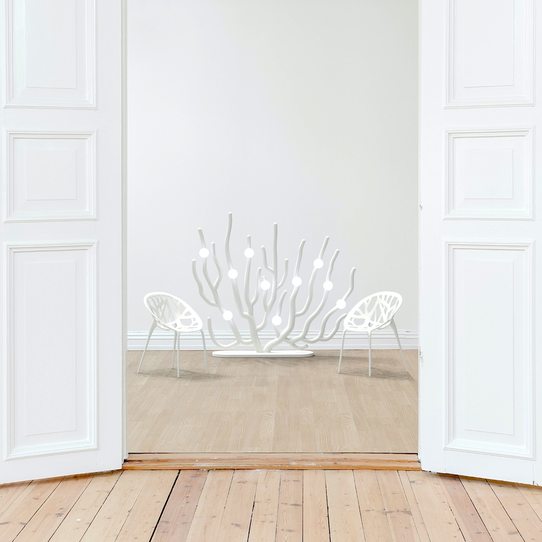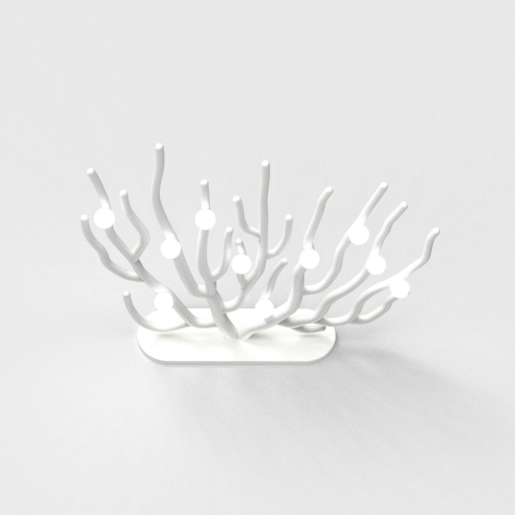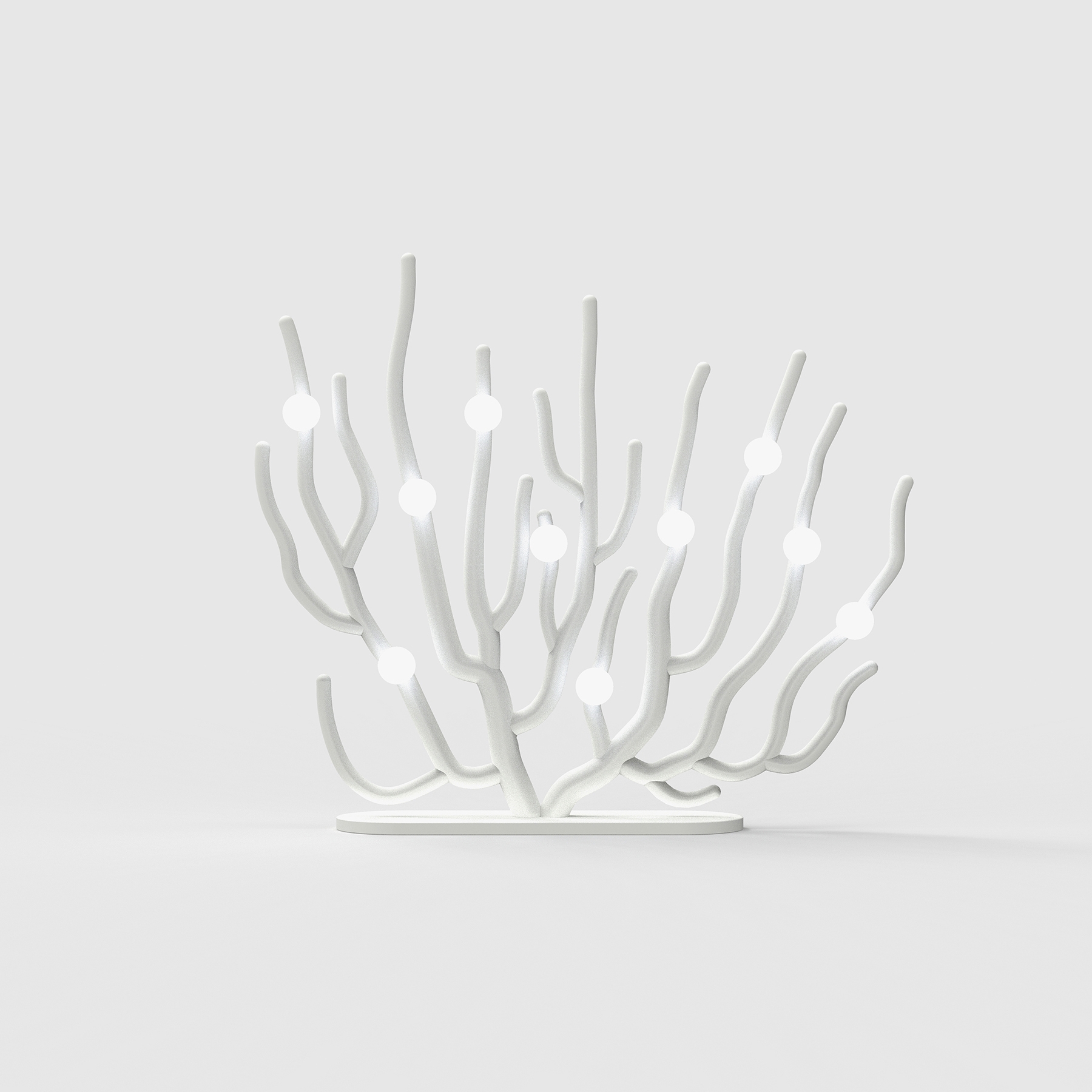 Coral Blanche can be ideally placed for floor lighting or wall lighting. The structure (biodegradable blends) is designed to be a bleached sea fan coral, and ten LED bulbs are affixed to the structure. The light bulbs represent eggs laid by coral fishes. These eggs light up their lives while being exposed to potential threats as their cradles are rapidly perished.