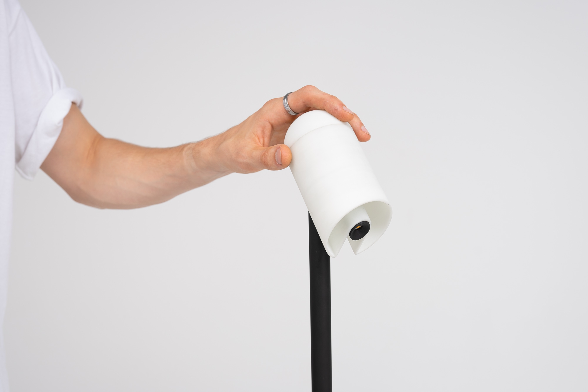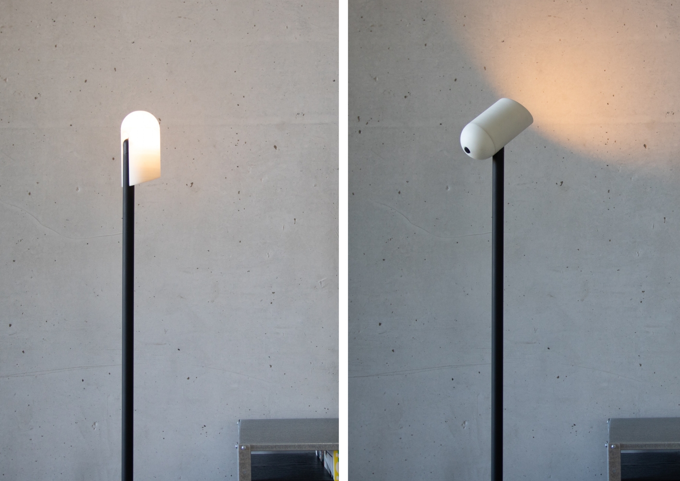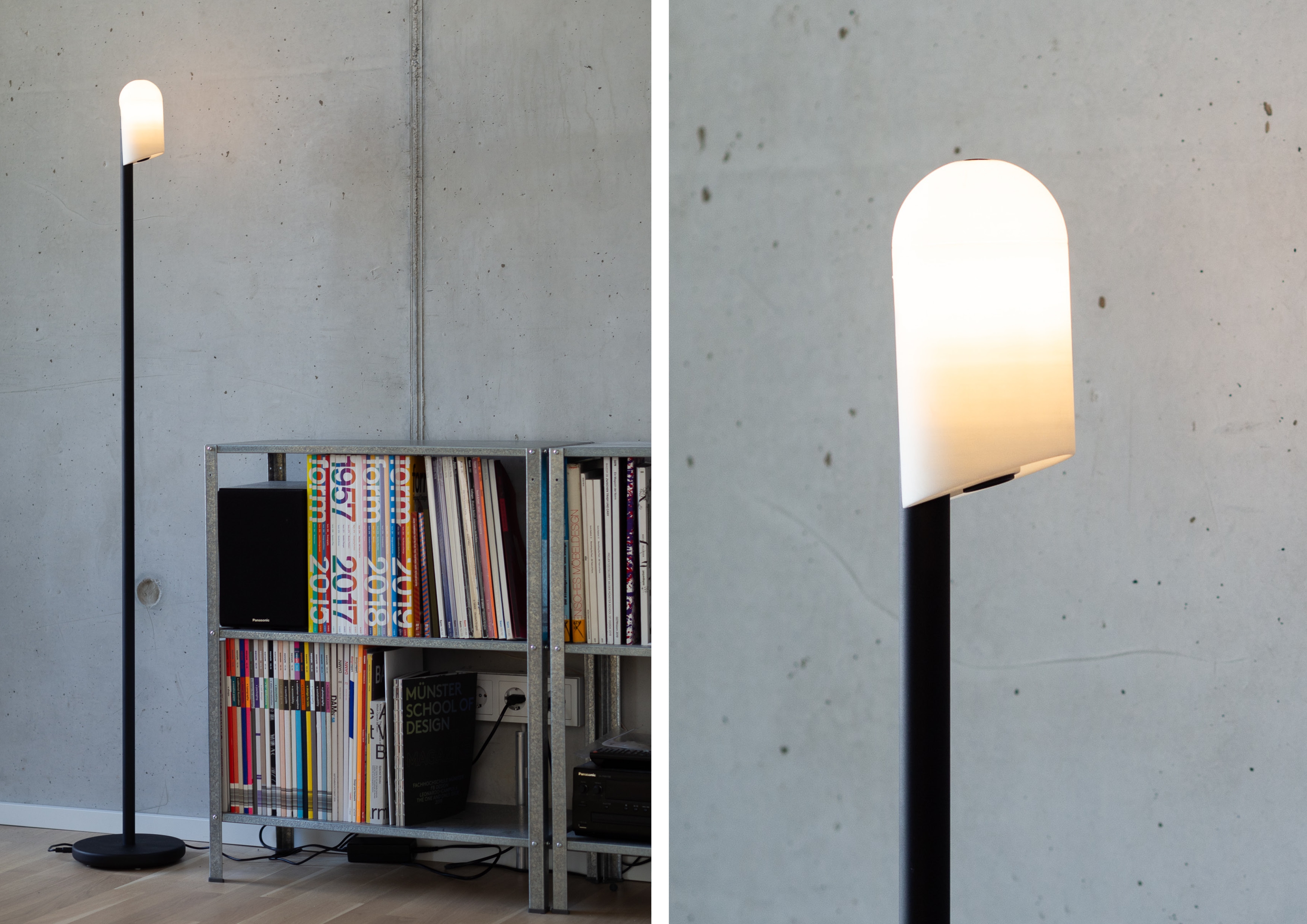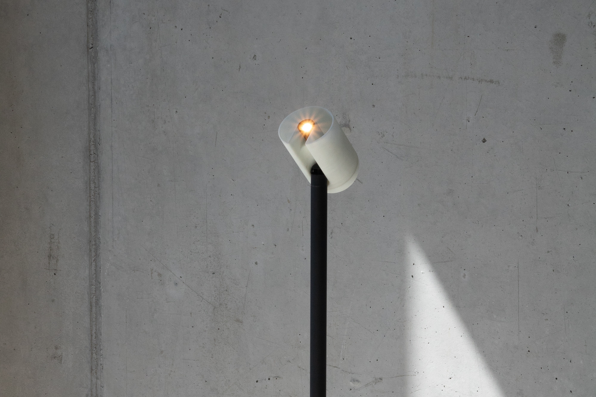 modi is a multifunctional floor lamp, that is able to create both a direct light beam and a pleasant, diffuse glow. To switch between the two modes, the user just has to fold the lamps body up or down. While being in the down-position, the whole lamp body glows. When being folded out, the direct light is activated. This allows the lamp, to be used in a variety of different scenarios, either alone or in a group of people. Modi is also battery-powered and can be carried around at home easily.