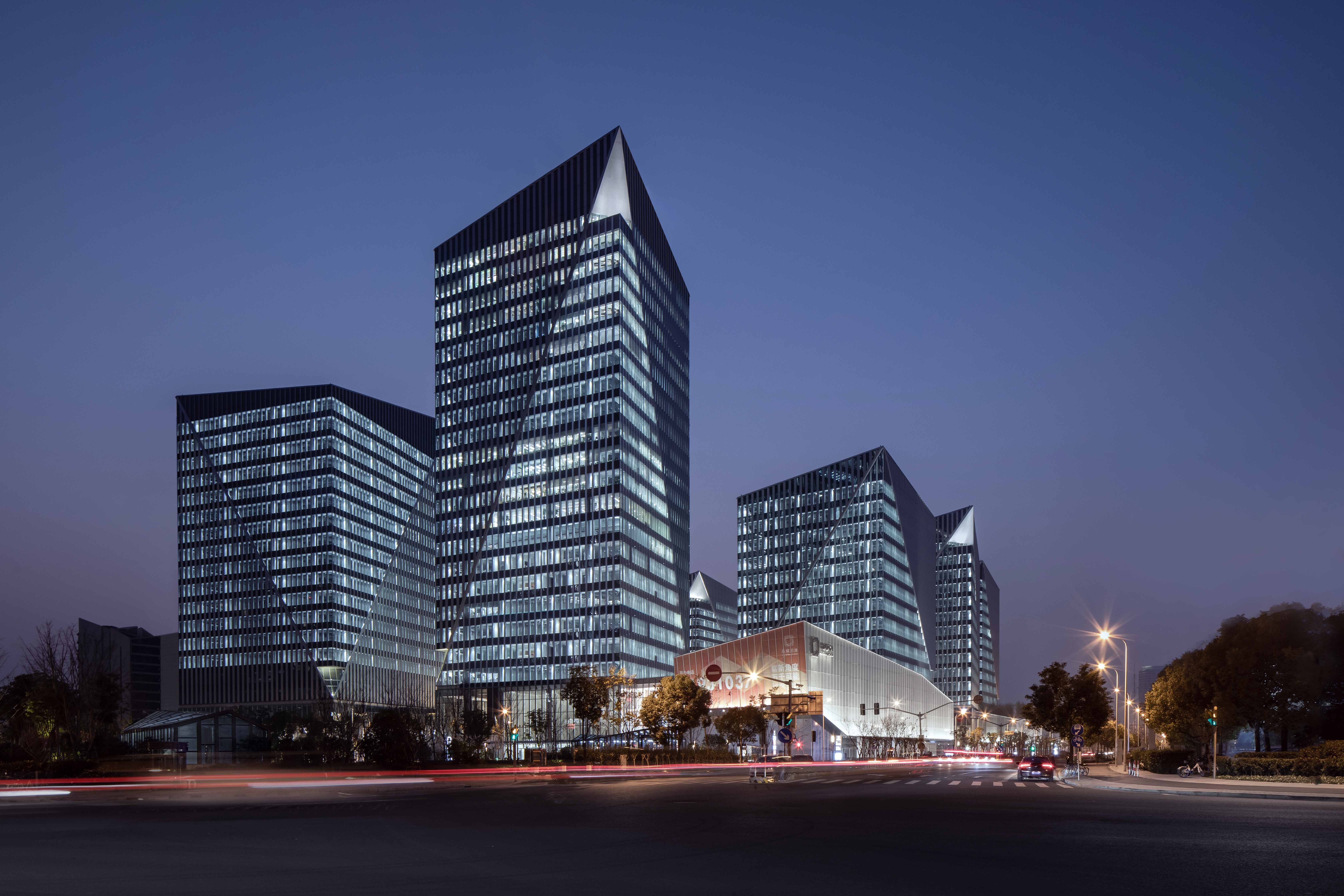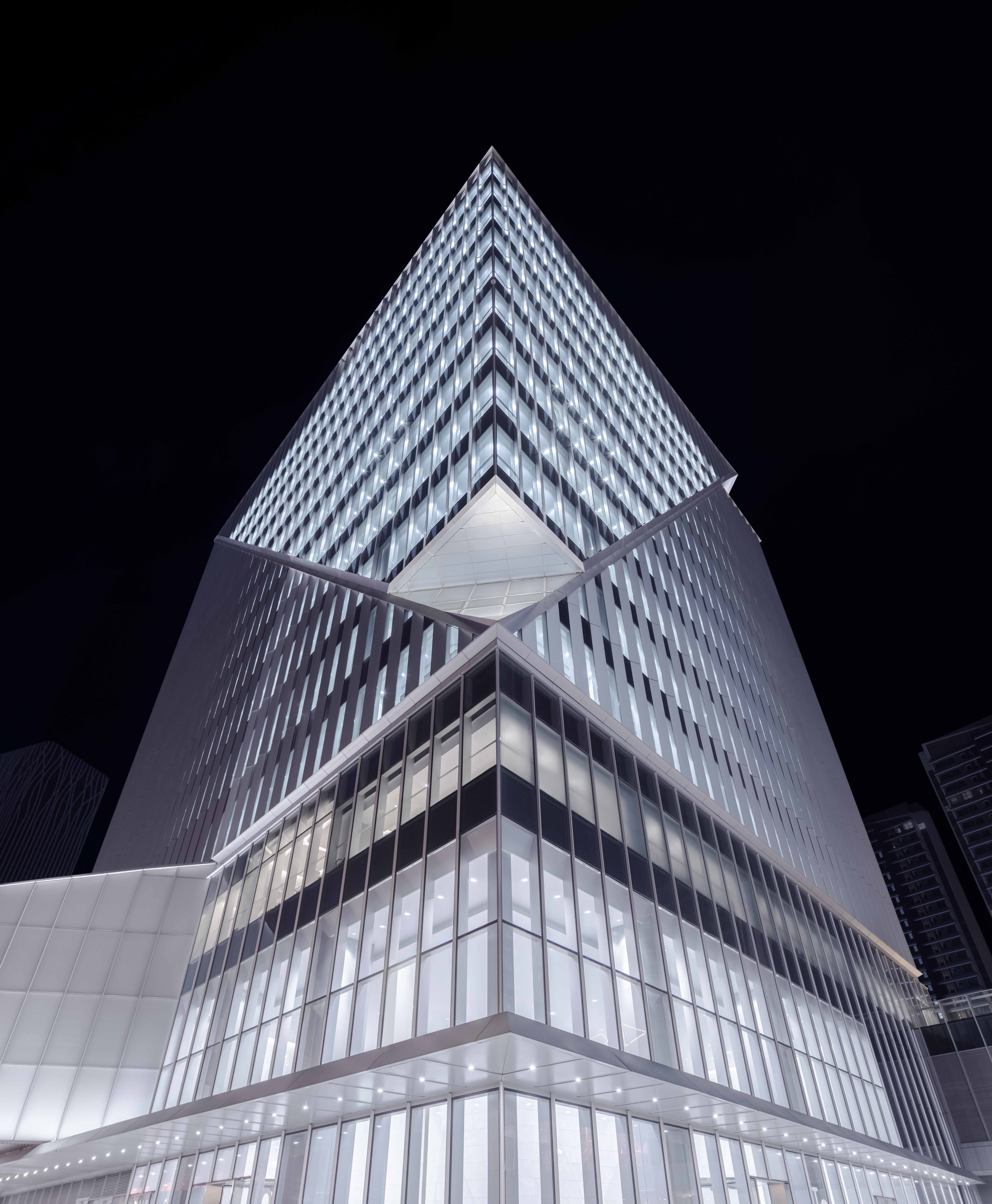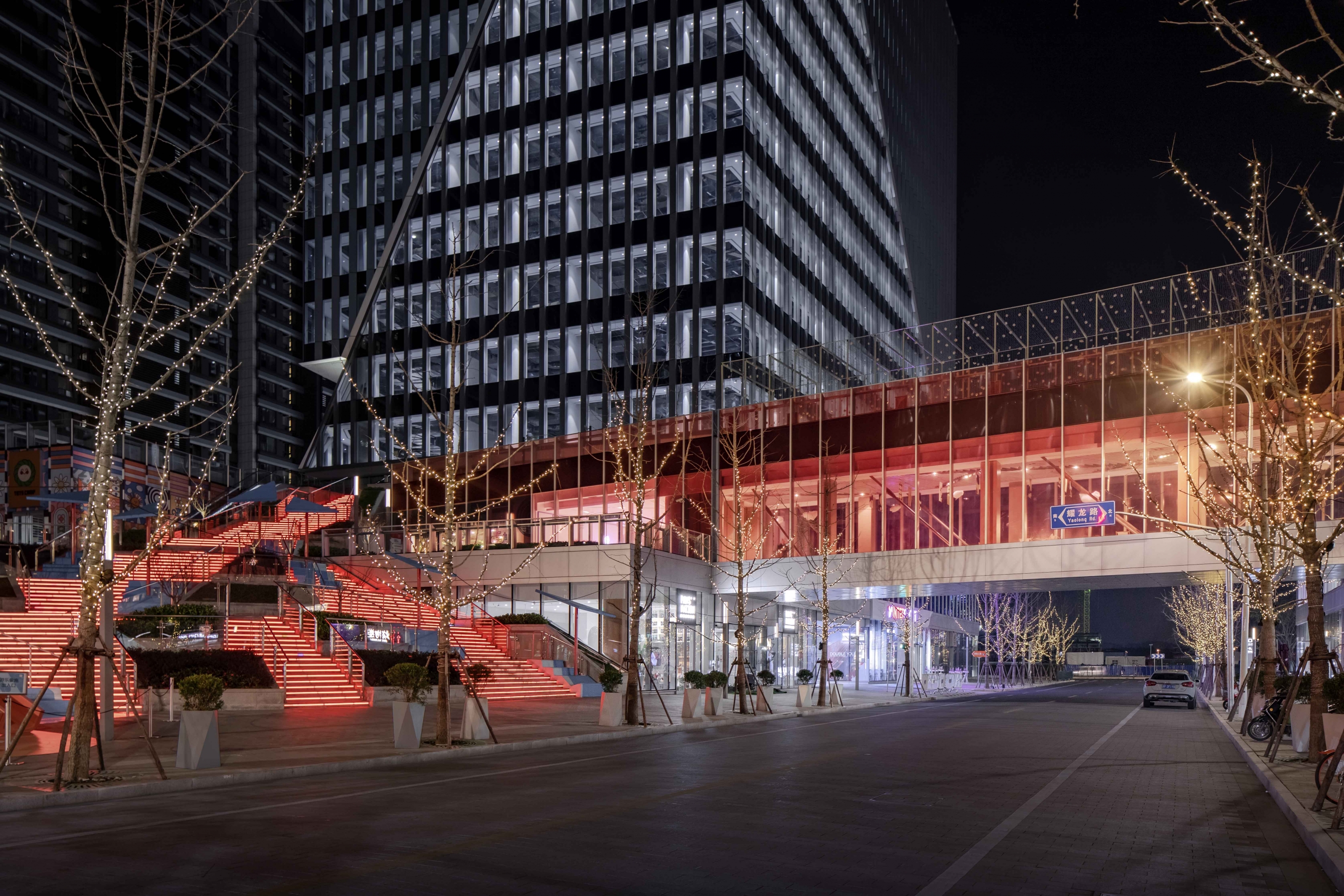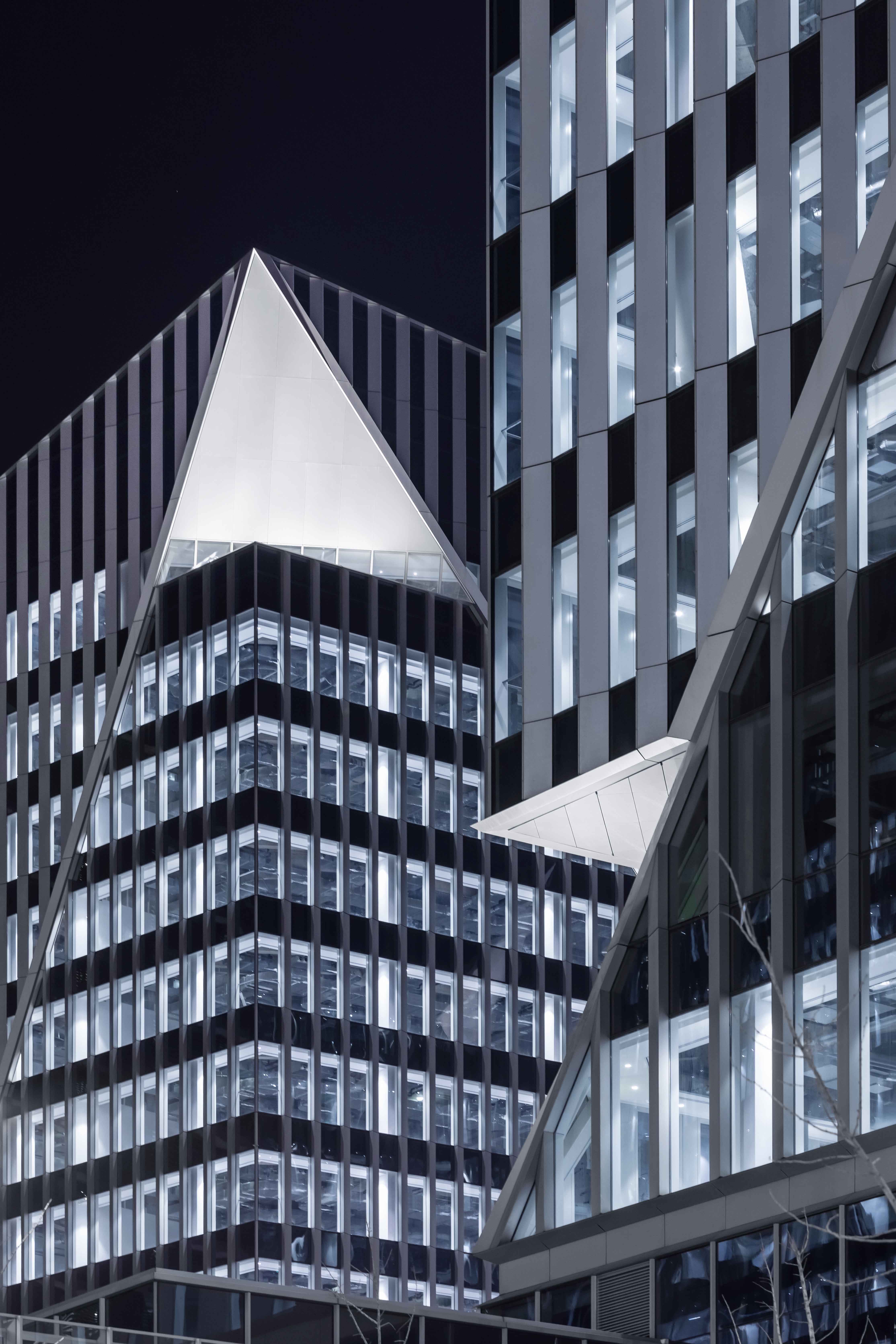 The notches at the top of each office building are illuminated elaborately by 6-8 sets of high-power flood lights with different beam angles.The crystalline podiums with white translucent curtain walls, more than 15 meters high,are brightened by the ultra-narrow angle linear wall washer which hidden in the troughs at the bottom.Some linear wall washers are installed parallel to the ground, the others are customed with chips specifically designed to achieve the same uplighting effects when installed at a certain tilt angle,following the bottom line of the podiums.At the same time,the triangular lighting slots integrated with the curtain wall conceals a group of small spotlights which light up the small notches at the bottom, echoing the top of the towers.Sequenced high-quality downlights provide functional lighting for office canopies and bridges.In the lobby on the first floor of the office, spotlights and wall-washing lights arranged in the rear are precisely calculated to create crystal clear interior spaces