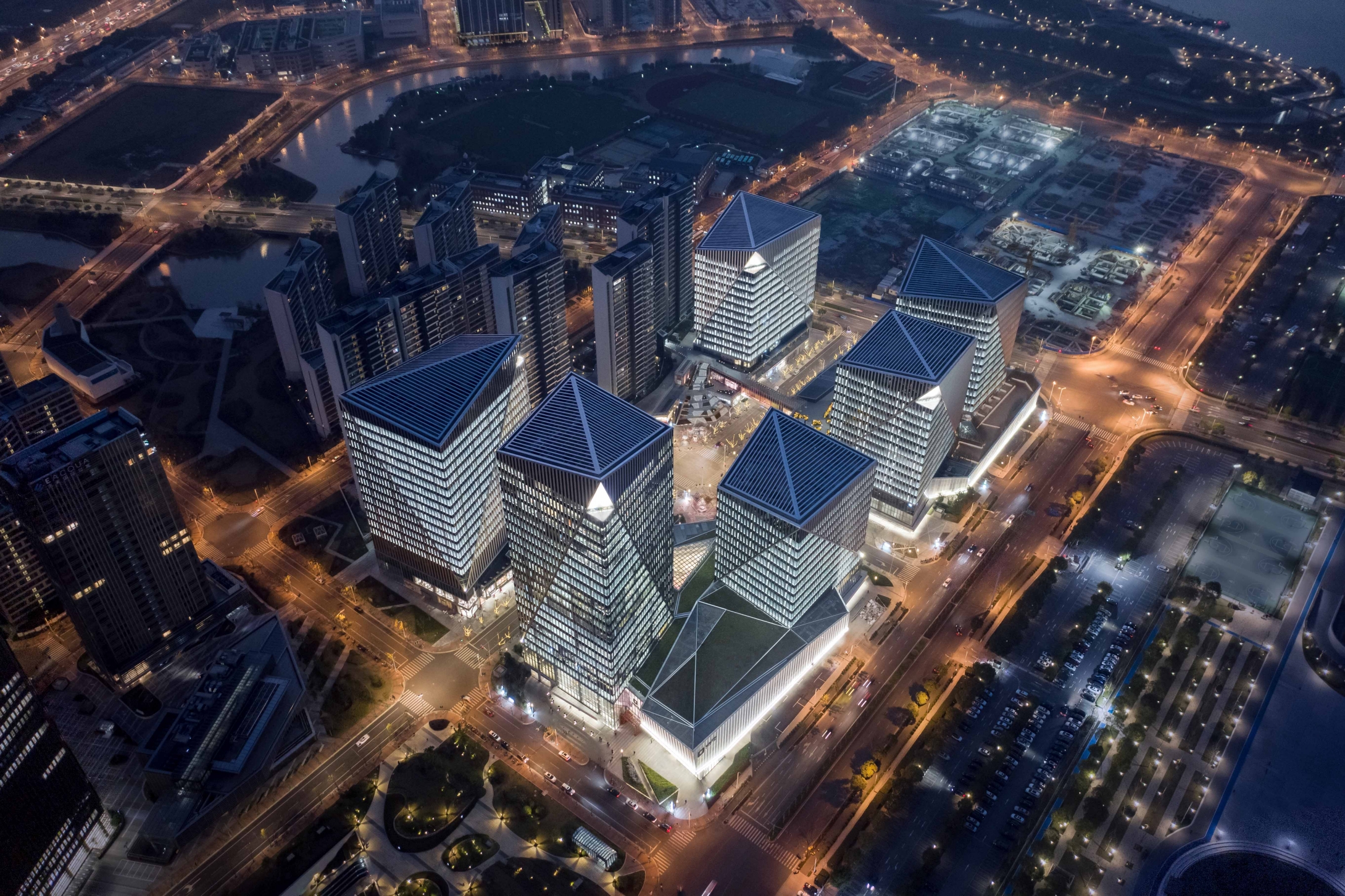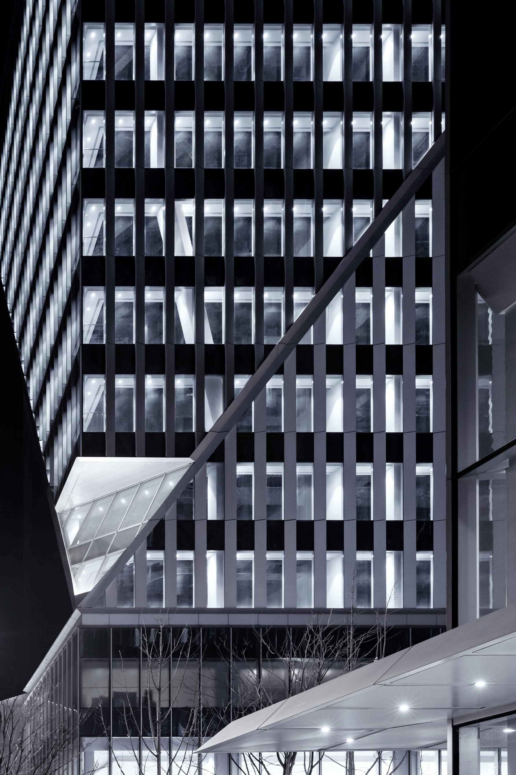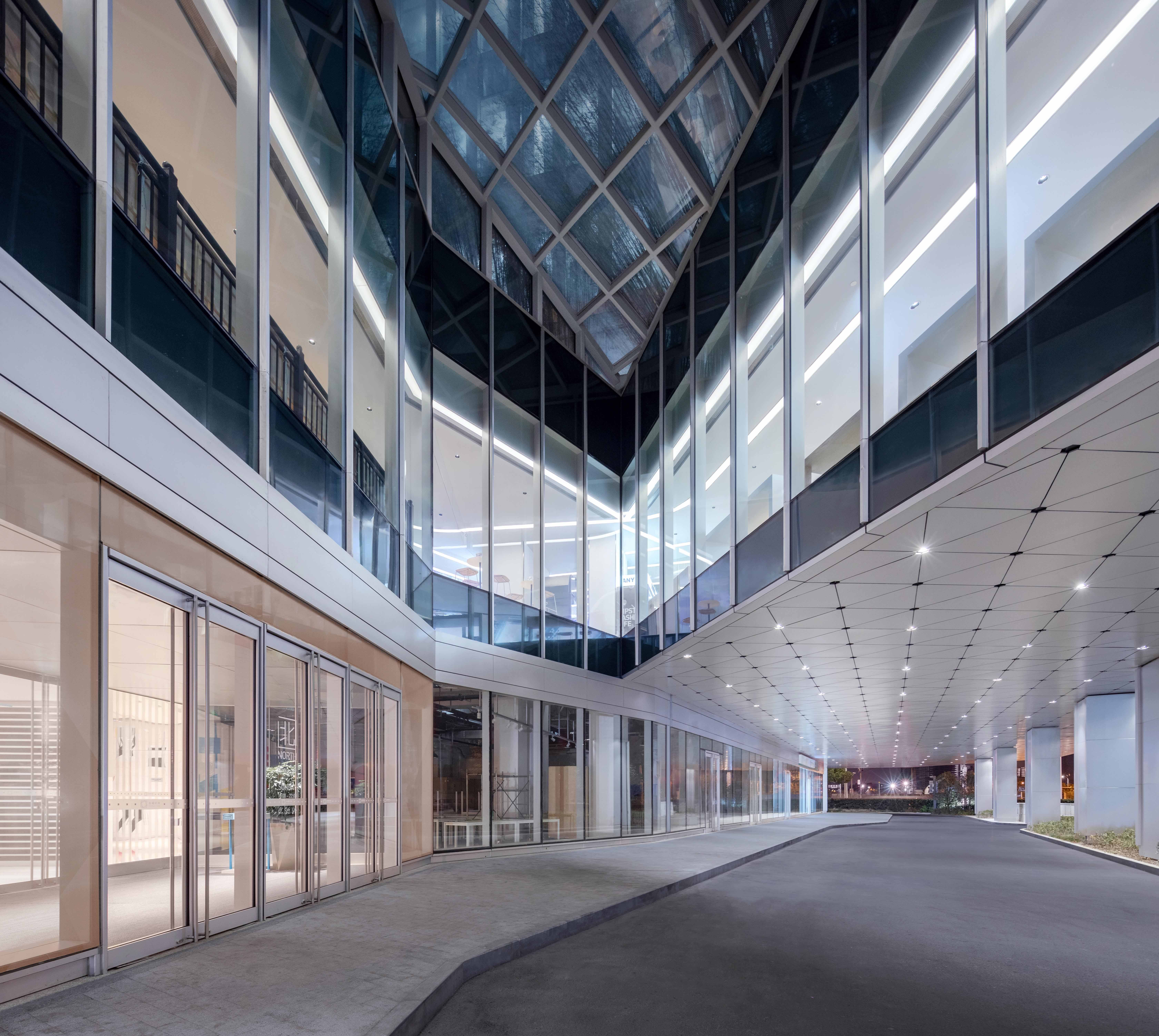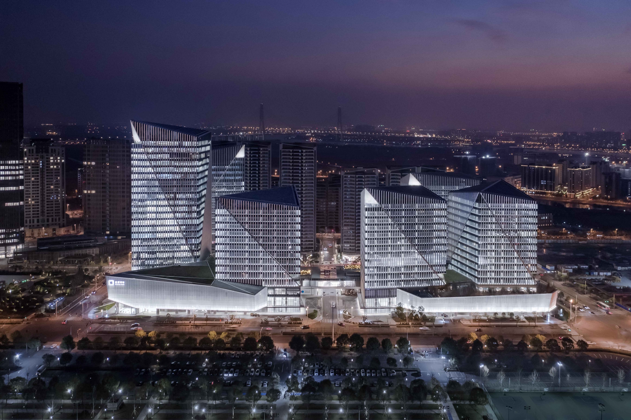 The notches at the top of each office building are illuminated elaborately by 6-8 sets of high-power flood lights with different beam angles.The crystalline podiums with white translucent curtain walls, more than 15 meters high,are brightened by the ultra-narrow angle linear wall washer which hidden in the troughs at the bottom.Some linear wall washers are installed parallel to the ground, the others are customed with chips specifically designed to achieve the same uplighting effects when installed at a certain tilt angle,following the bottom line of the podiums.At the same time,the triangular lighting slots integrated with the curtain wall conceals a group of small spotlights which light up the small notches at the bottom, echoing the top of the towers.Sequenced high-quality downlights provide functional lighting for office canopies and bridges.In the lobby on the first floor of the office, spotlights and wall-washing lights arranged in the rear are precisely calculated to create crystal clear interior spaces