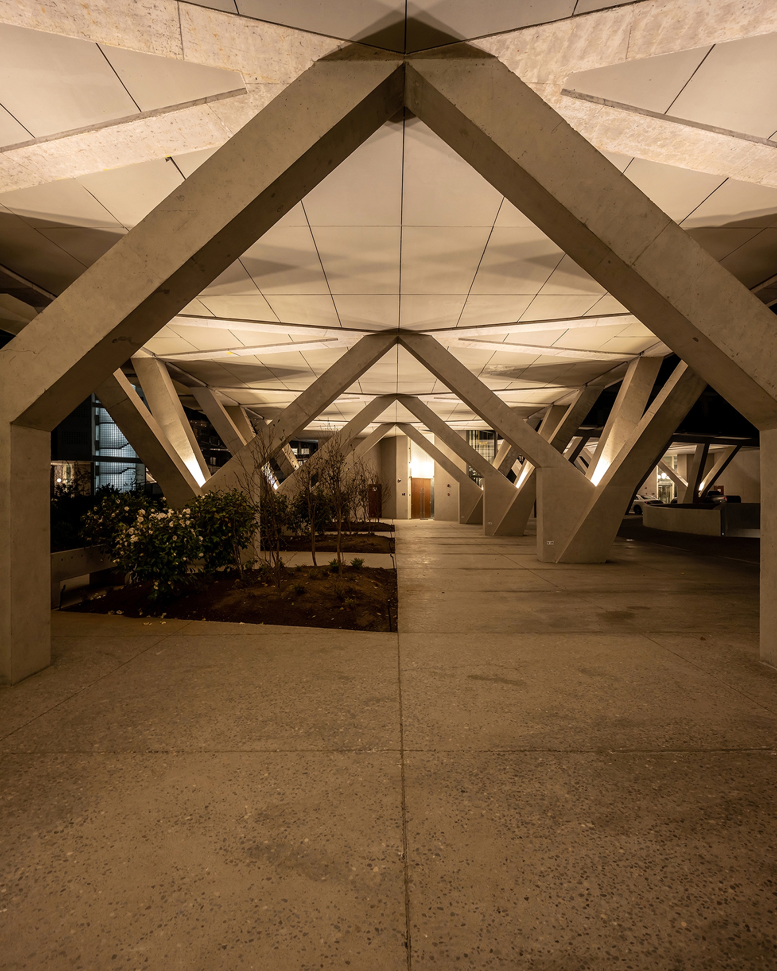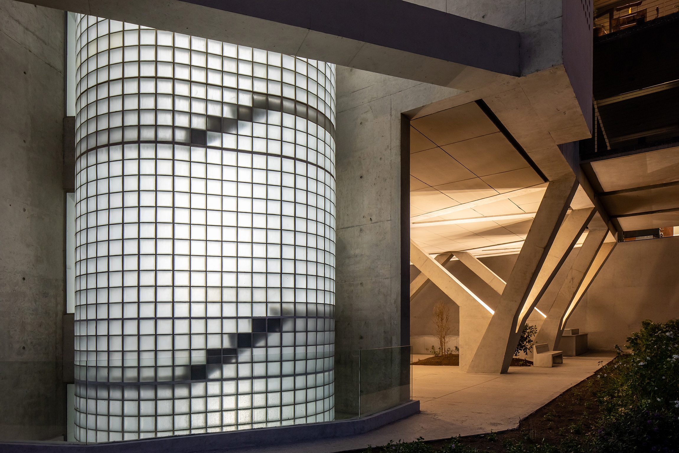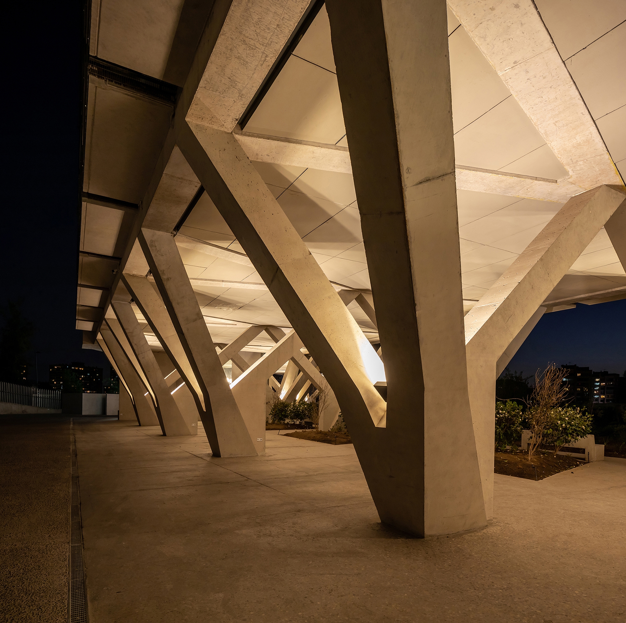 Our objective was to achieve an indirect lighting effect from the concrete pillars that would give a welcoming and confortable atmosphere and at the same time underline the
