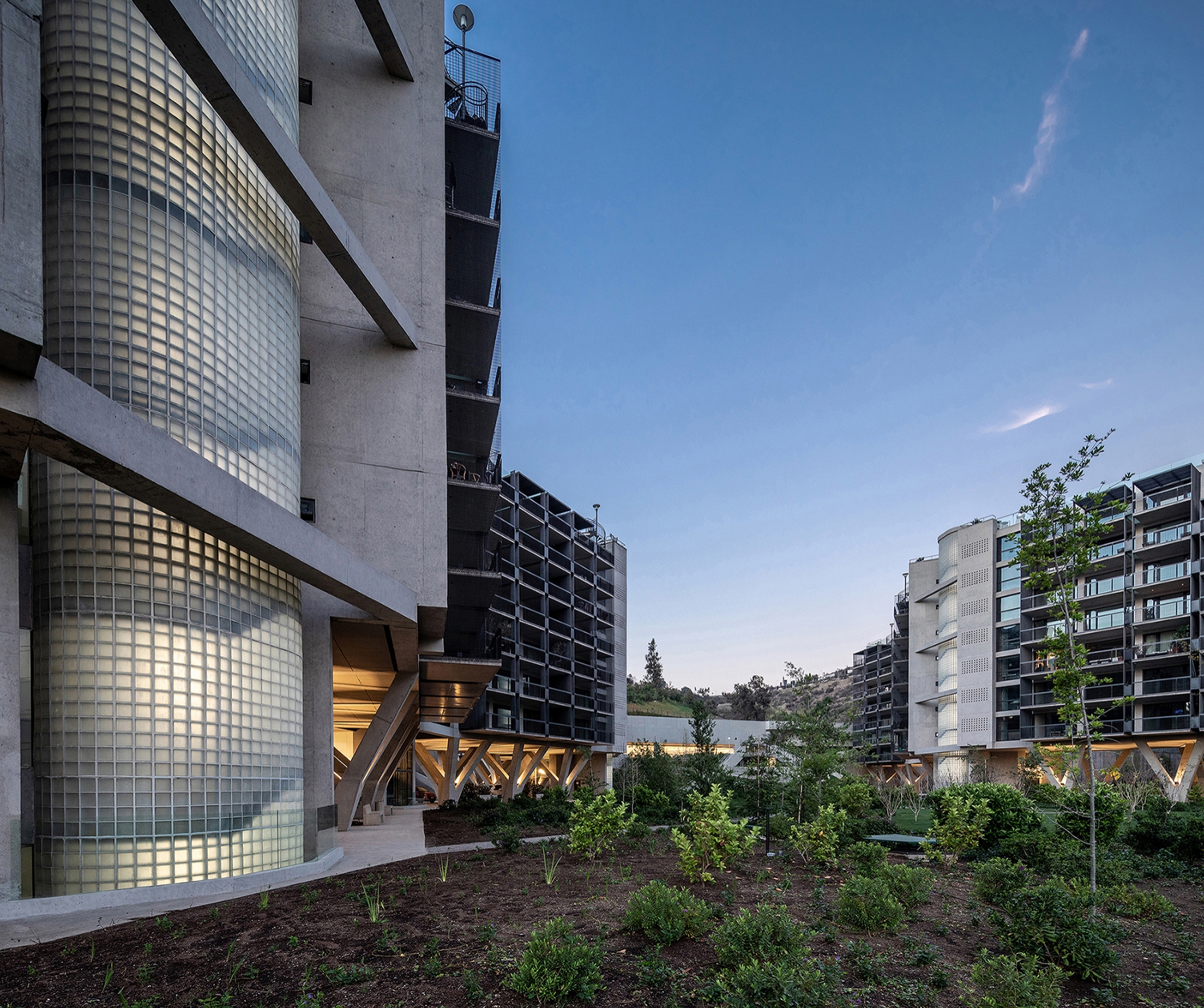 The most important space of the project is a doble height volume located under the buildings which is the access to the entrance halls, a parking and a common space that connect the central park to exterior of the Project.