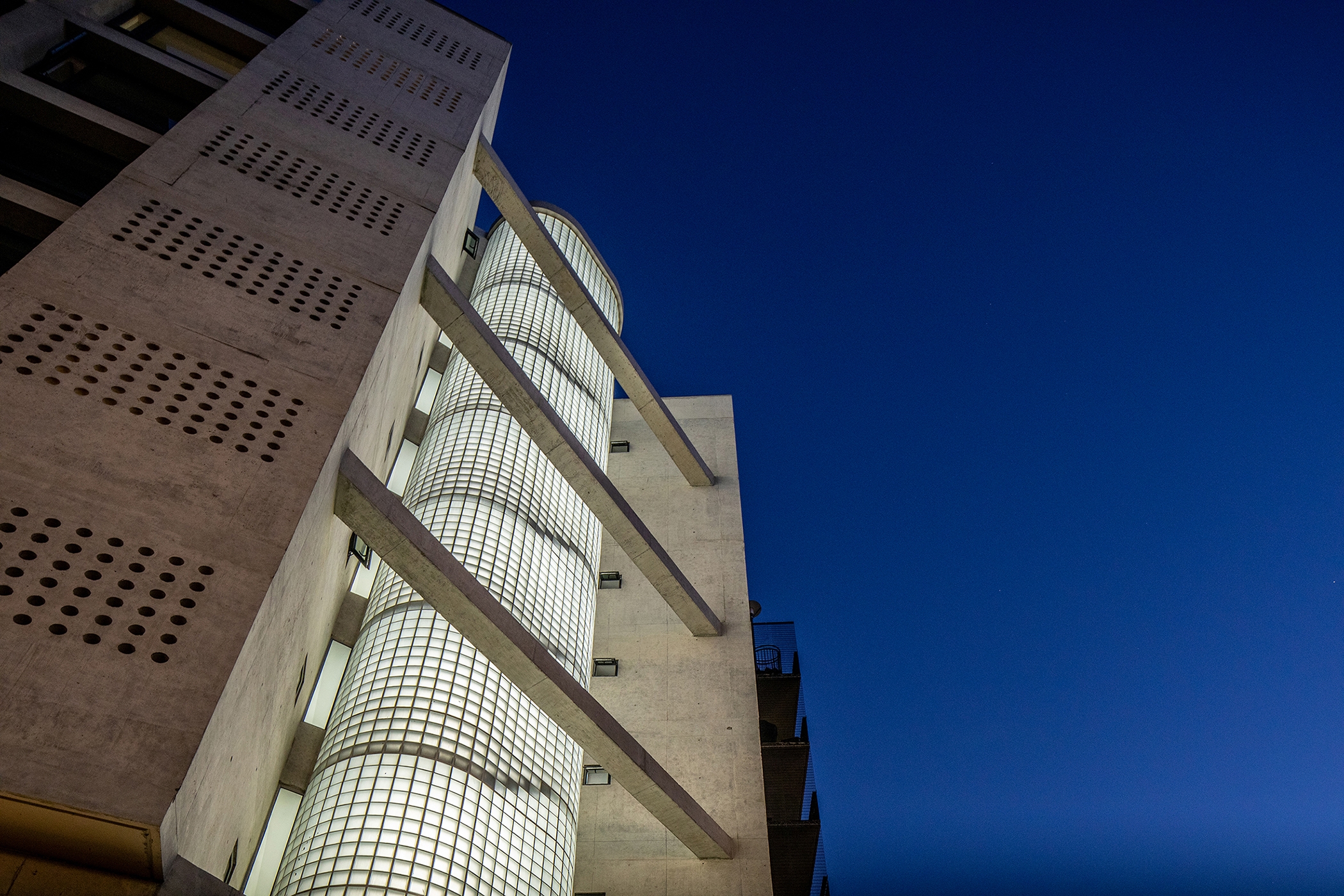 The functional lighting of the emergency stairs which are made of glass translucent elements was designed as to transform it in big vertical decorative lamps that create a rhythmic facade lighting.