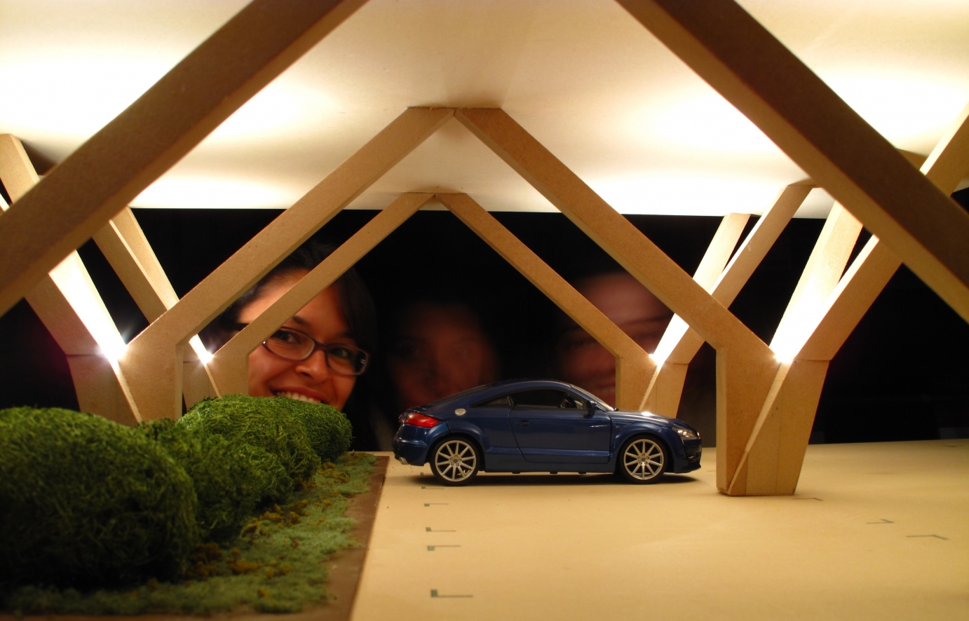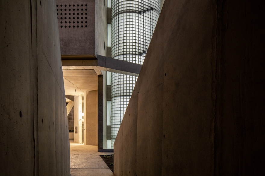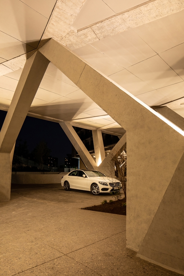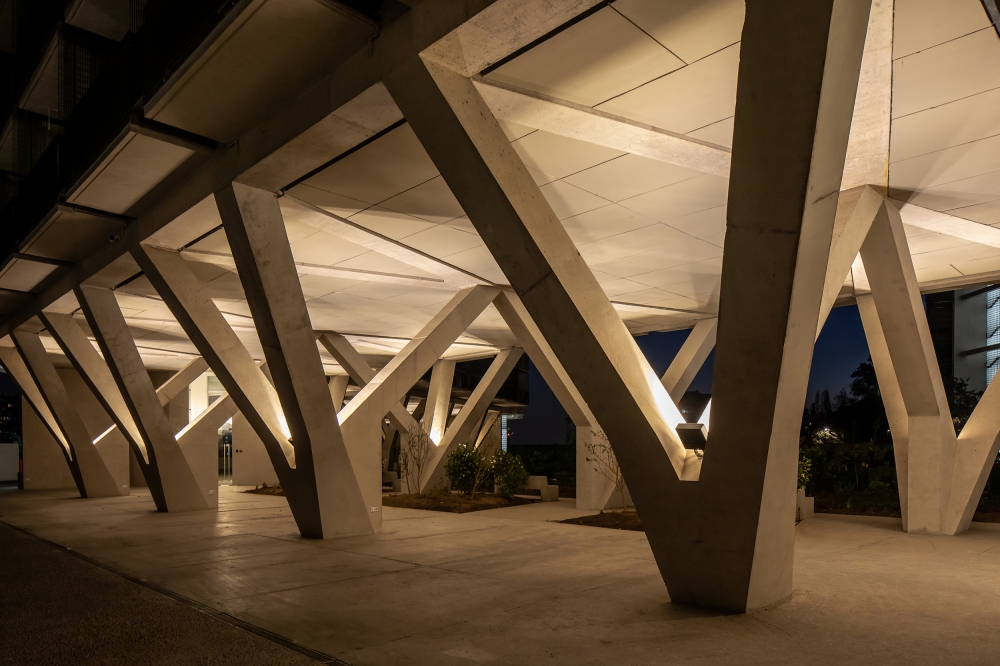 pillars sculptural form. This lighting system also allow to avoid lighting systems on both sides of the building as it give sufficient light level for circulation of pedestrians and vehicles.