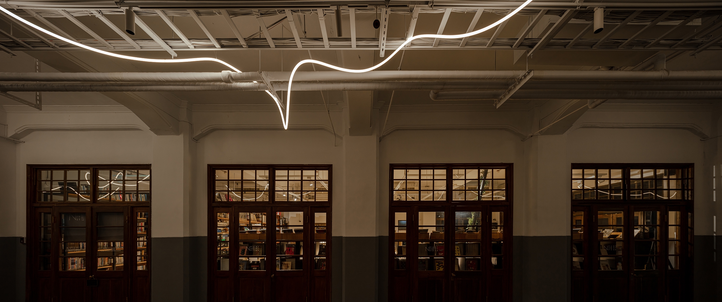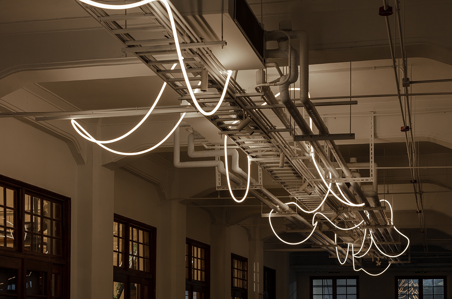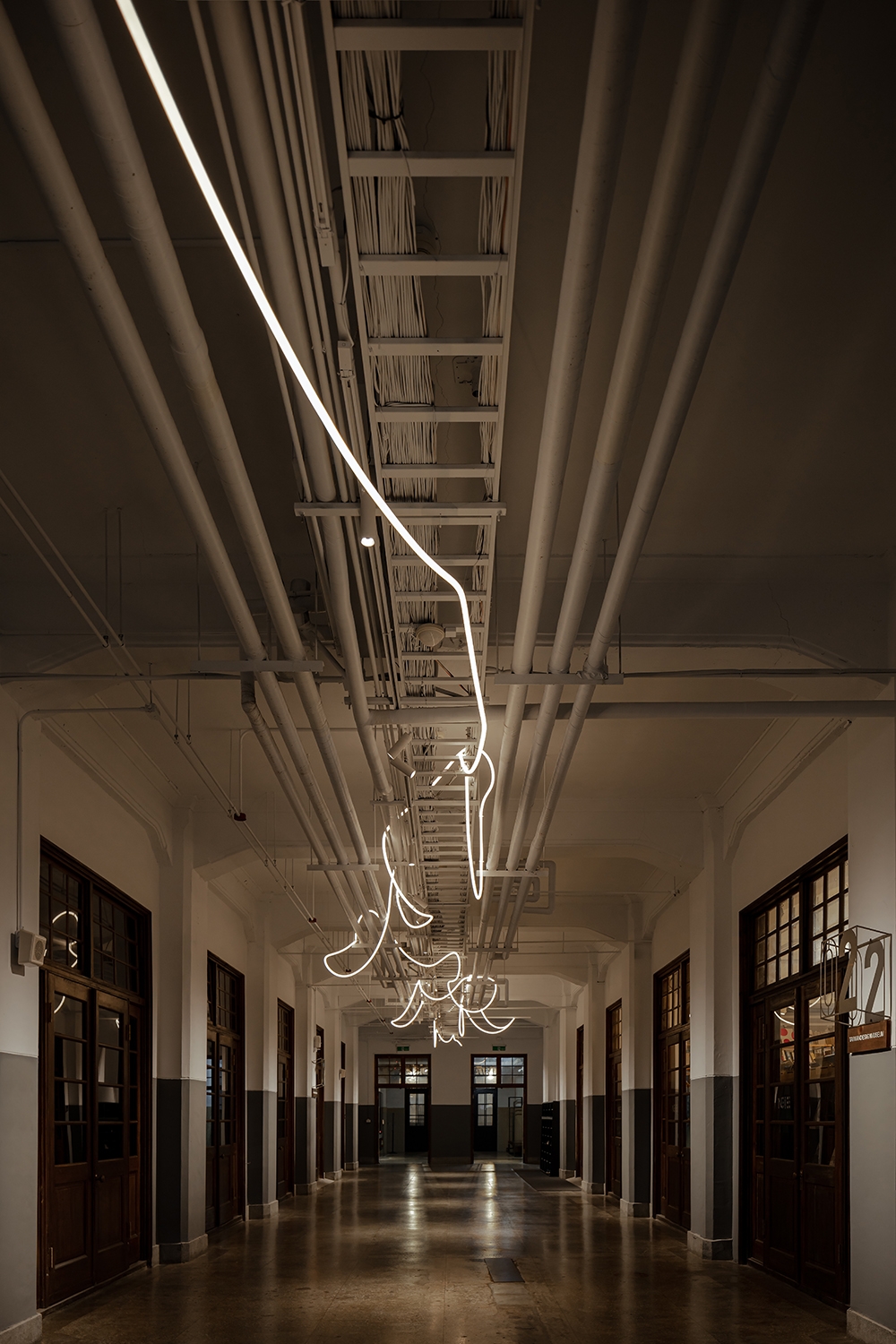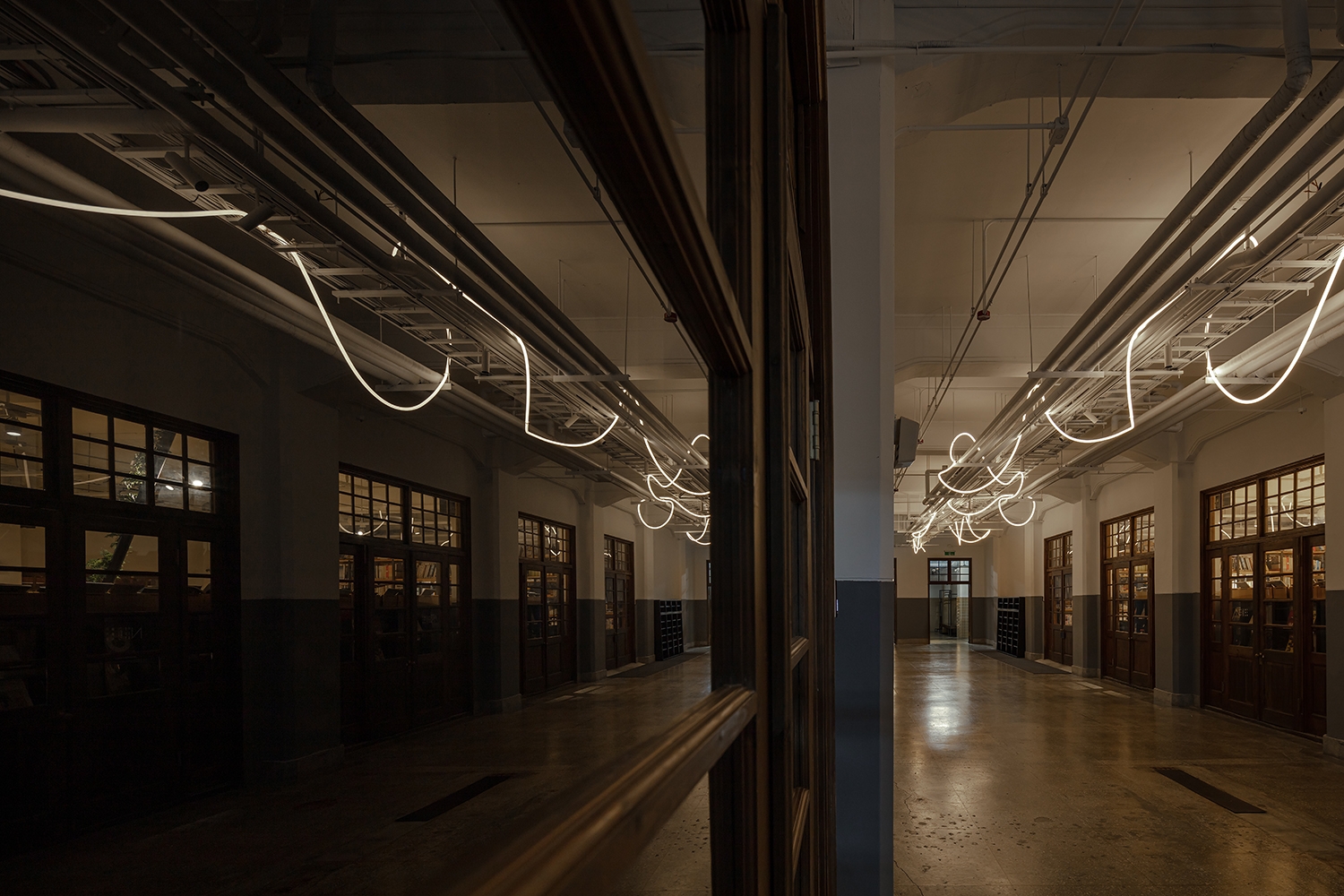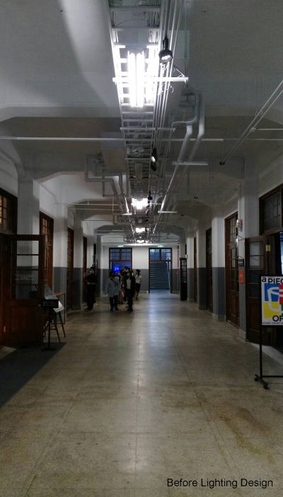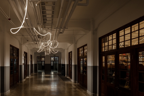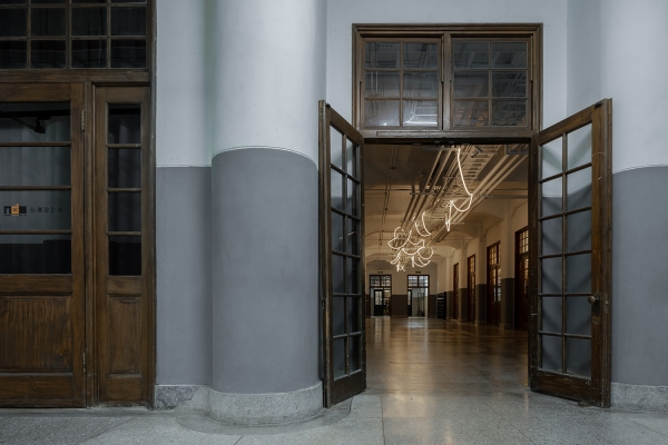 The new lighting design uses the track accent light to emphasize the columns on the two sides and the artistic creation of light bars to be playing of brilliants. This drift freely light bars which treats the corridor as a memory space that travels through time and space, carries the dialogue between the old building and the new art creation through continuous light.