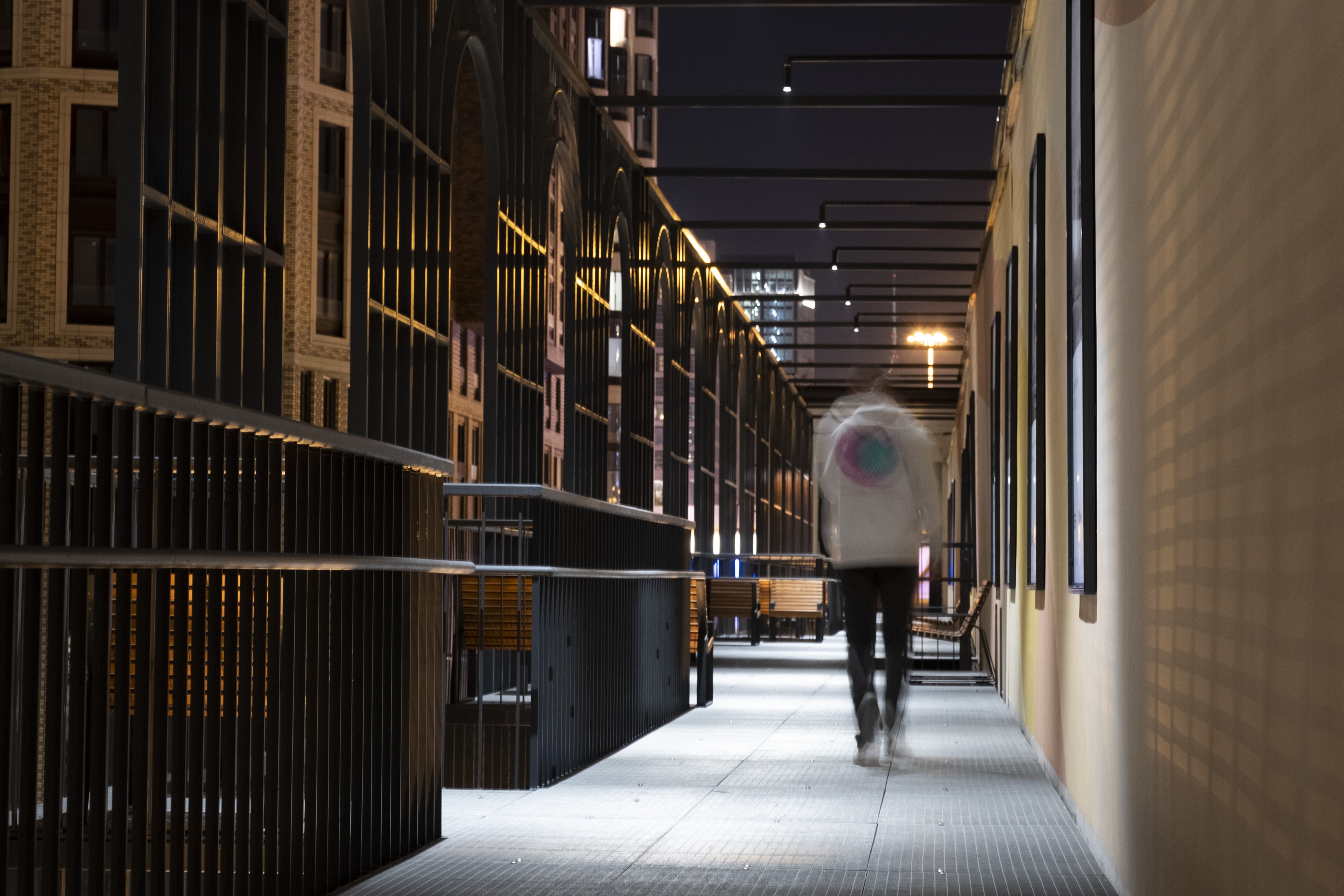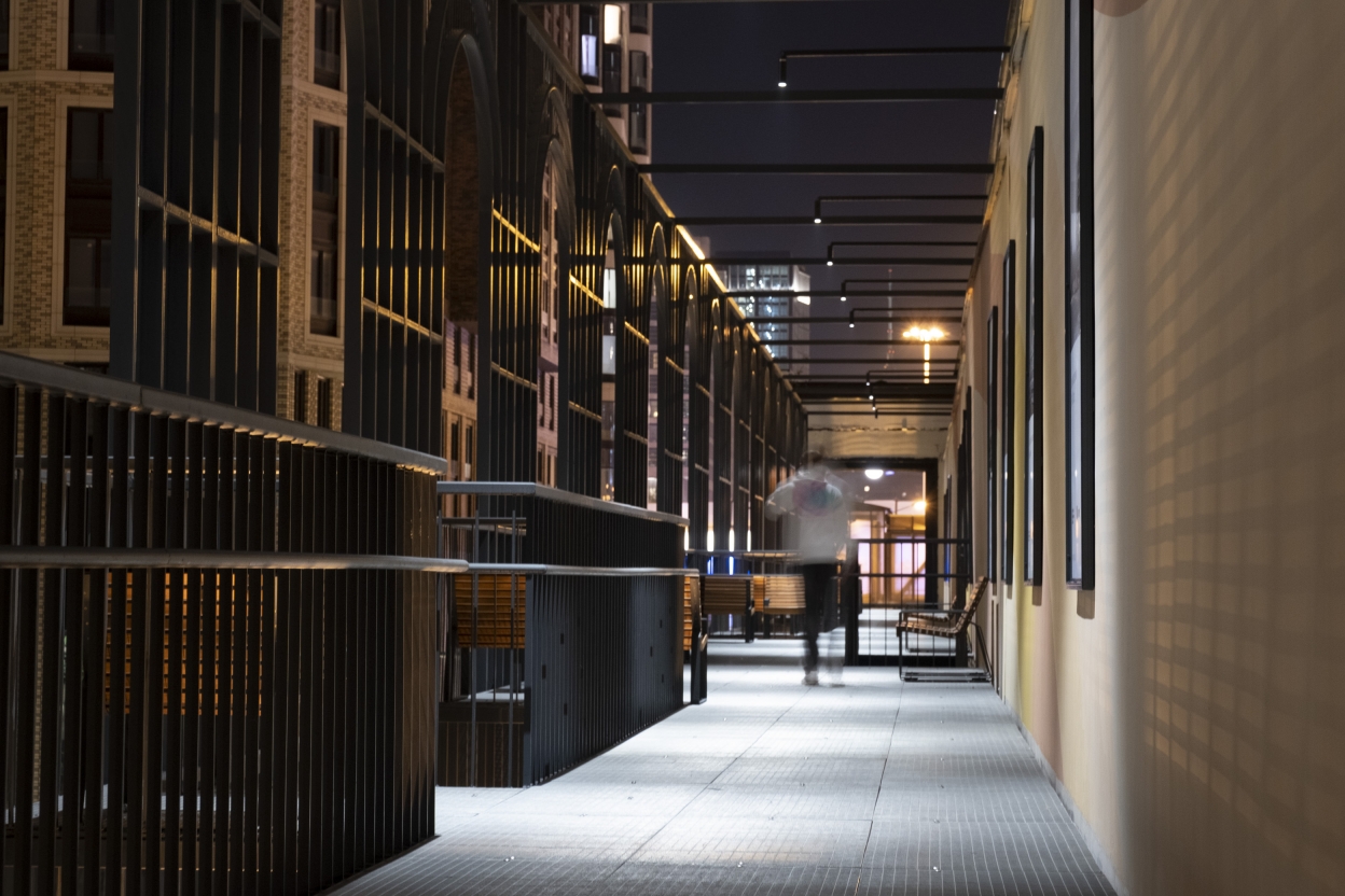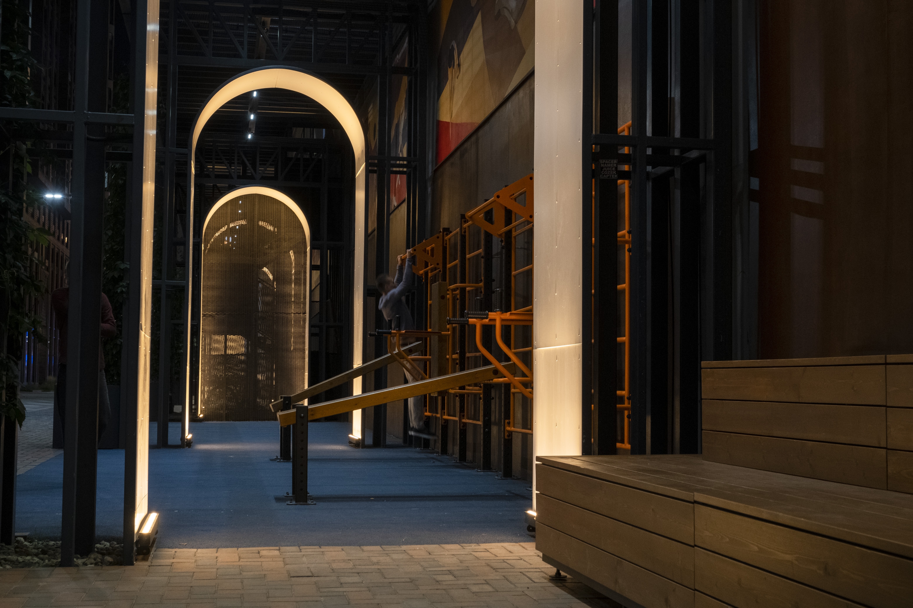 The project of reconstruction and improvement of the wall of the Stadium of Young Pioneers was made in 2019. The architects came up with to make the wall a pedestrian gallery with an exhibition about the history of the Young Pioneers Stadium, a sports gym, bouldering wall, outdoor Seating and children's games. We tried to make the lighting create a pleasant atmosphere, be decorative and functional at the same time, emphasize architectural solutions, pay attention to historical details.