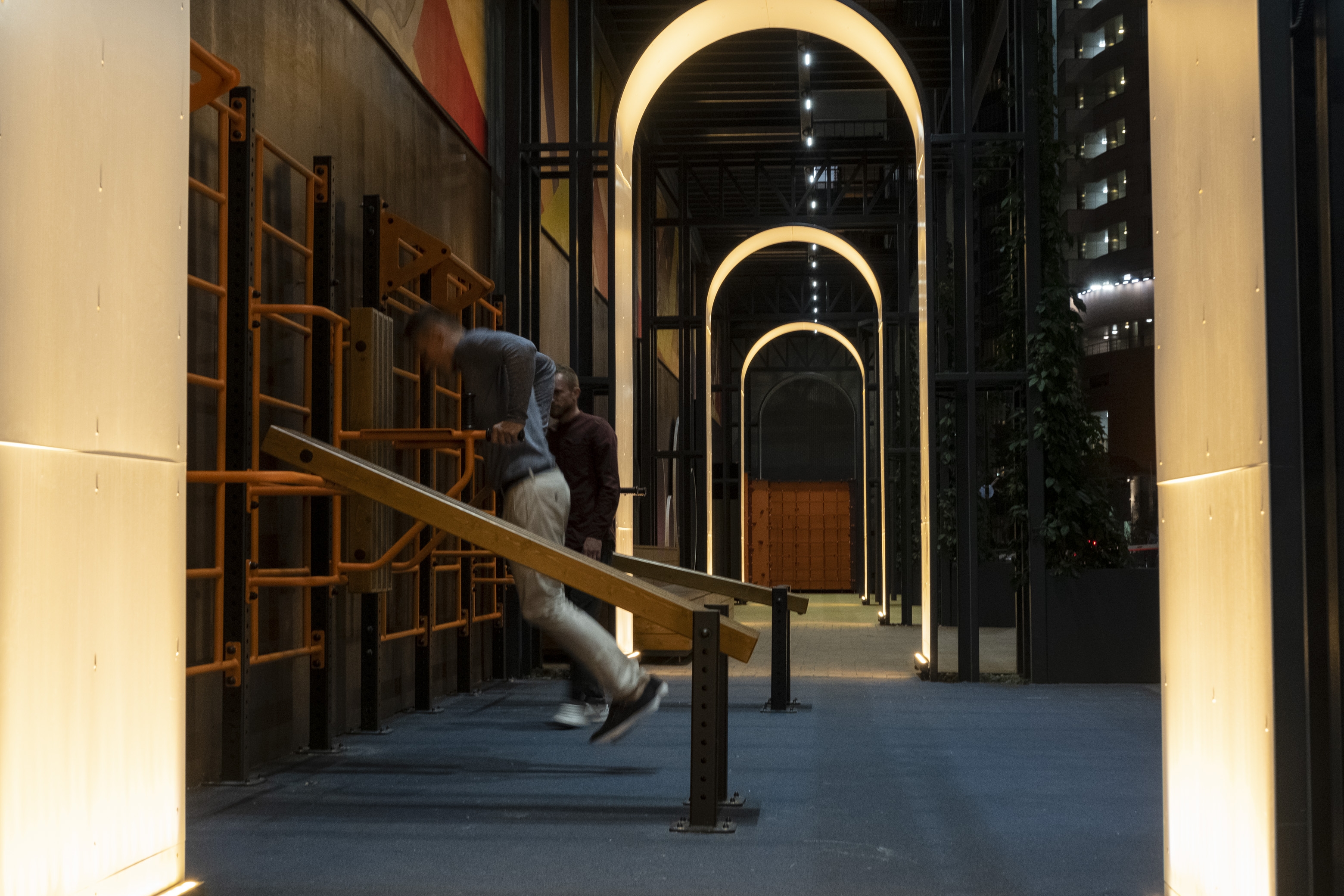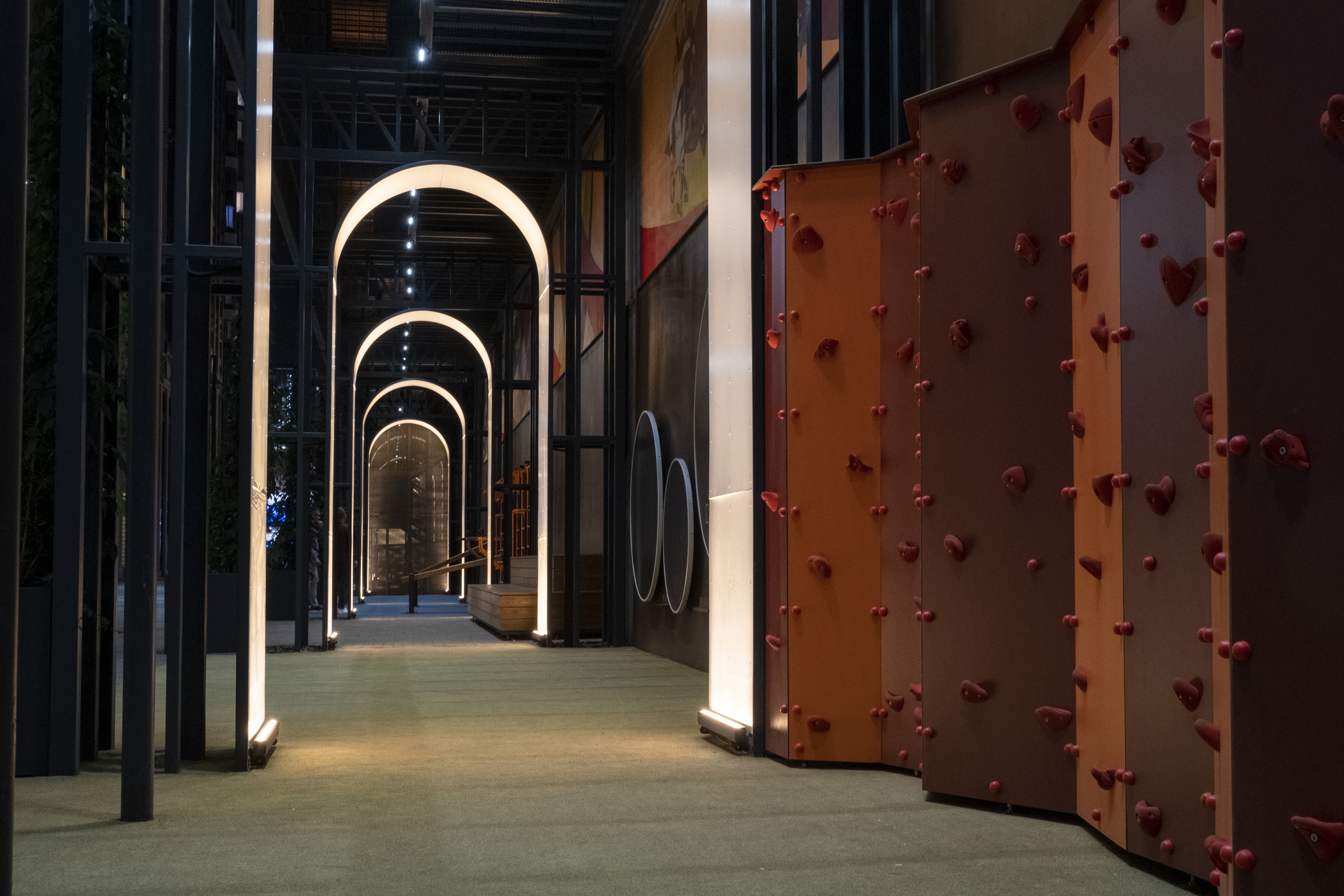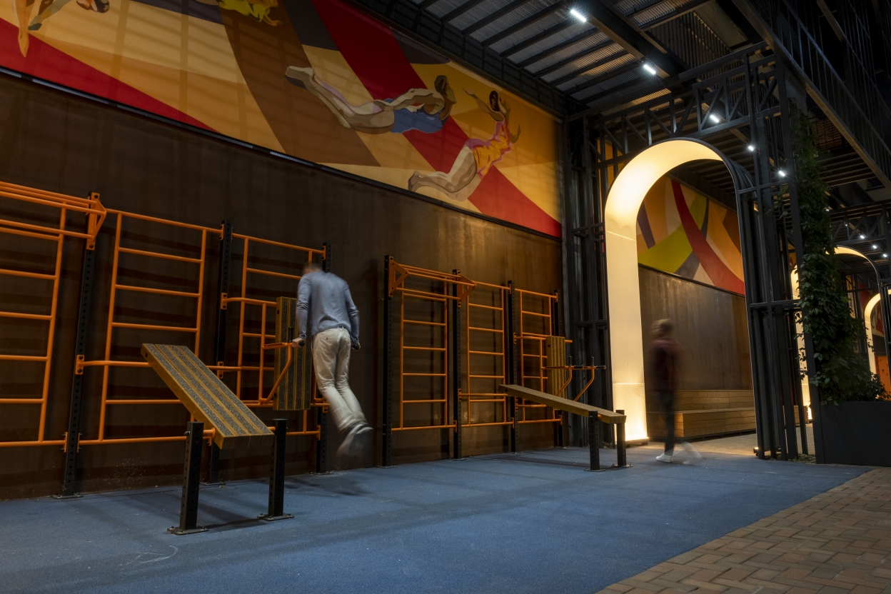The project of reconstruction and improvement of the wall of the Stadium of Young Pioneers was made in 2019. The architects came up with to make the wall a pedestrian gallery with an exhibition about the history of the Young Pioneers Stadium, a sports gym, bouldering wall, outdoor Seating and children's games. We tried to make the lighting create a pleasant atmosphere, be decorative and functional at the same time, emphasize architectural solutions, pay attention to historical details.