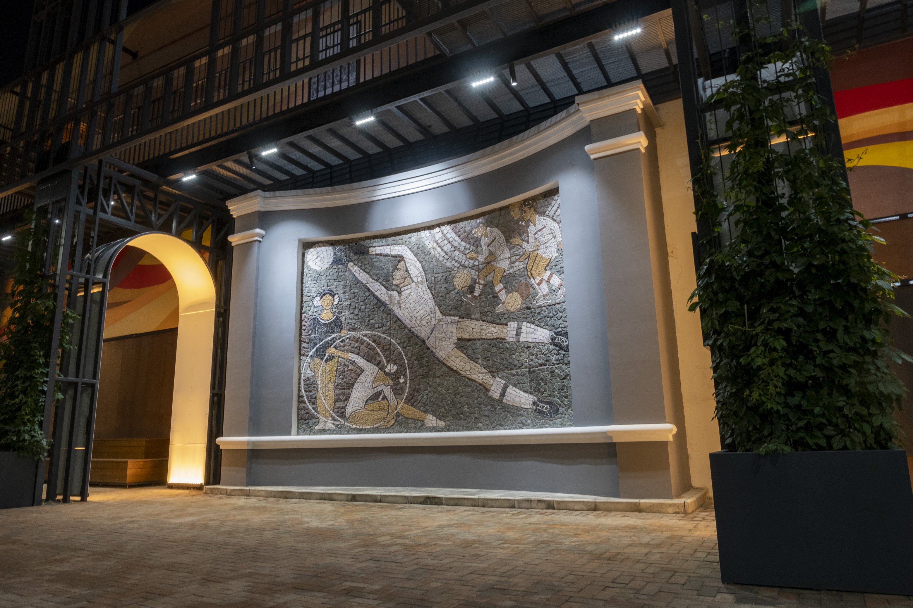 In 1946, a new metal fence was built for the stadium, designed by architect Yuri Shchuko. In the corners of the fence, rounded stone niches for mosaics were built, in which unique mosaic panels were placed in 1964.
