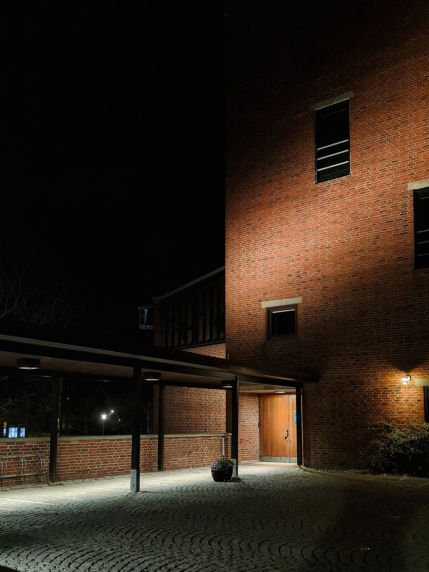 Elsewhere, the existing ’Albertslund’ luminaires were renovated with modern light sources and linear LED was built into wooden railings beside steps from the parish hall to the park, the wooden canopy has been lit with a tight and precise oval lighting to the stone paving and light is warm, as in the rest of the lighting.