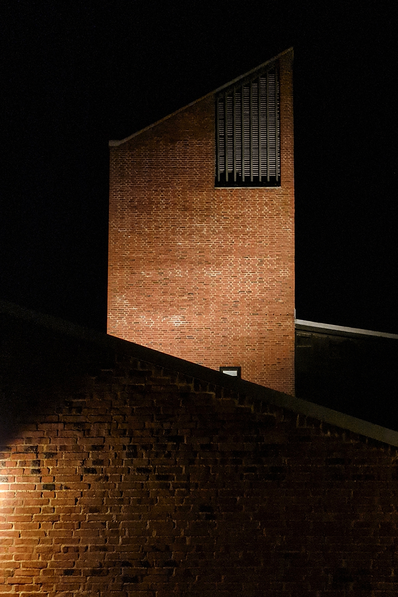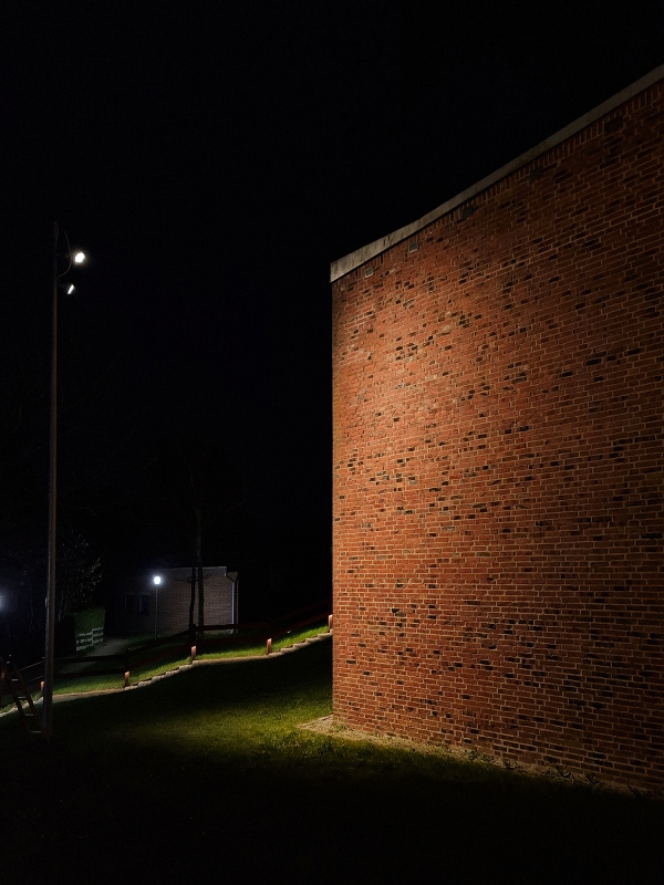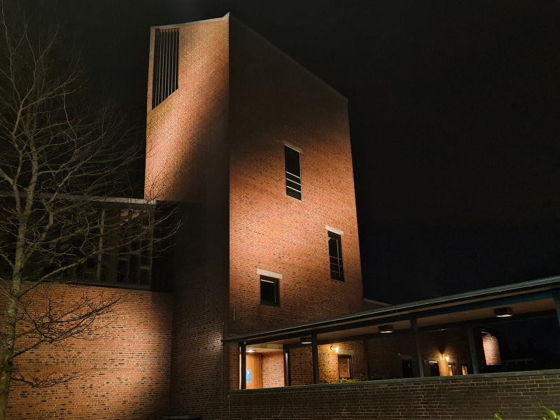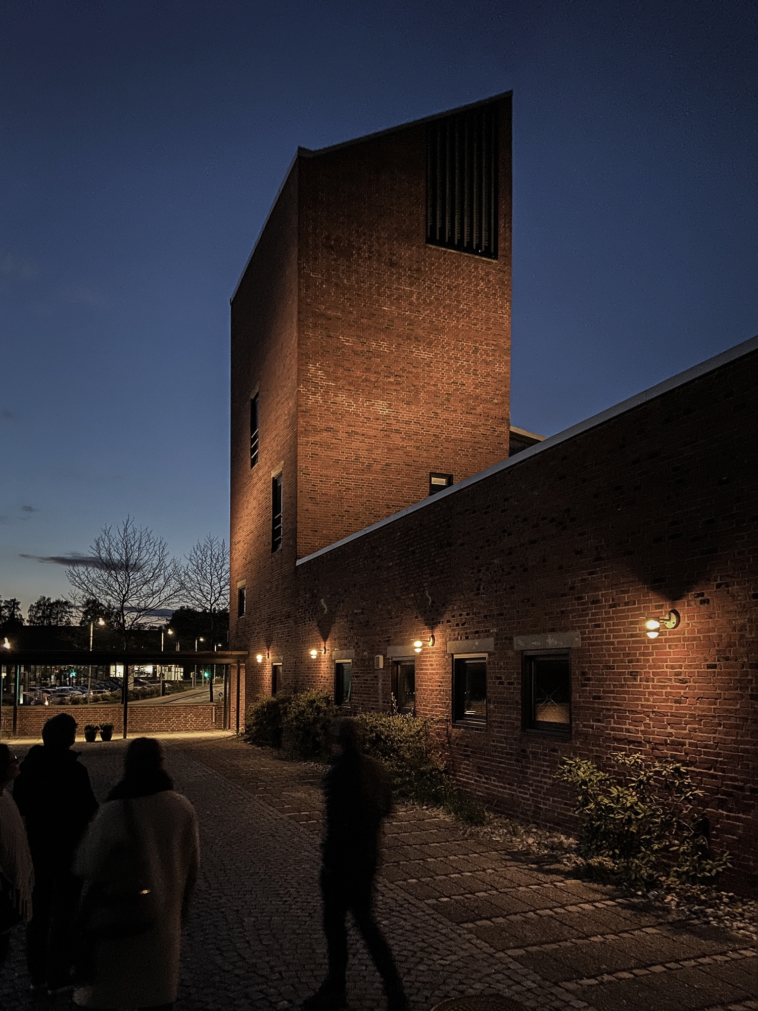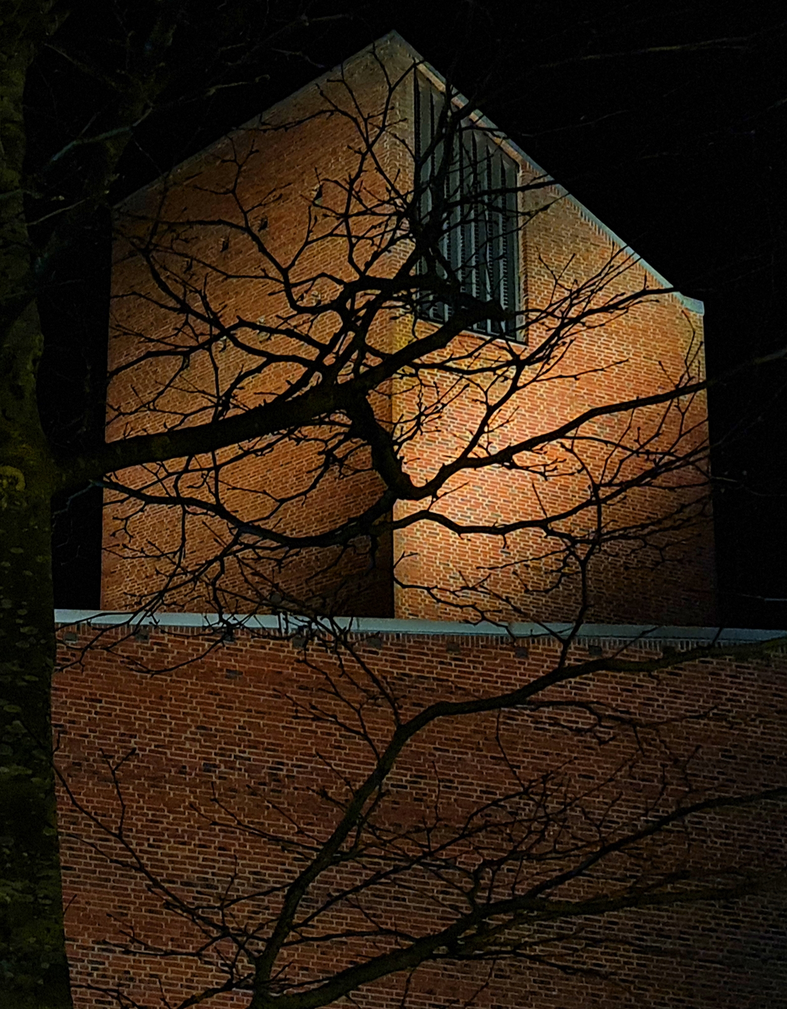 In daylight, the church has a dark, voluminous, silhouette. The brick is beautiful in its various shades of red. In the evening, this light-dark relationship inverts. The volume of appears softly lit in the twilight, creating visual tranquillity but also personal security around the church and in the park.