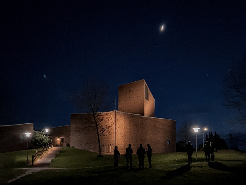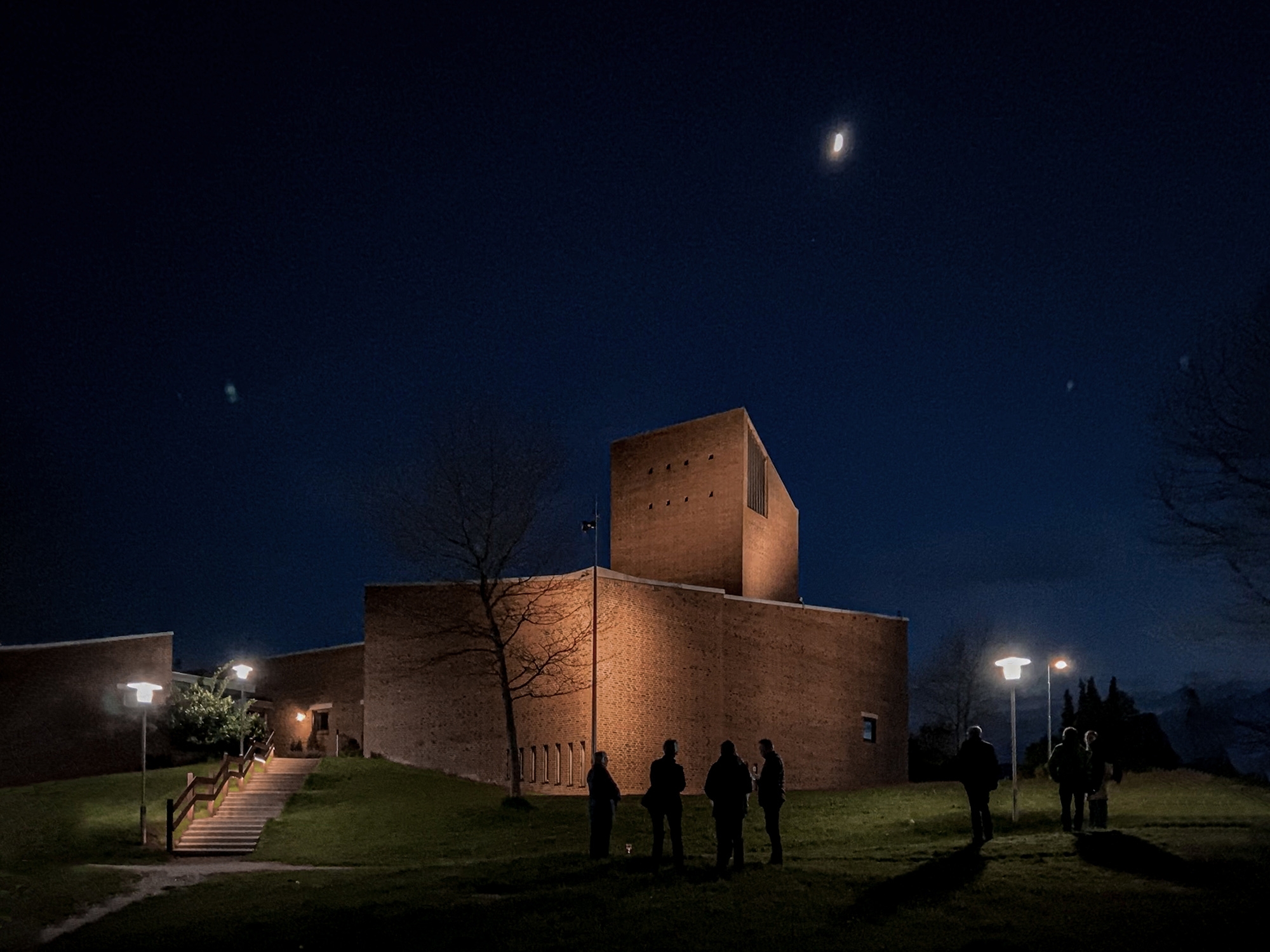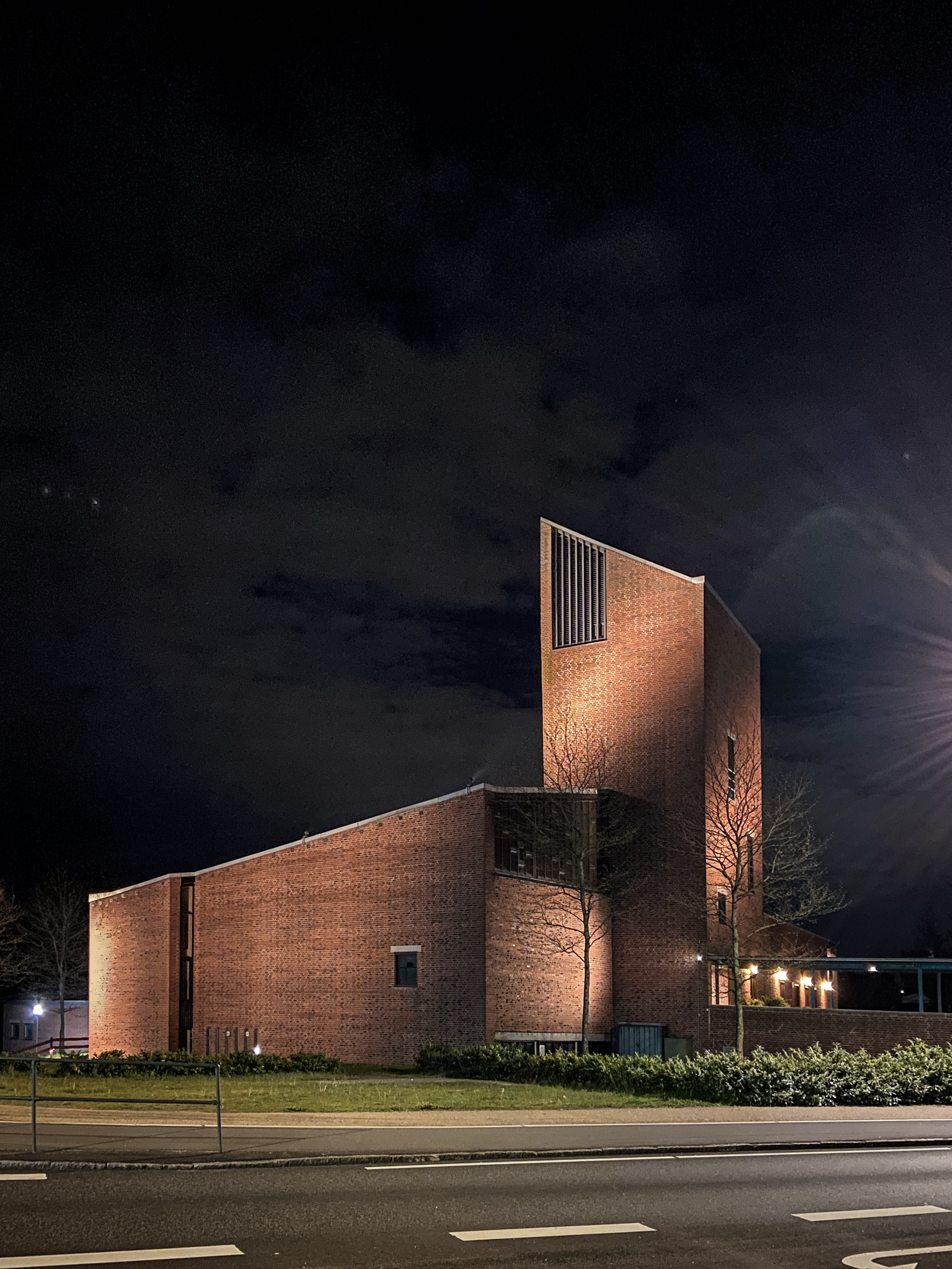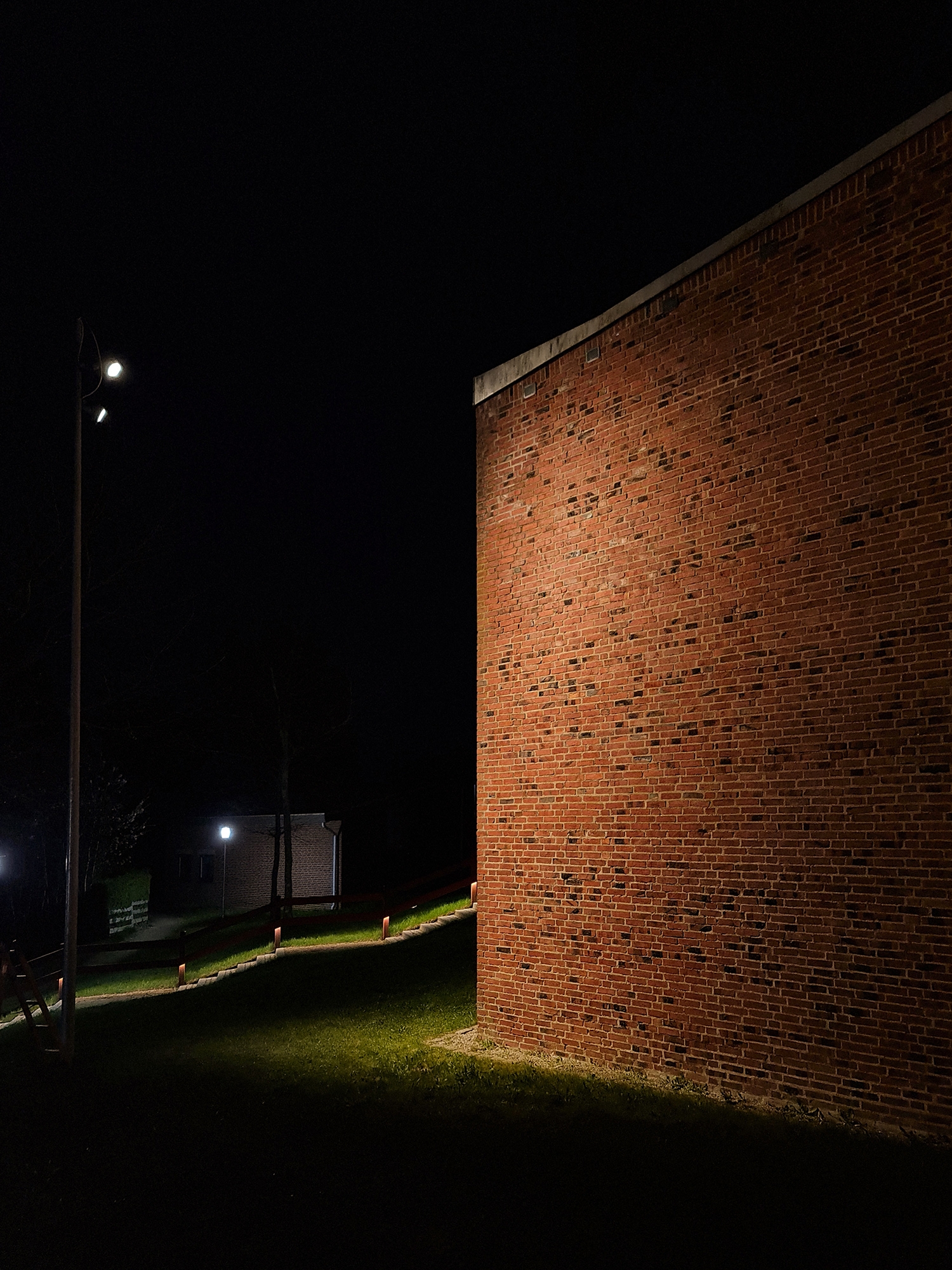 In daylight, the church has a dark, voluminous, silhouette. The brick is beautiful in its various shades of red. In the evening, this light-dark relationship inverts. The volume of appears softly lit in the twilight, creating visual tranquillity but also personal security around the church and in the park.